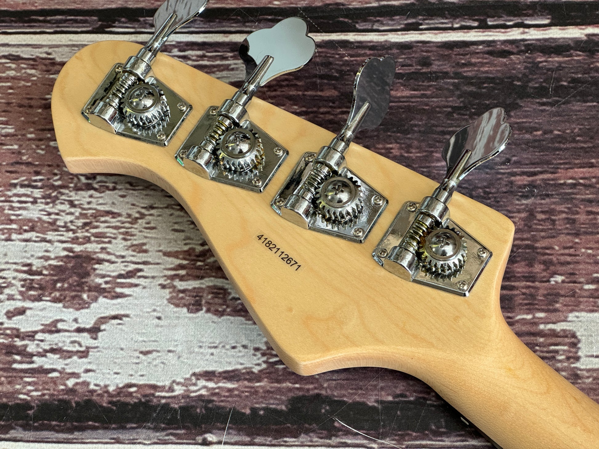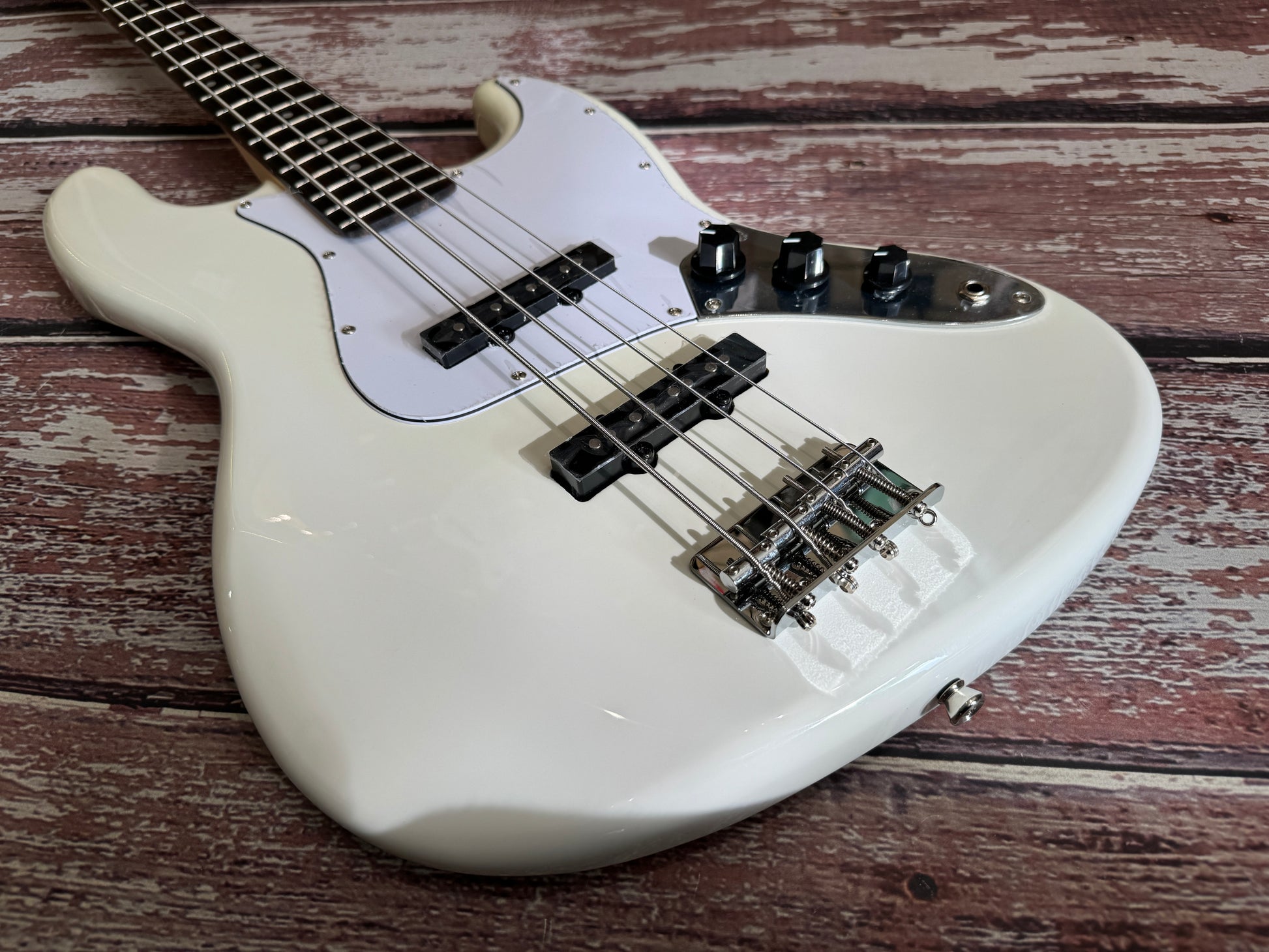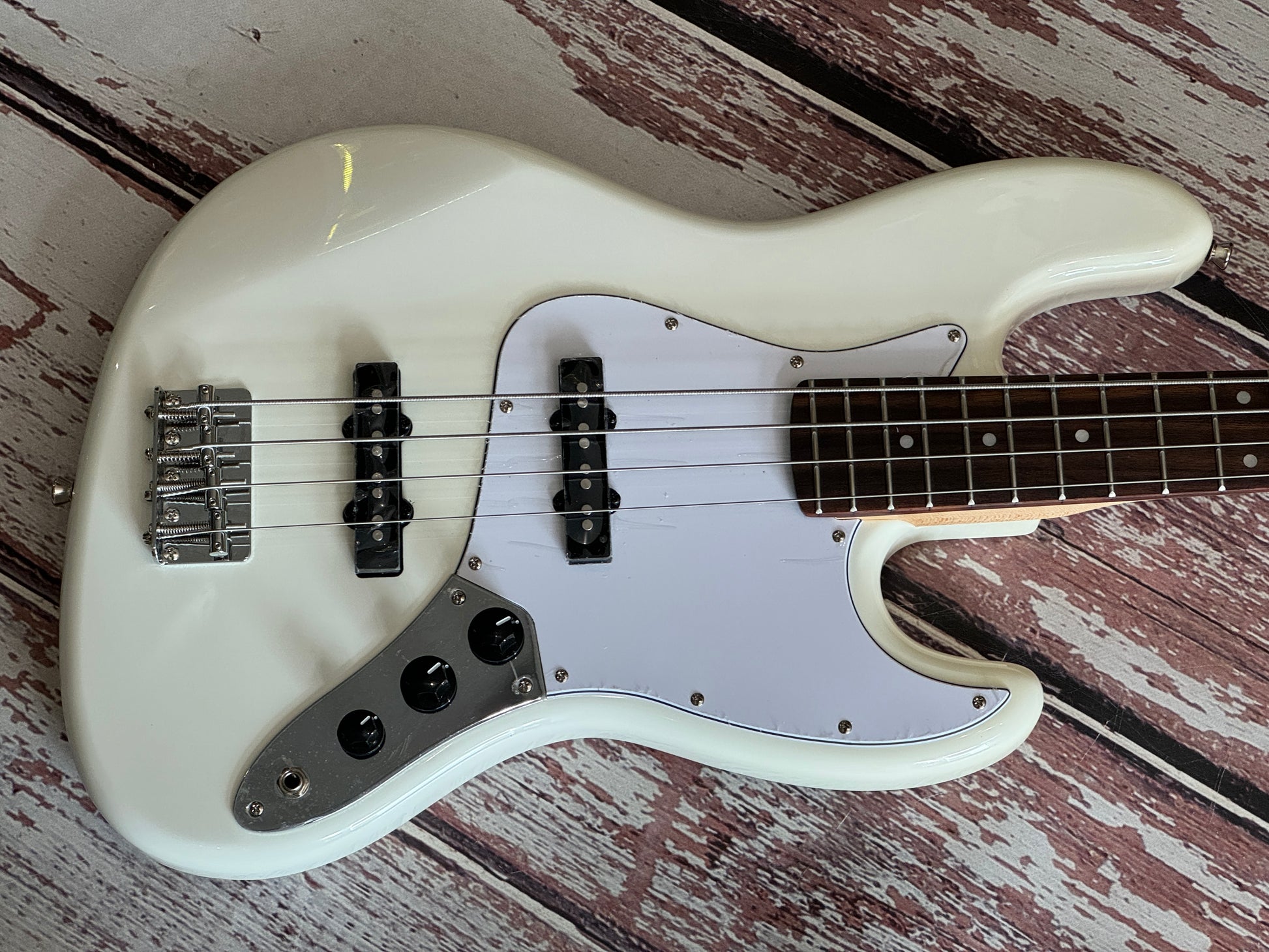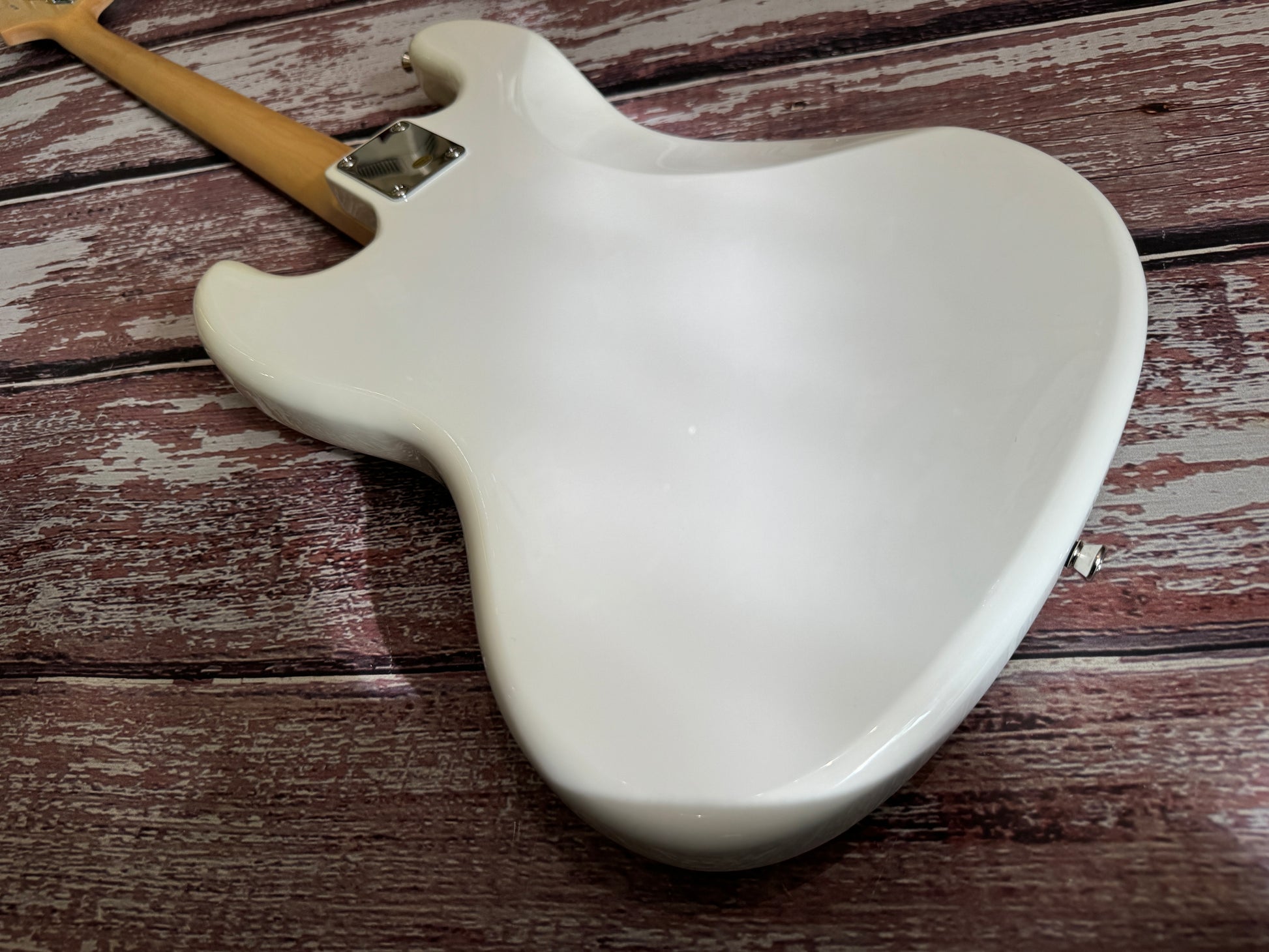 This one is the "J" style in classic vintage white with a rosewood neck, a pair of single coil pickups offer a wide tonal range perfect for the backing of any band.