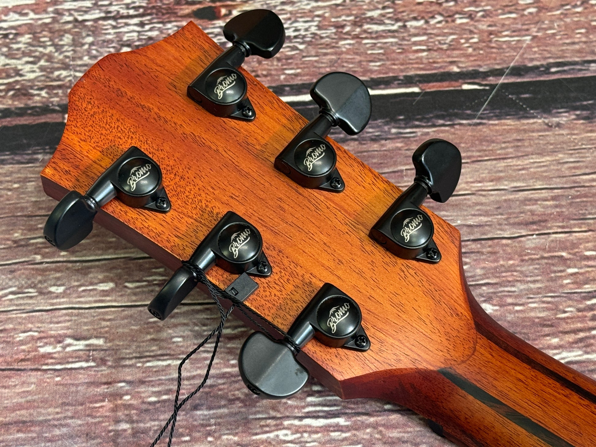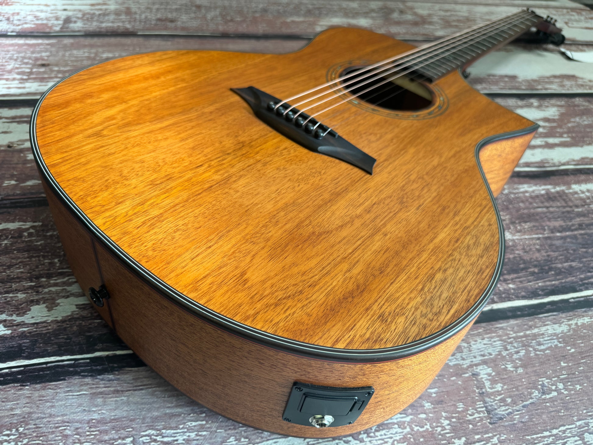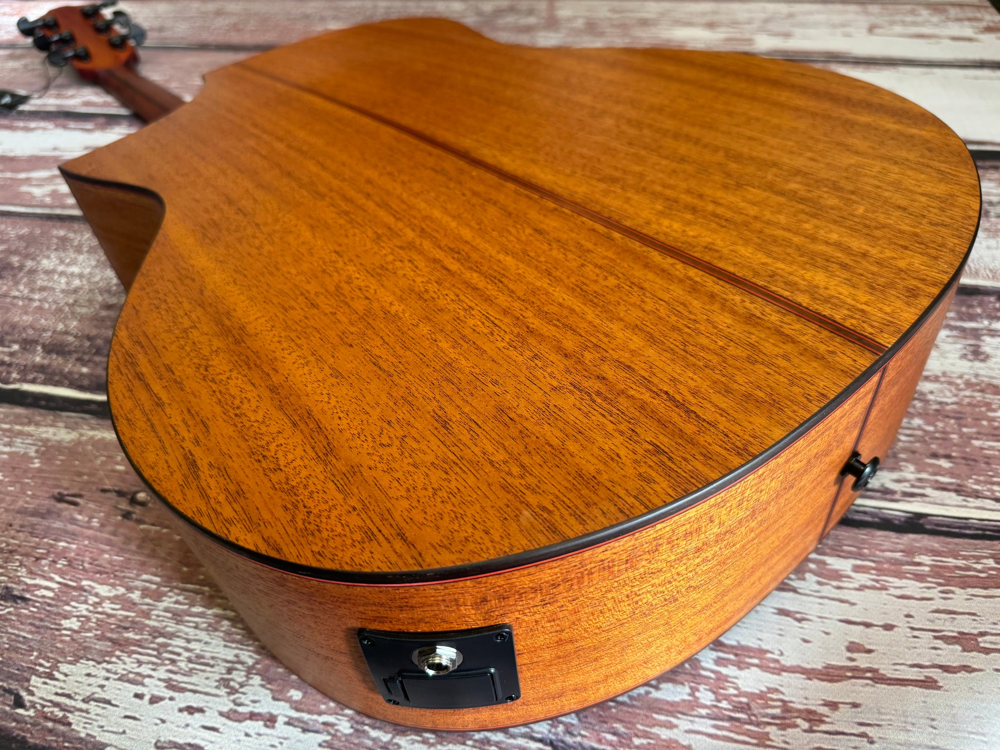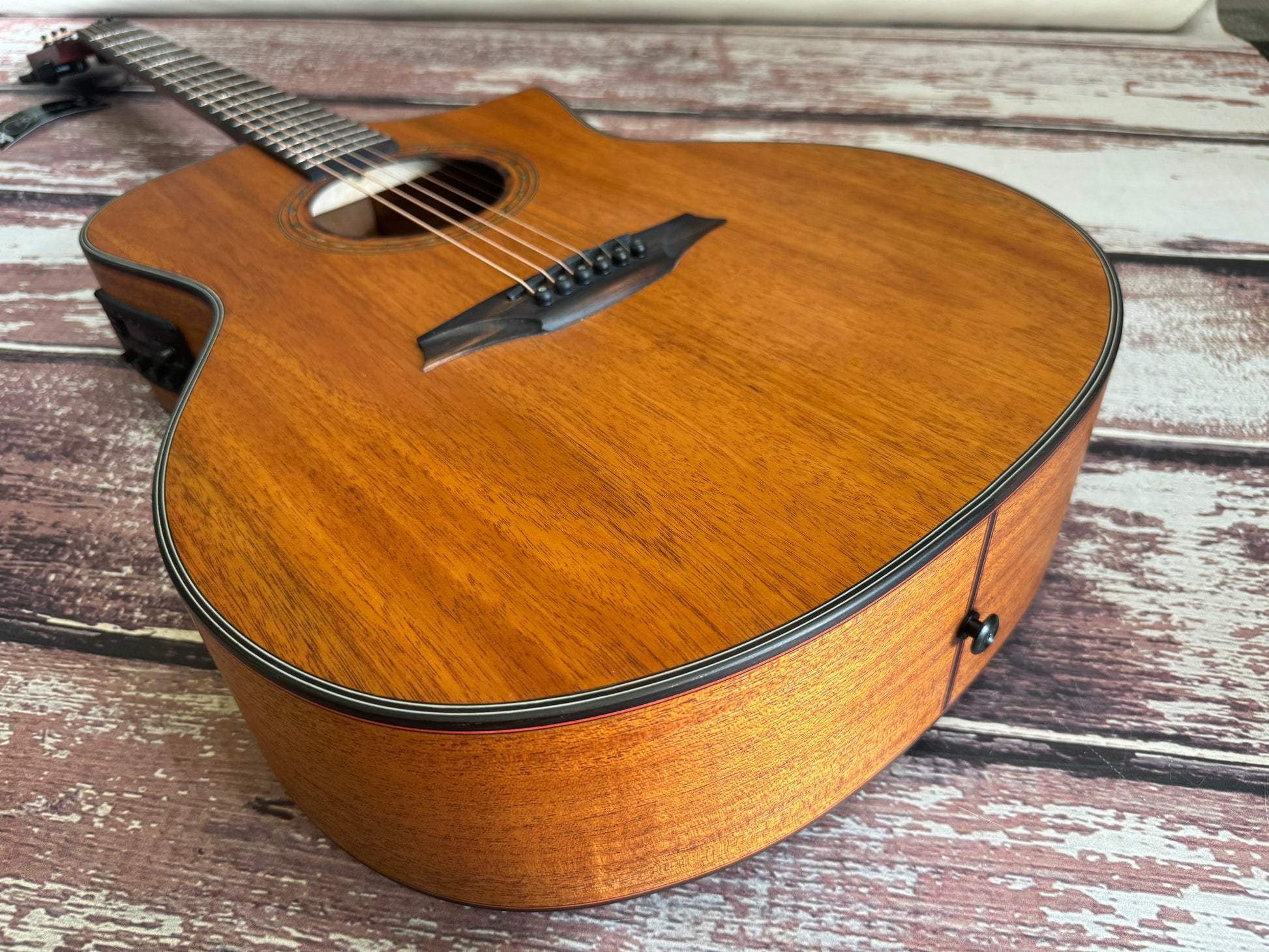 You get a solid mahogany top, great electrics with tuner, incredible attention to detail and finishing all over the guitar, just look closely at the inlays, binding, rosette, headstock and heel detail. This is usually something you will see on a premium end instrument.