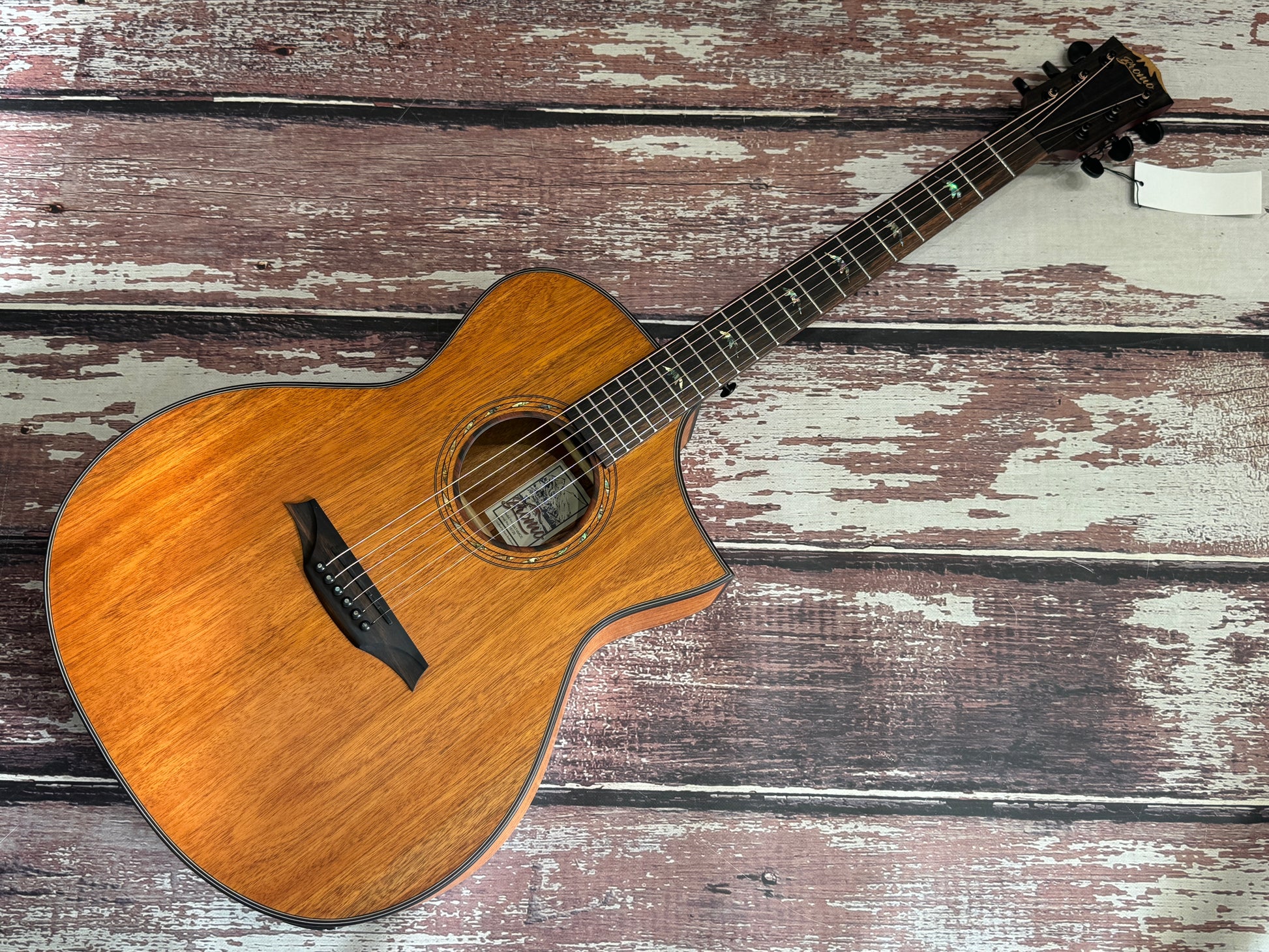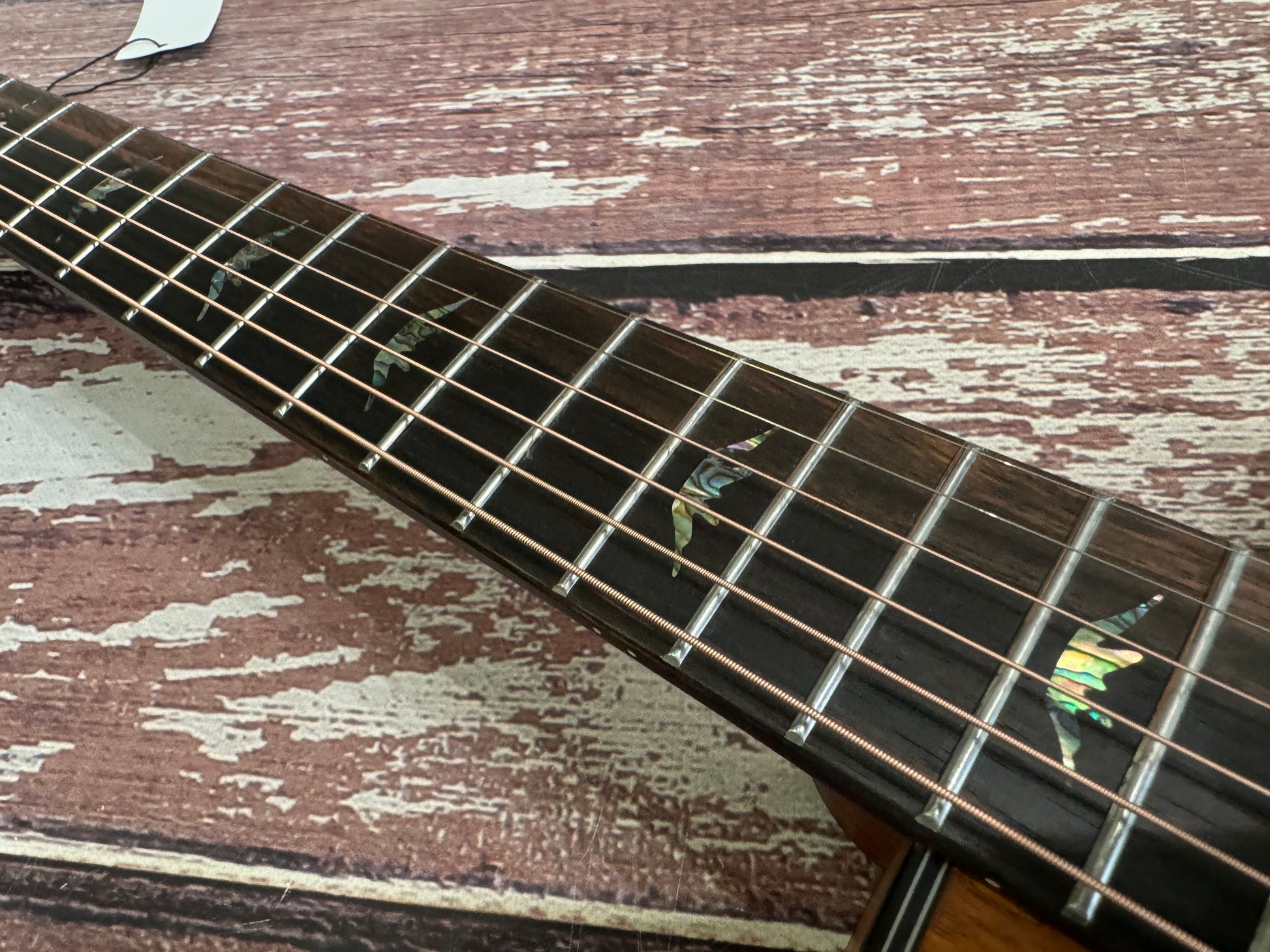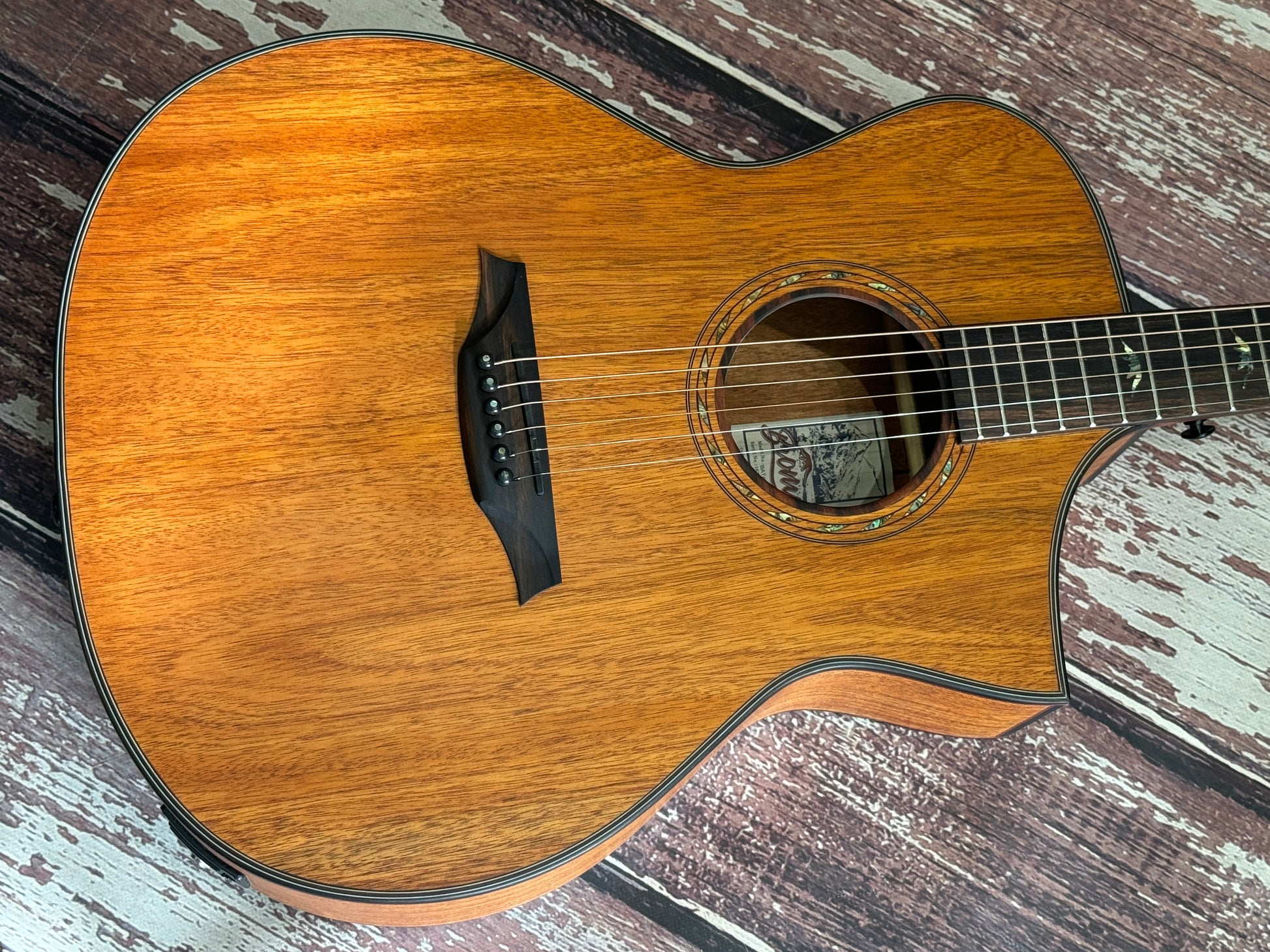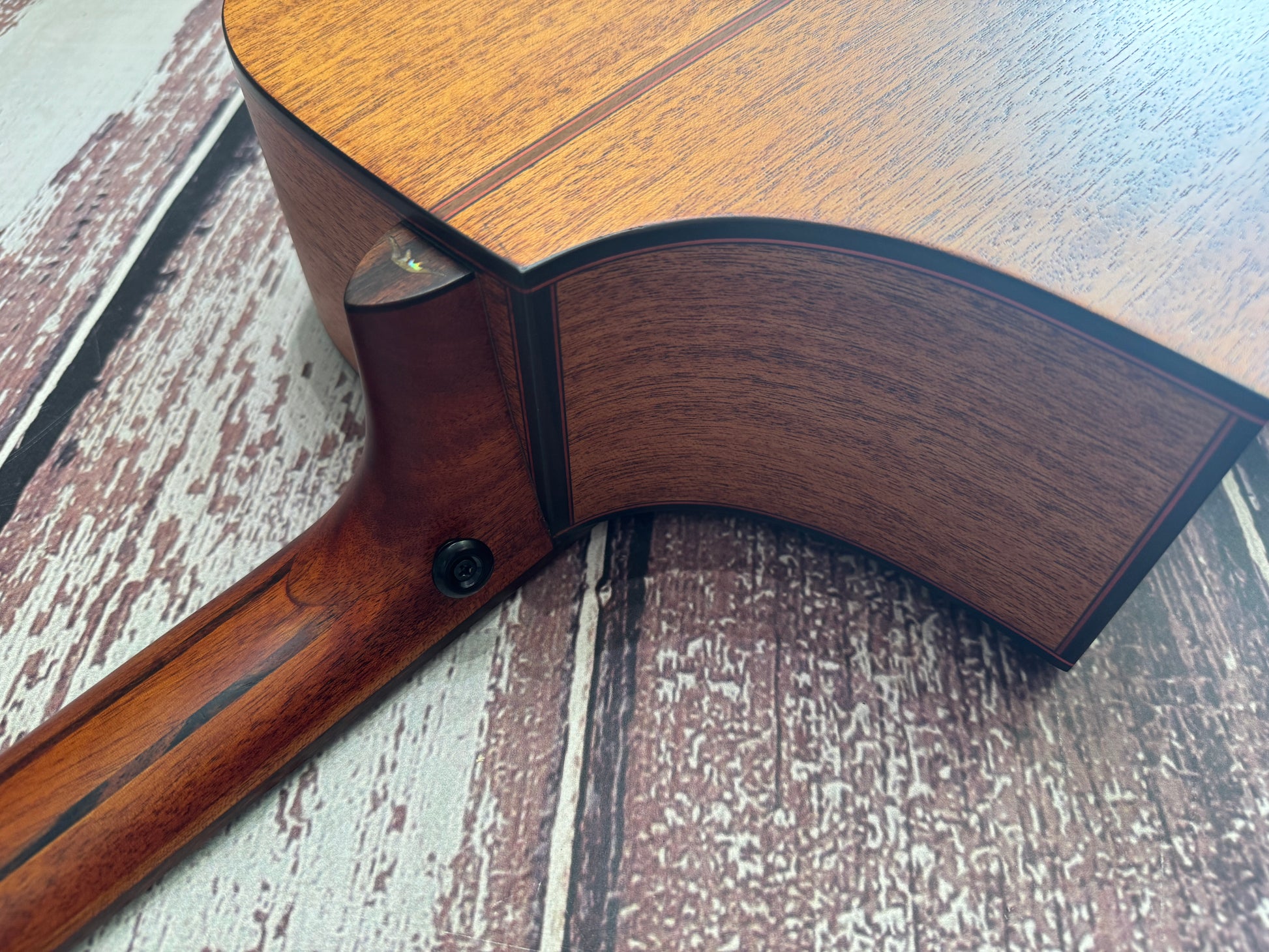 You get a solid mahogany top, great electrics with tuner, incredible attention to detail and finishing all over the guitar, just look closely at the inlays, binding, rosette, headstock and heel detail. This is usually something you will see on a premium end instrument.