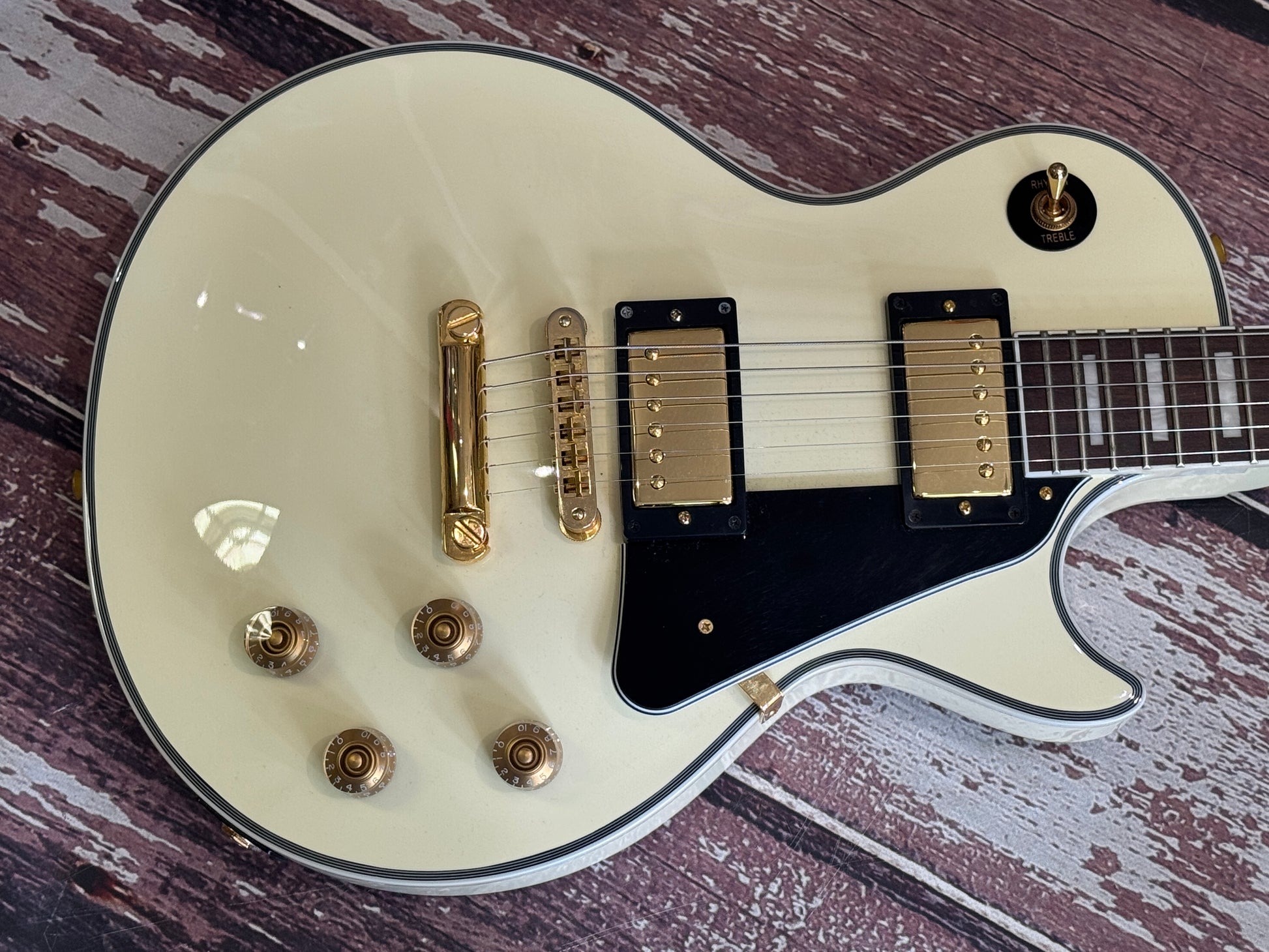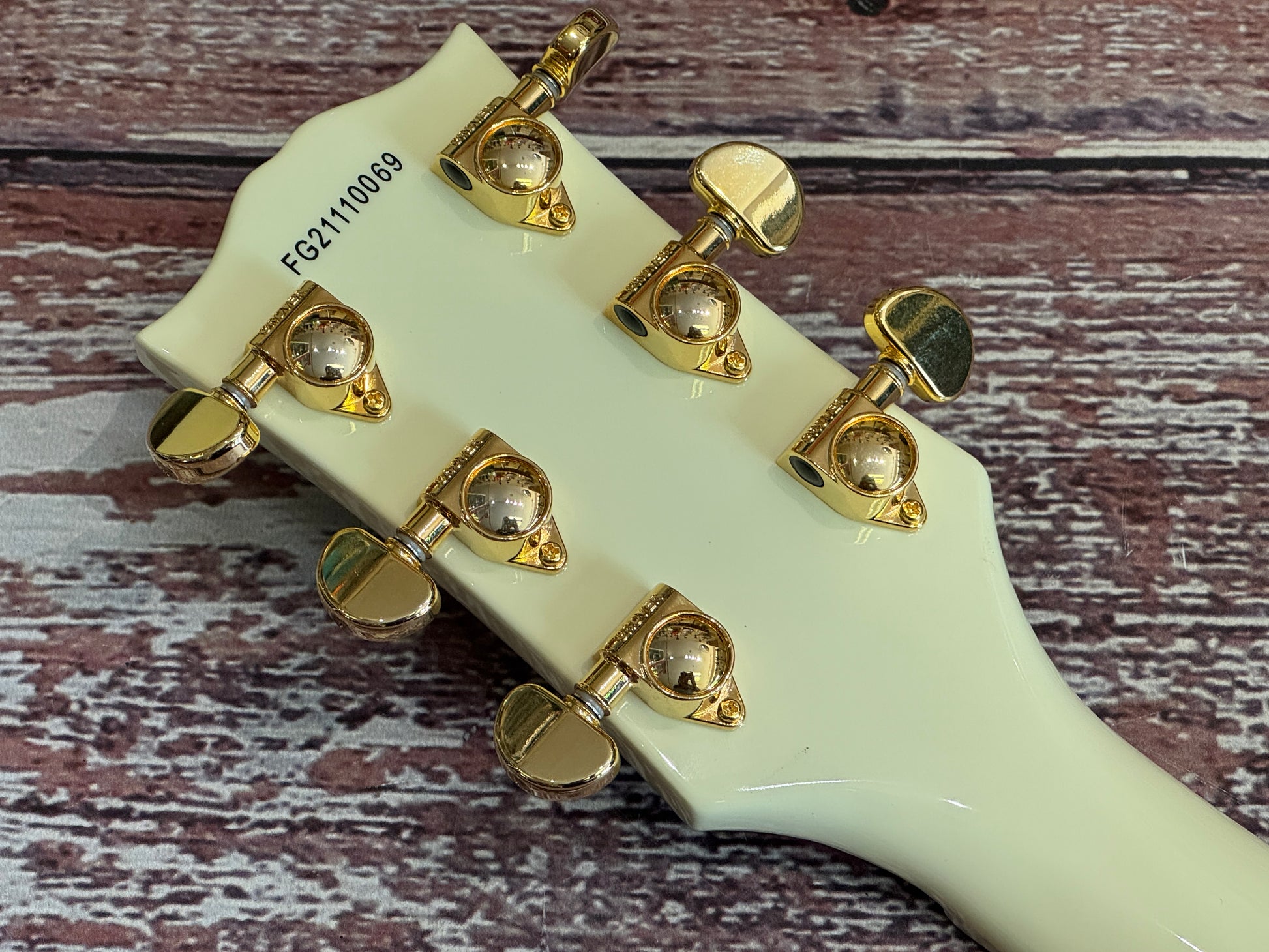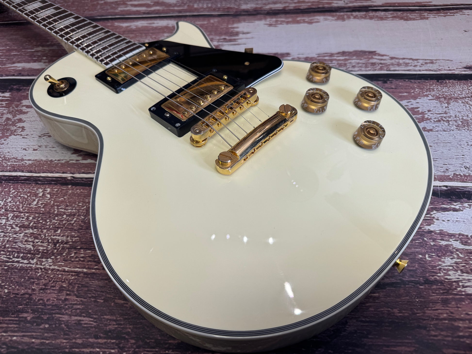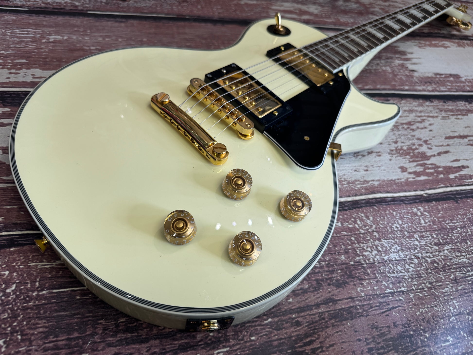 This one has had a set of gold Grovers fitted, one of the best tuner sets on the market. The overall condition is very tidy and all is working perfectly. The colour is exactly what you want to see on one of these, the white has faded down to a cream colour.