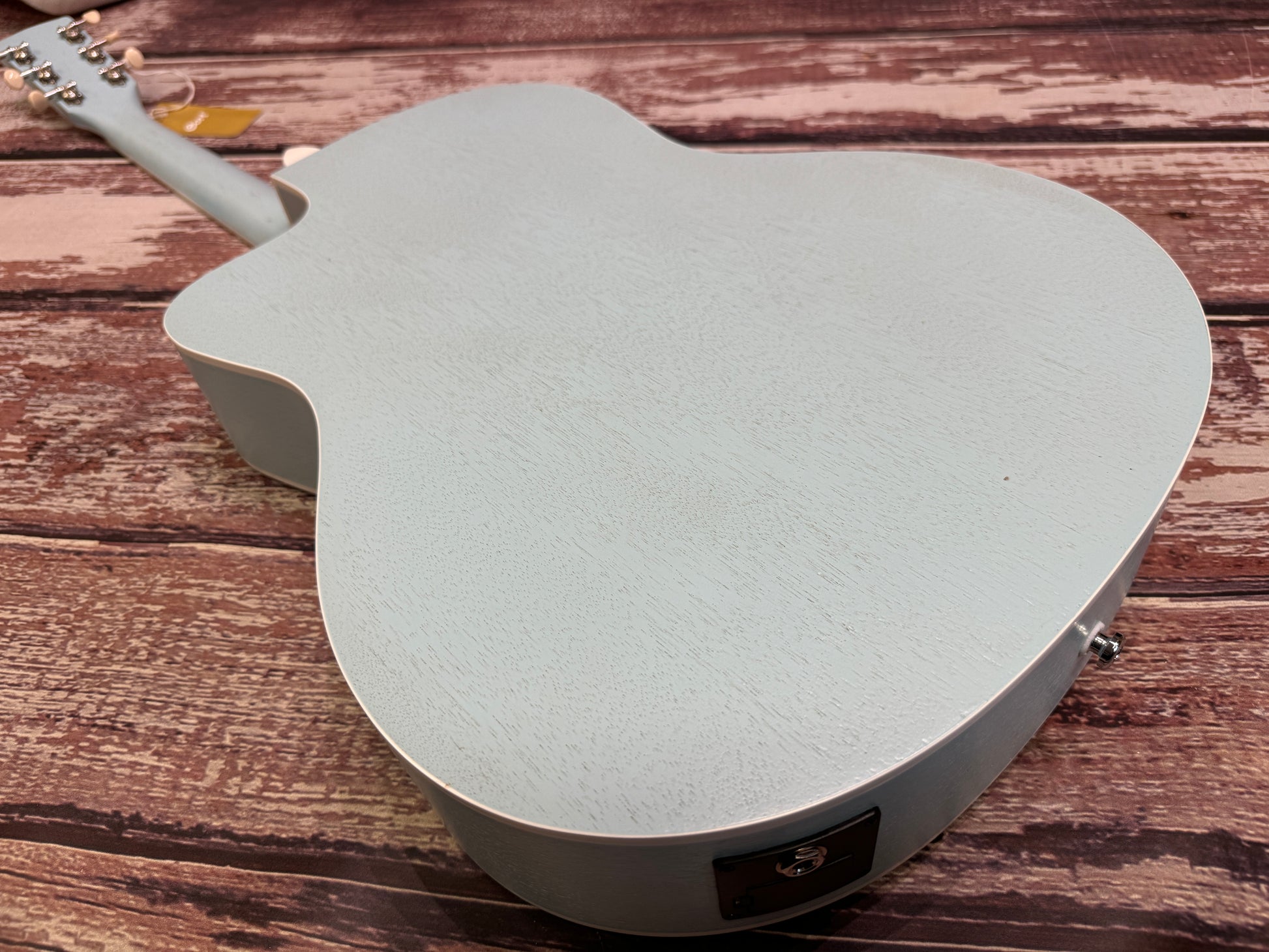 This is a sweet little electro acoustic in sky blue, with a cutaway for easy access to the high notes! It has Cort's own pickup and electrics loaded so it can be plugged in for studio or live work too.