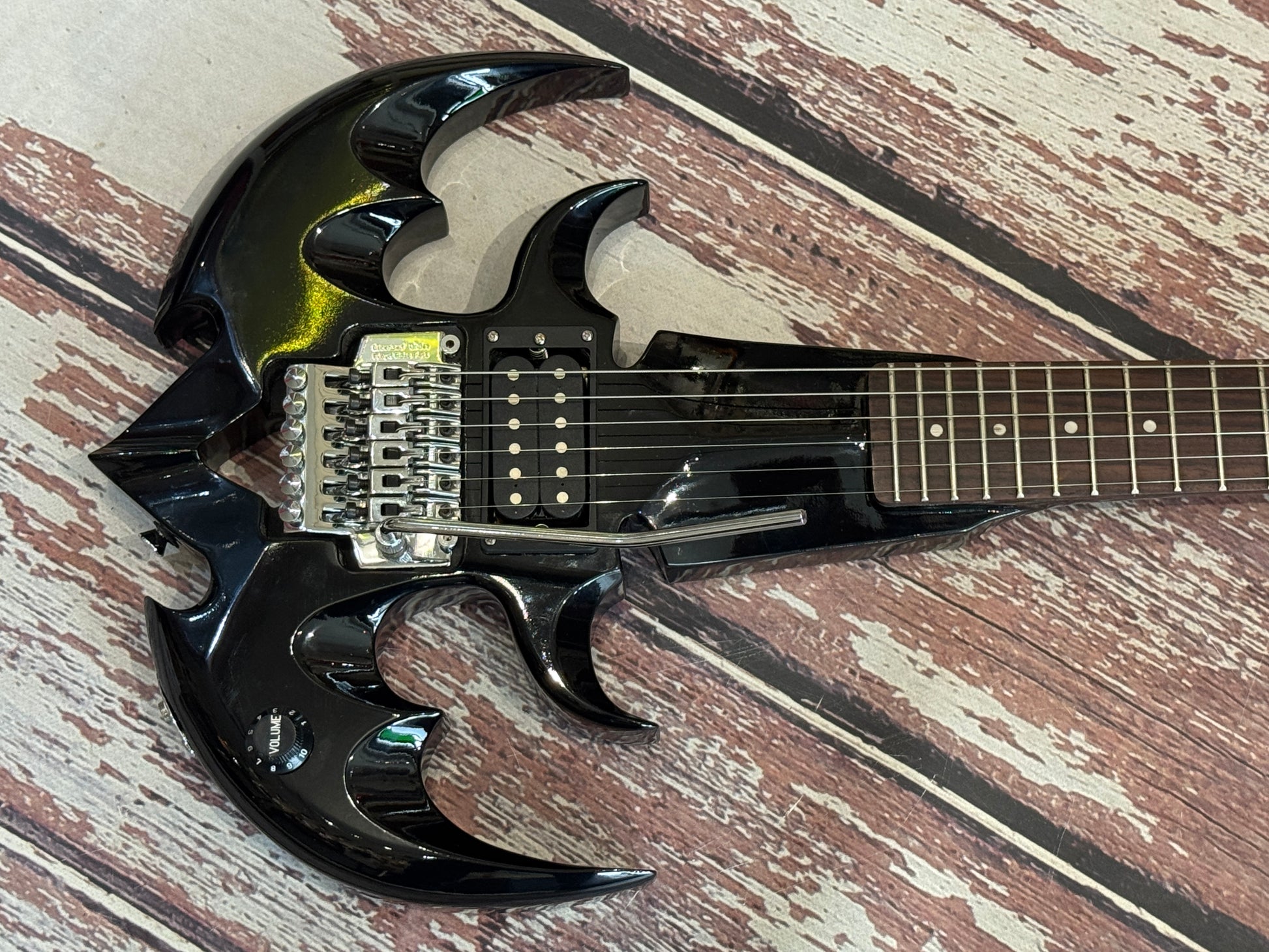 It comprises a single humbucker with a single volume control, with a licensed Floyd Rose locking tremolo. It has been fully set up and freshly strung.