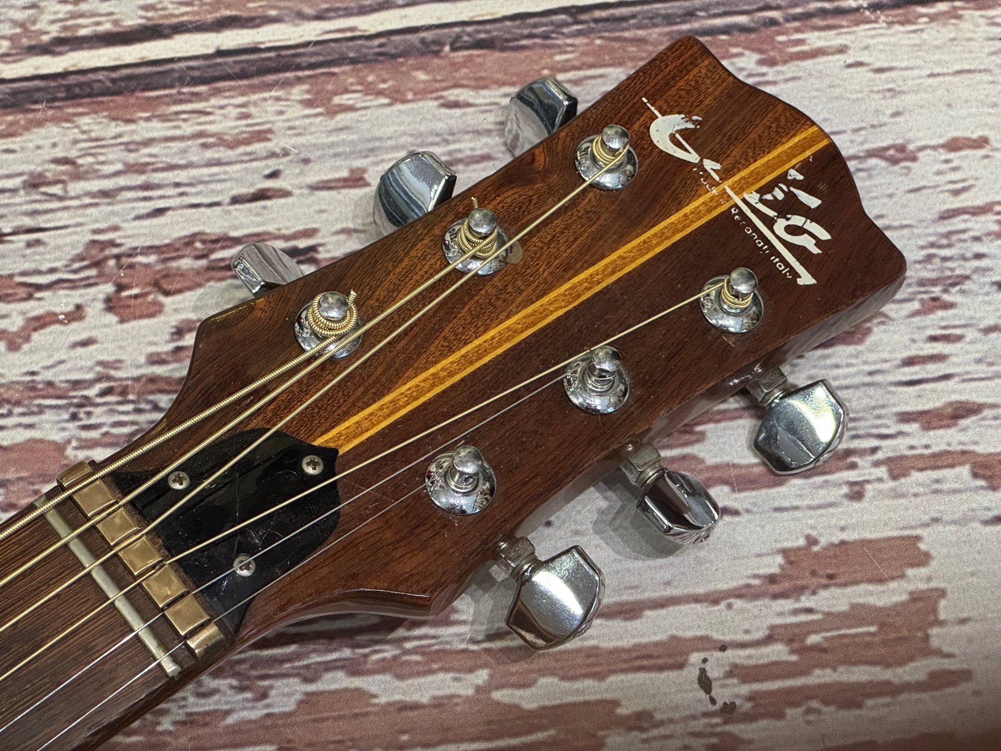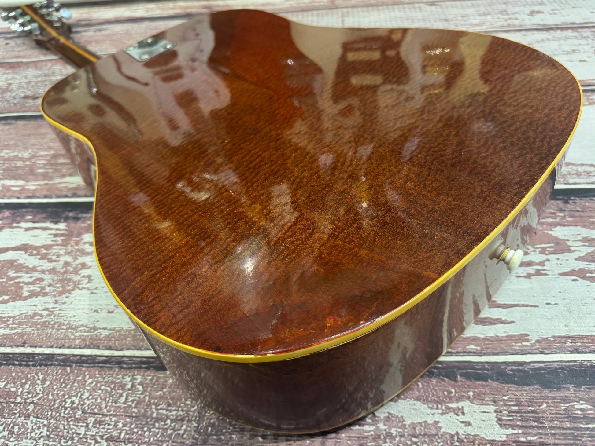 This one is the Ranger VI with the quilt sides and back, dating from the late 60's/early 70's. It features a brass nut and brass saddle. It has a few marks on it and a small repair on the back, which looks to be pretty old. It is solid and plays fine, a perfect "knockabout" acoustic with a great retro look!