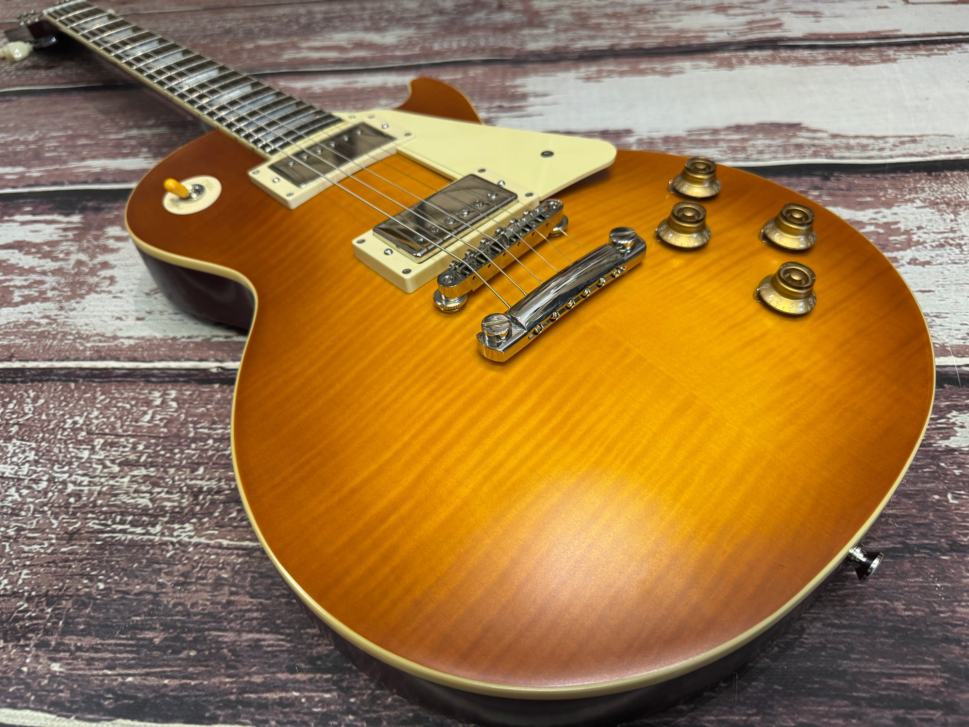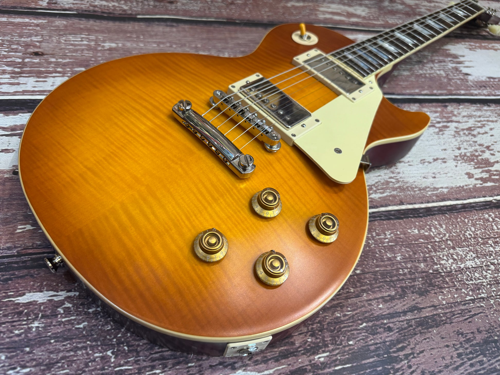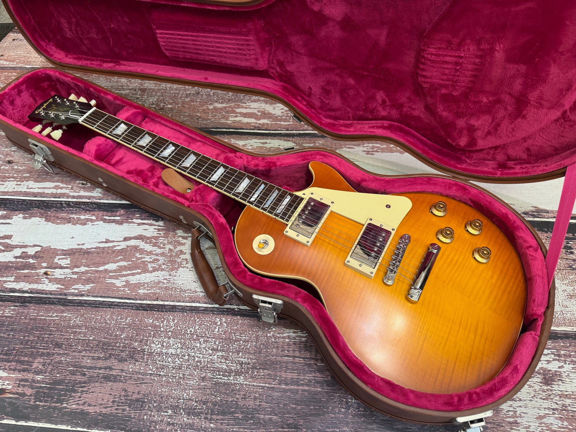 Made in collaboration with Gibson™ Custom, the Epiphone 1959 Les Paul™ Standard is Epiphone’s incredible recreation of the rare vintage classic, updated to be more authentic and true to the originals than ever. It features a mahogany body with a maple top with a solid flame maple veneer, a one-piece mahogany neck with a comfortable ’59 rounded, medium C profile, long neck tenon, and Gibson-style “open book” R9 headstock shape, VOS (Vintage Original Sheen) finish, Gibson Custombucker humbucking pickups, Switchcraft® selector switch and 1/4” output jack, CTS® pots, 50s era wiring, Mallory™ capacitors, non-beveled pickguard, Epiphone Deluxe vintage tuners with Keystone buttons, and a vintage-style brown and pink hardshell case.