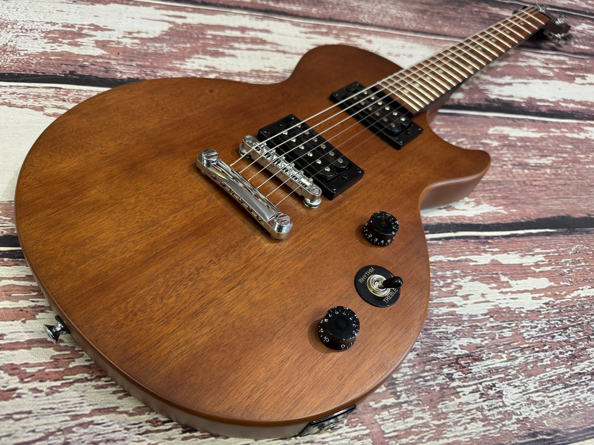 These are a great starter rock guitar, a classic Les Paul twin humbucker layout with a 3 way pickup toggle selector switch, plus a master volume and master tone. This one is a satin natural "Walnut" finish.