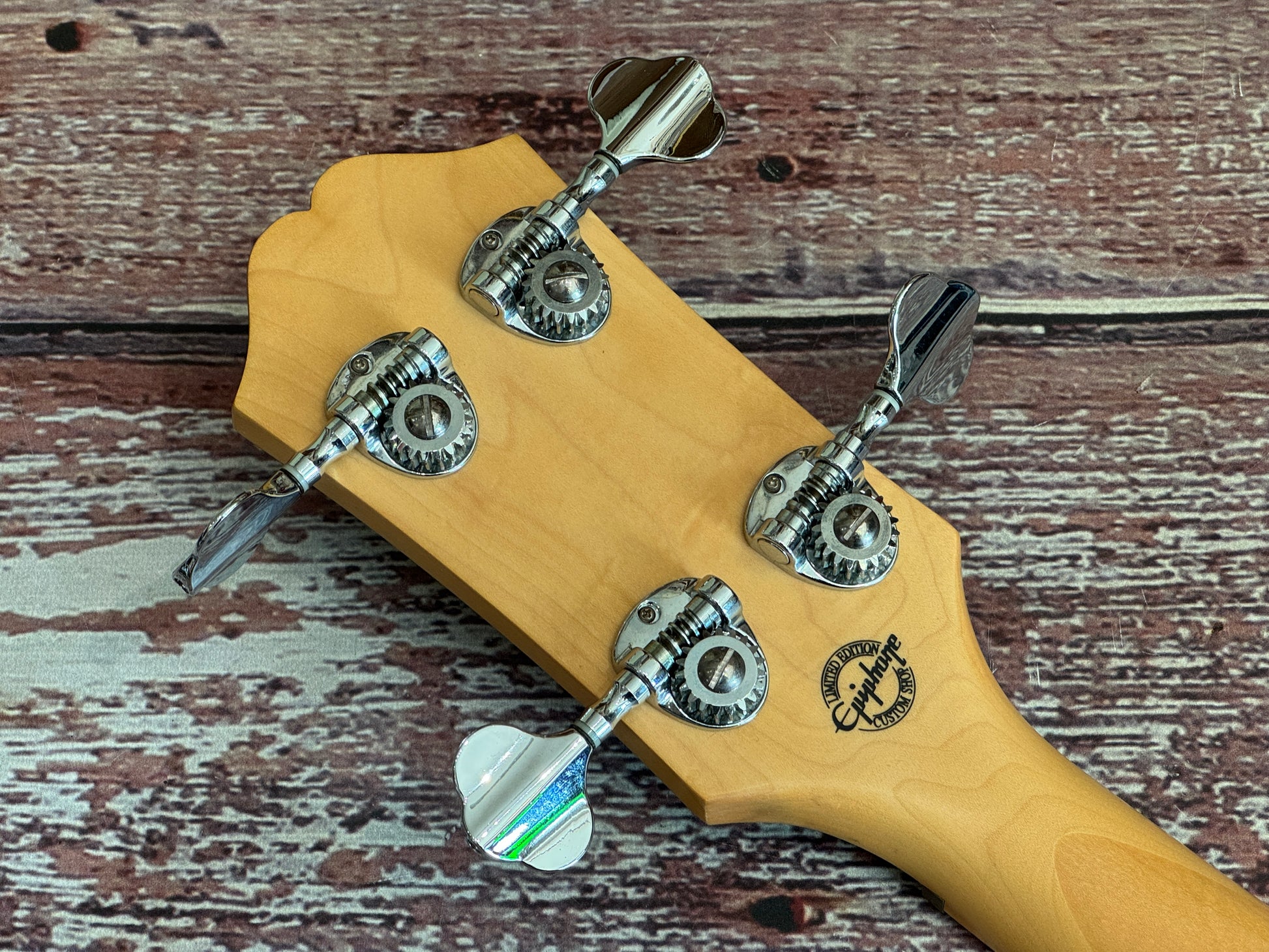 Well I am old enough to remember when the Ripper and Grabber basses hit the market, they were pretty revolutionary in the 70's and still maintain that individuality today. This model was conceived by the Epiphone Korean custom shop and mixes it up by loading in a P-Bass and a Jazz Bass pickup, which is a very smart idea indeed.