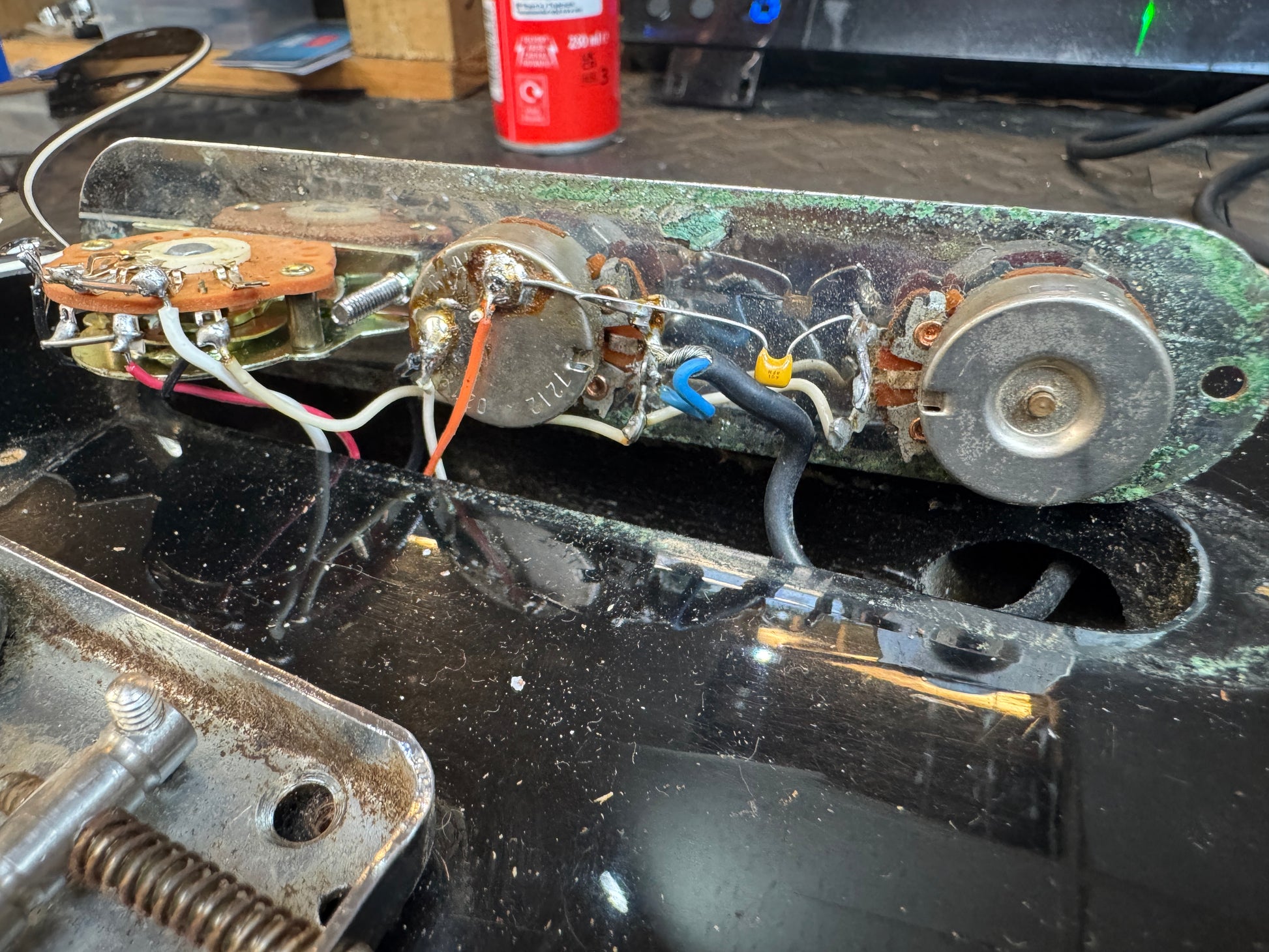 Electrics are replacements, from pickup is generic and modern, scratchplate is also modern.