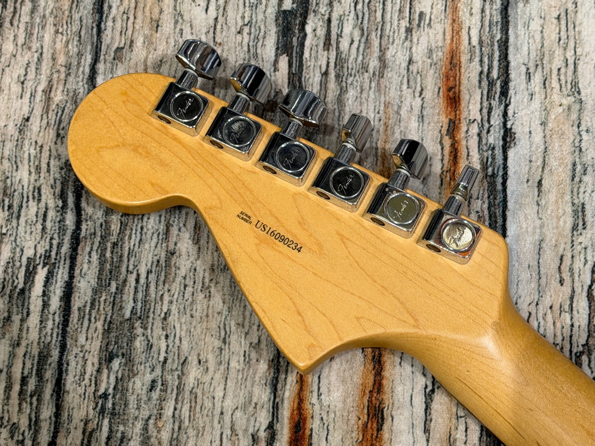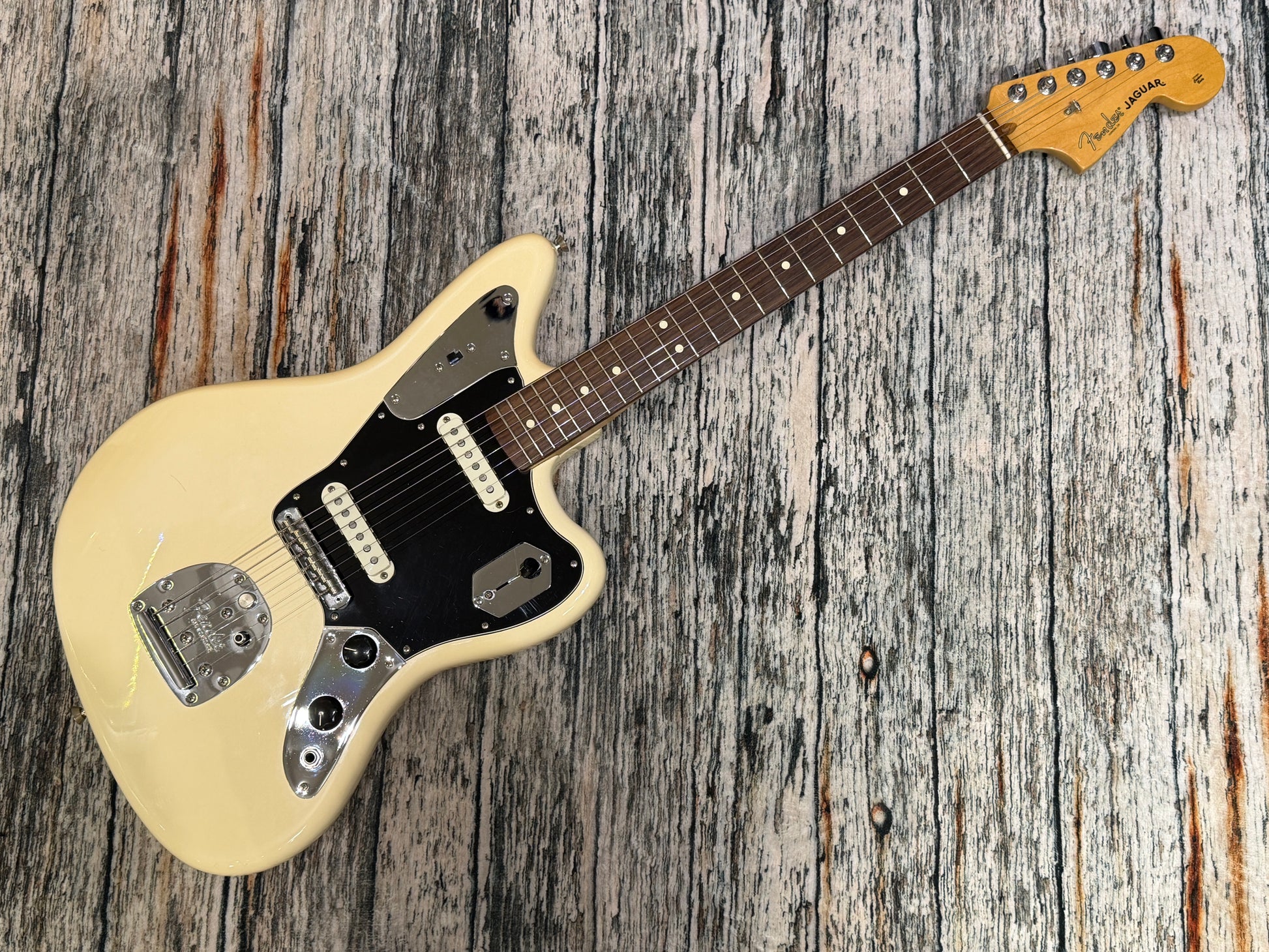 The Fender American Professional Jaguar features an alder body, a maple neck with a modern "Deep C" shape, and a rosewood or maple fingerboard with a 9.5-inch radius. It is equipped with V-Mod single-coil Jaguar pickups, a 4-way blade switch for pickup selection, and a unique 2-position slide switch for in/out-of-phase tone. Modern hardware includes a 9.5-inch radius Jazzmaster/Jaguar bridge with a vintage-style floating tremolo, and standard cast/sealed staggered tuning machines.