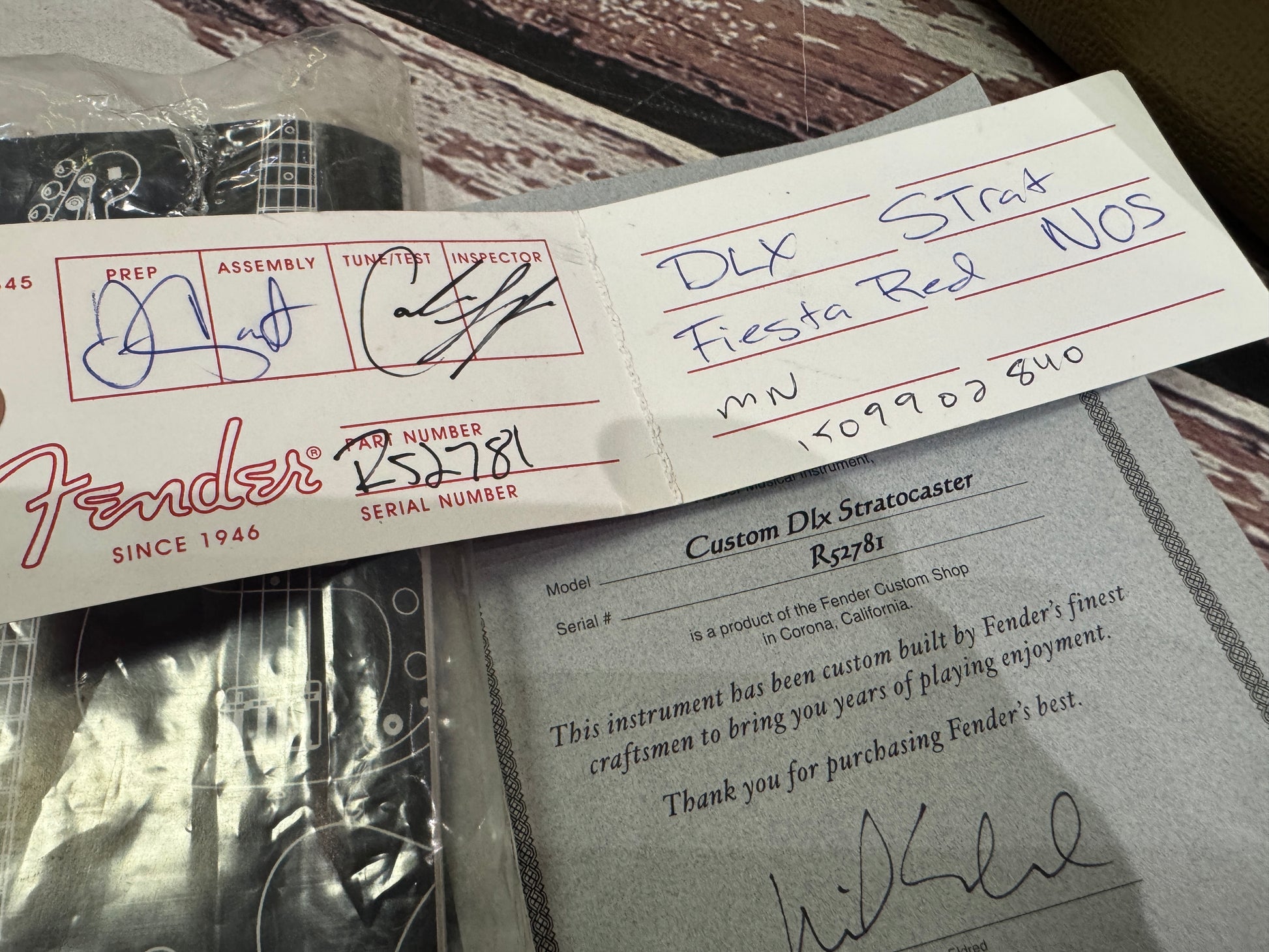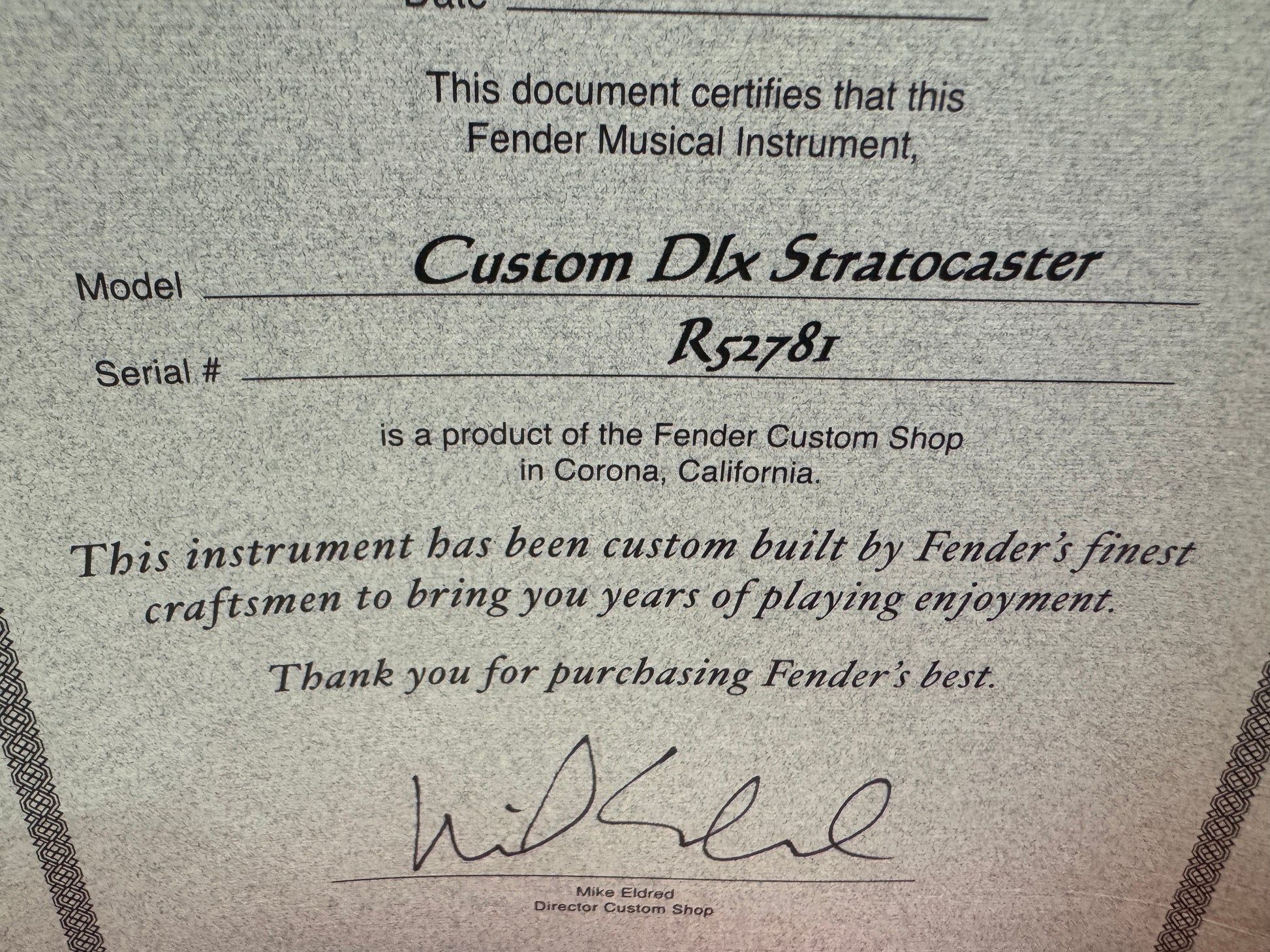 It has its Fender hard case with all the supporting paperwork. The certificate has a slight print error, where the date didn't get fully printed but it is 28/05/2010.