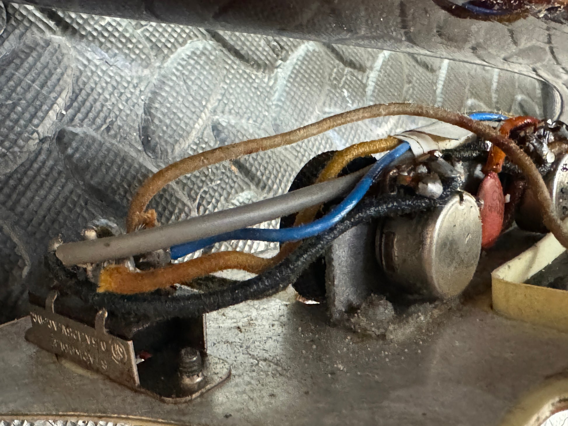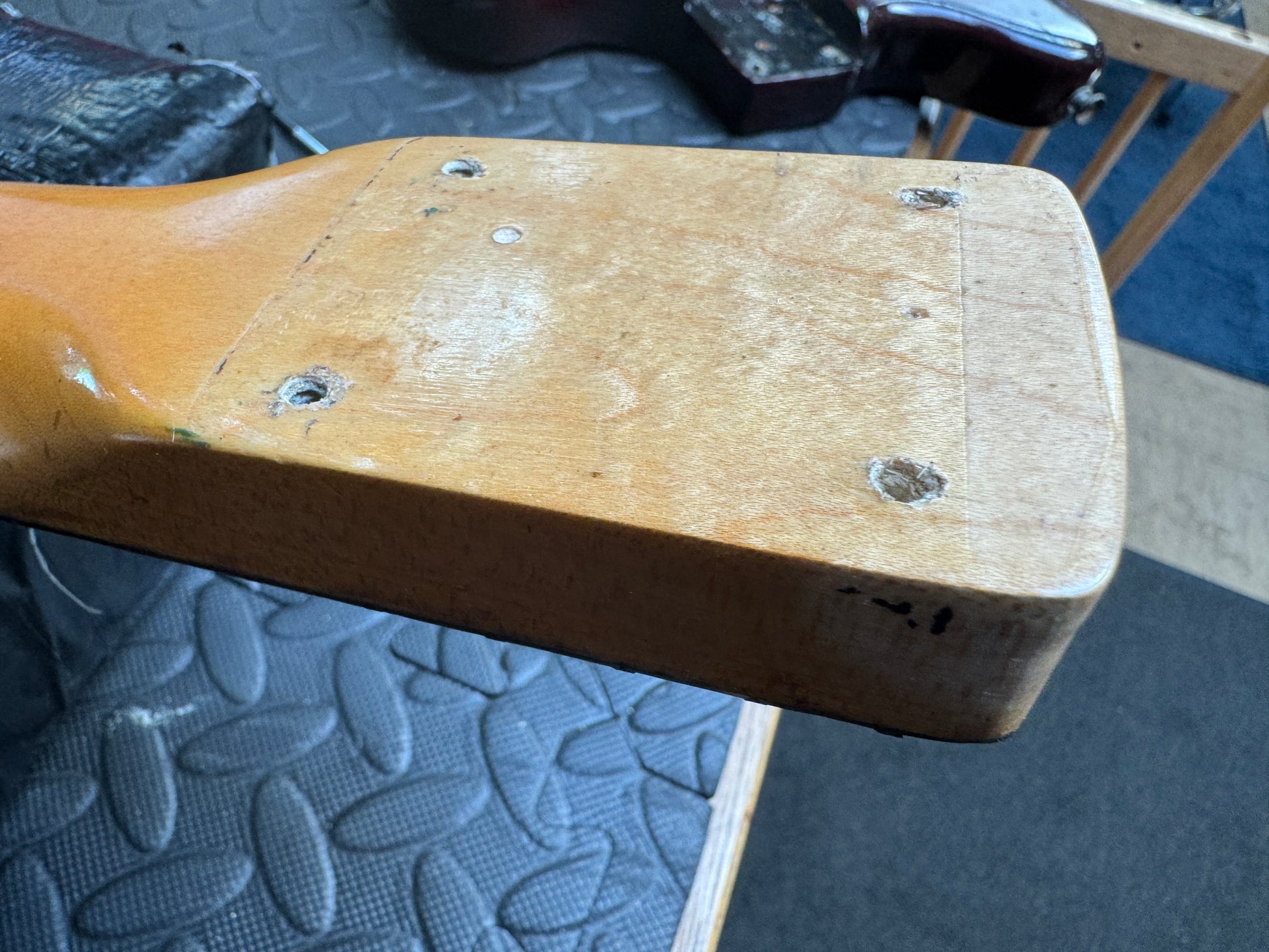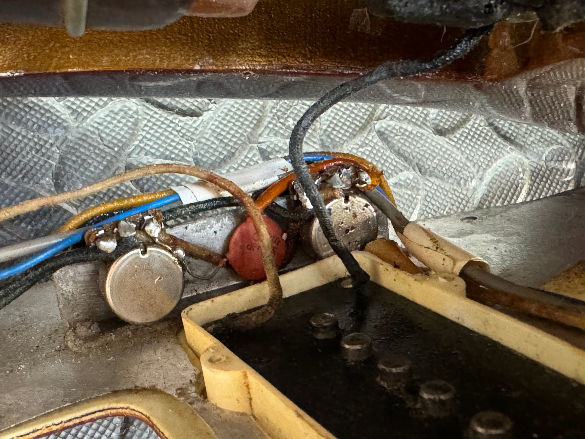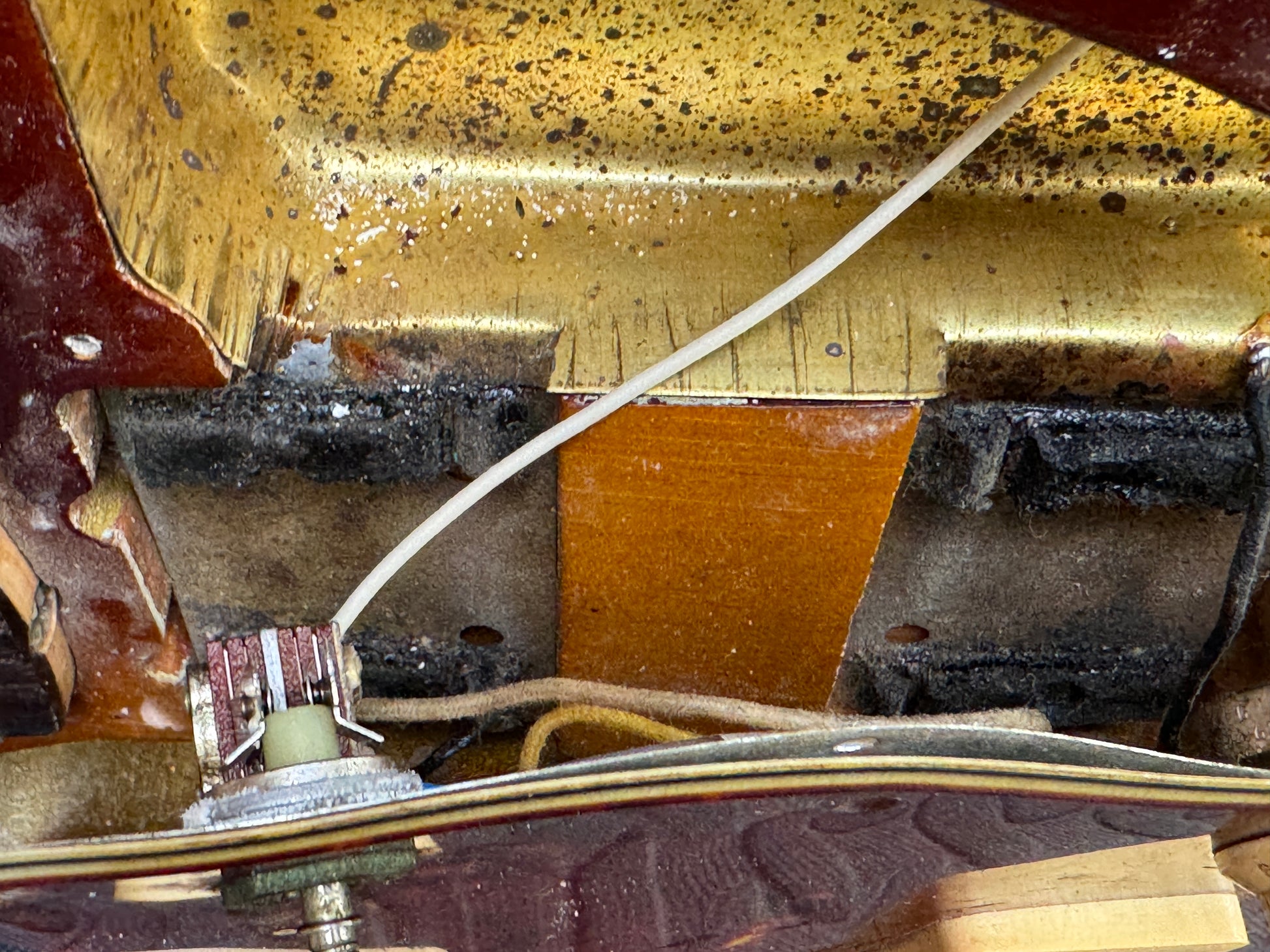 We have stripped the guitar and looked at the internals, and while we are happy to be corrected, we feel this is 100% original. The pot codes date from 1961. The serial number (pre "L") falls as 61/62 and the neck pencil mark looks like 62. The fact it is pencil denotes pre '63 when stamps were introduced. Being a non slab board shows it as after 1960.