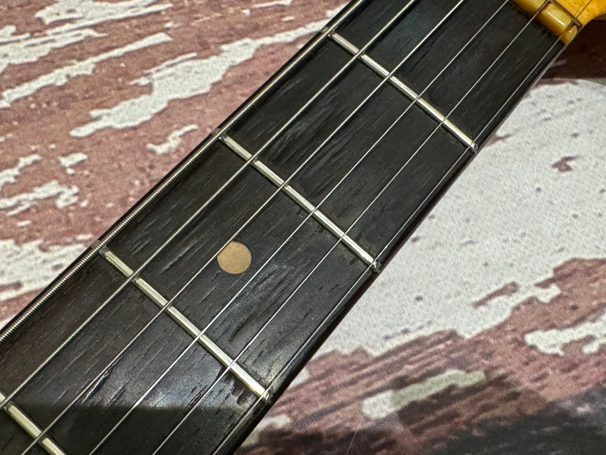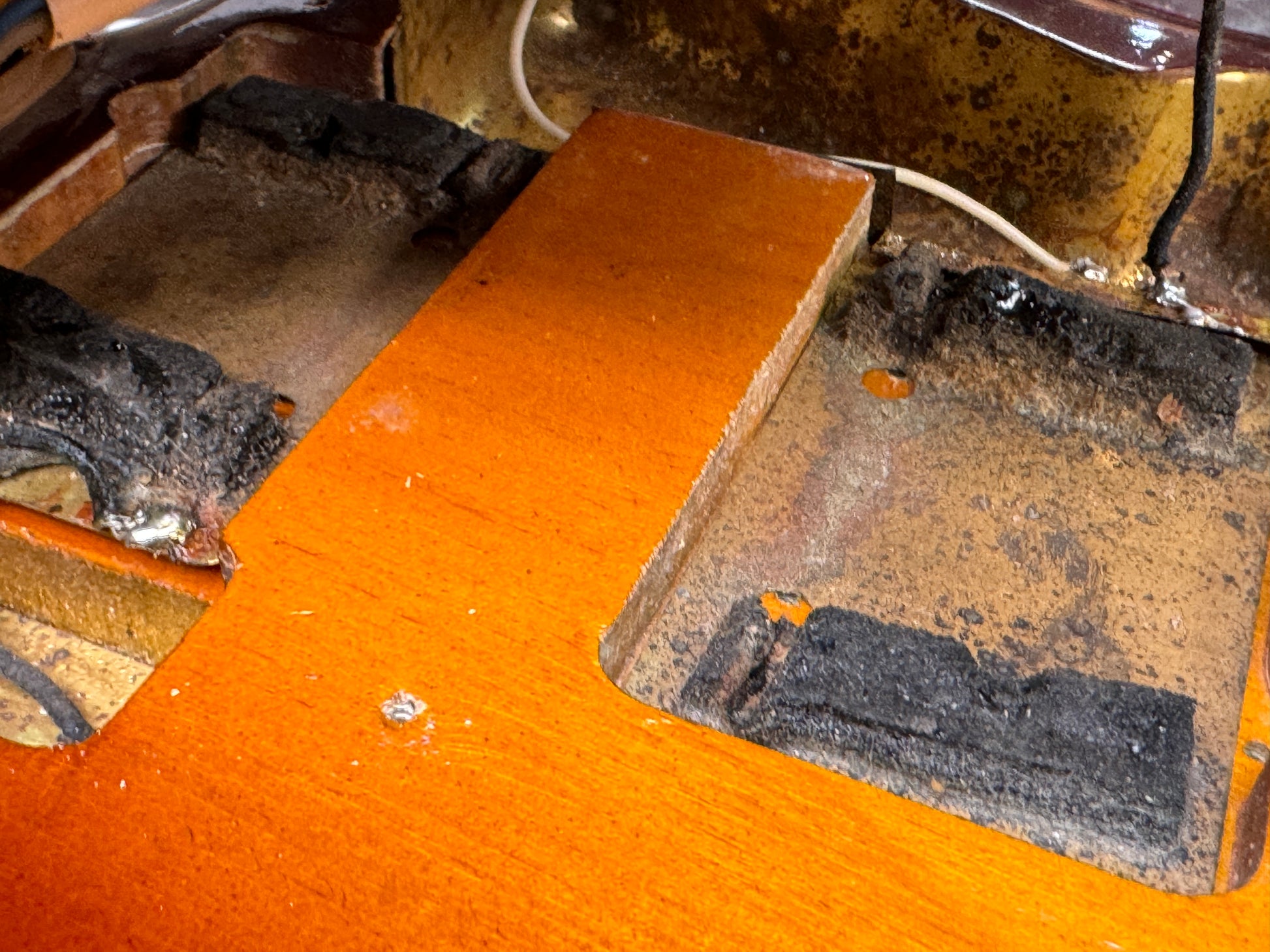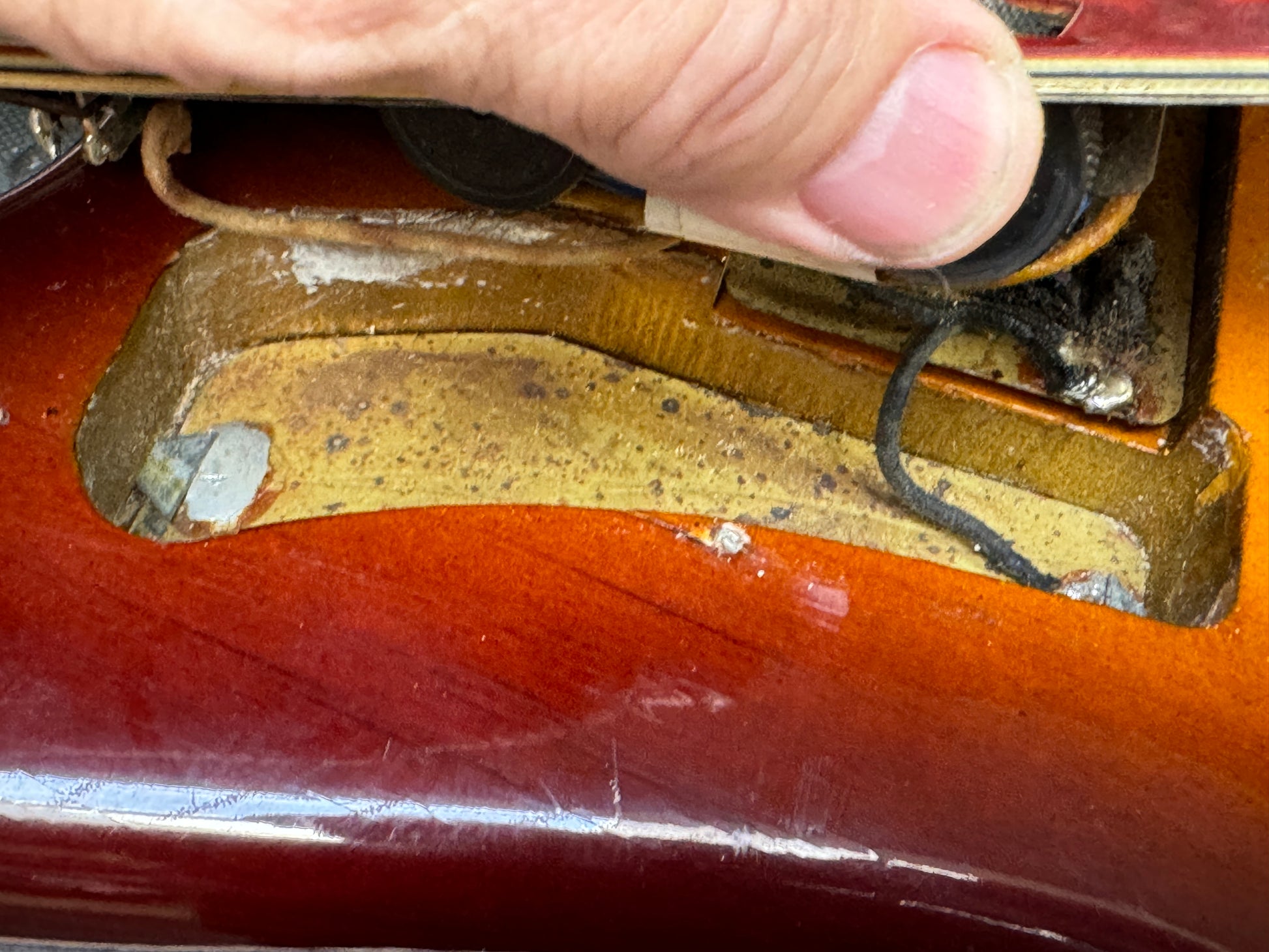 We have stripped the guitar and looked at the internals, and while we are happy to be corrected, we feel this is 100% original. The pot codes date from 1961. The serial number (pre "L") falls as 61/62 and the neck pencil mark looks like 62. The fact it is pencil denotes pre '63 when stamps were introduced. Being a non slab board shows it as after 1960.