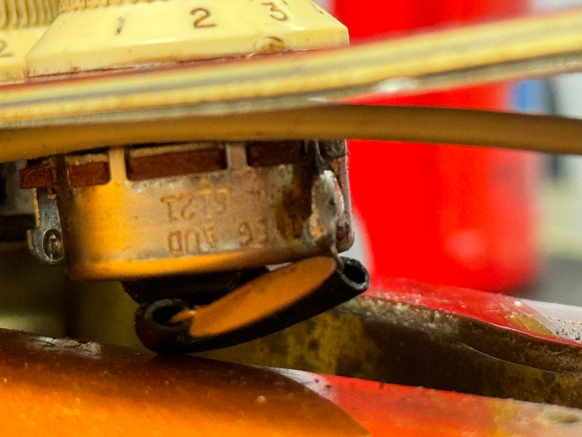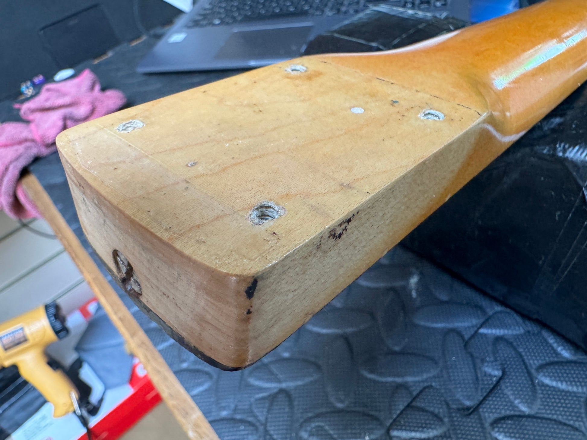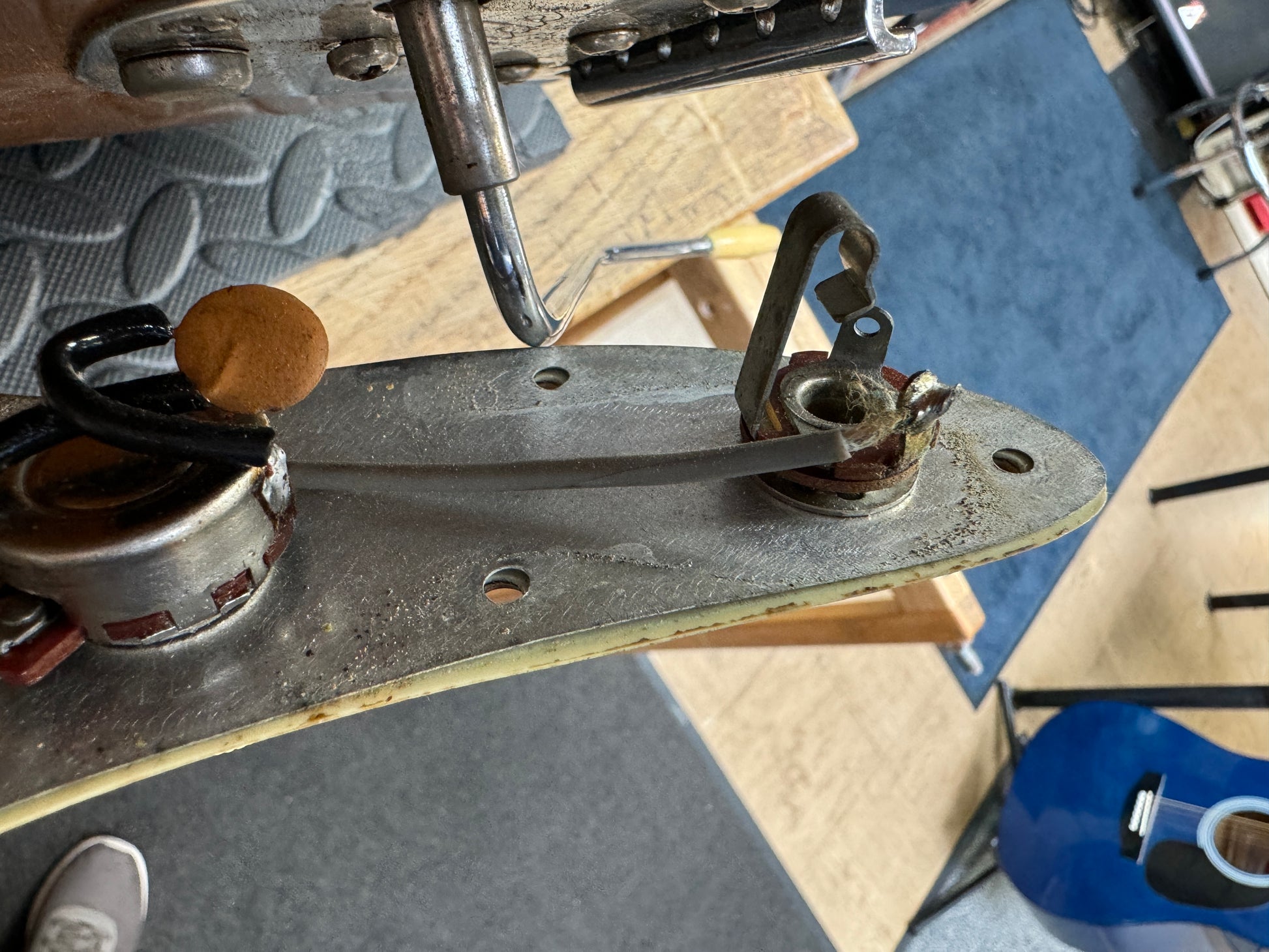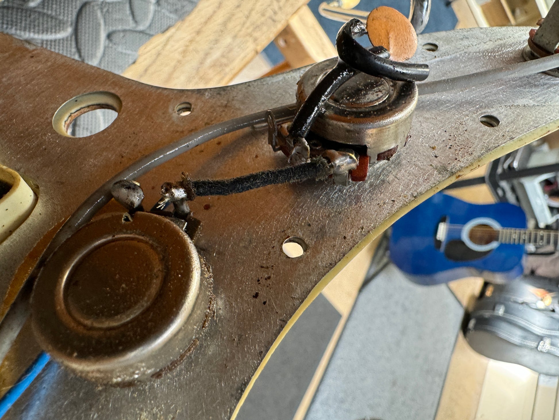 We have stripped the guitar and looked at the internals, and while we are happy to be corrected, we feel this is 100% original. The pot codes date from 1961. The serial number (pre "L") falls as 61/62 and the neck pencil mark looks like 62. The fact it is pencil denotes pre '63 when stamps were introduced. Being a non slab board shows it as after 1960.