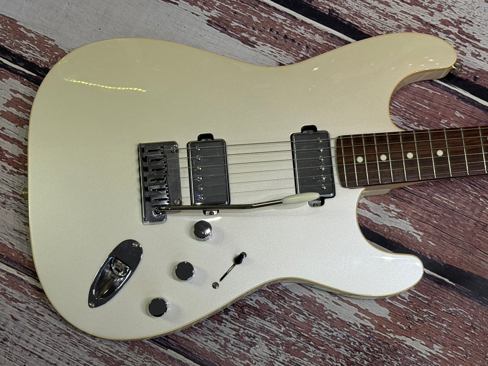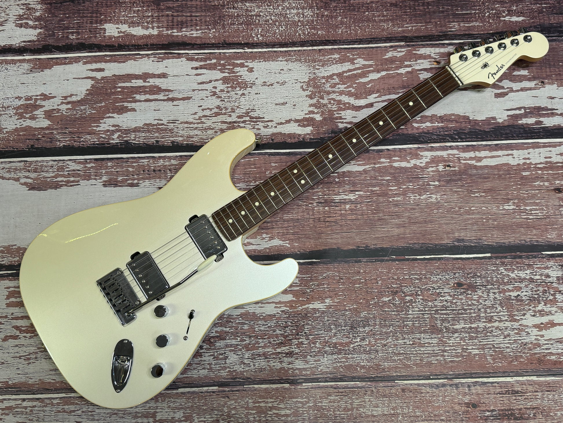 We love a rarity here at Badlands, and here's another! This is a beautiful, built in Japan, Fender modern Stratocaster HH in stunning pearl white. A solid body electric guitar, and the weapon of choice for guitarists looking for comfort and modern pro performance.