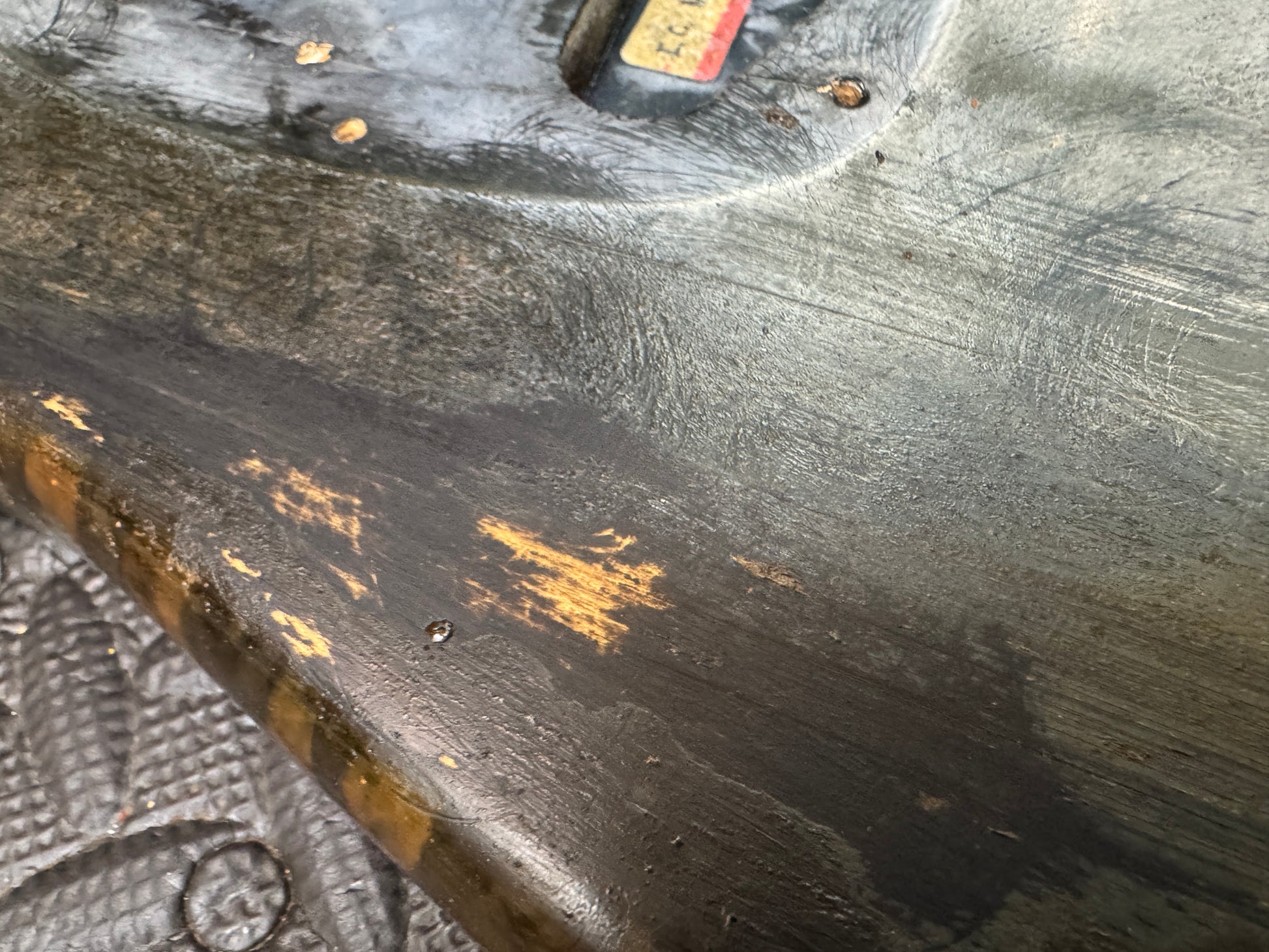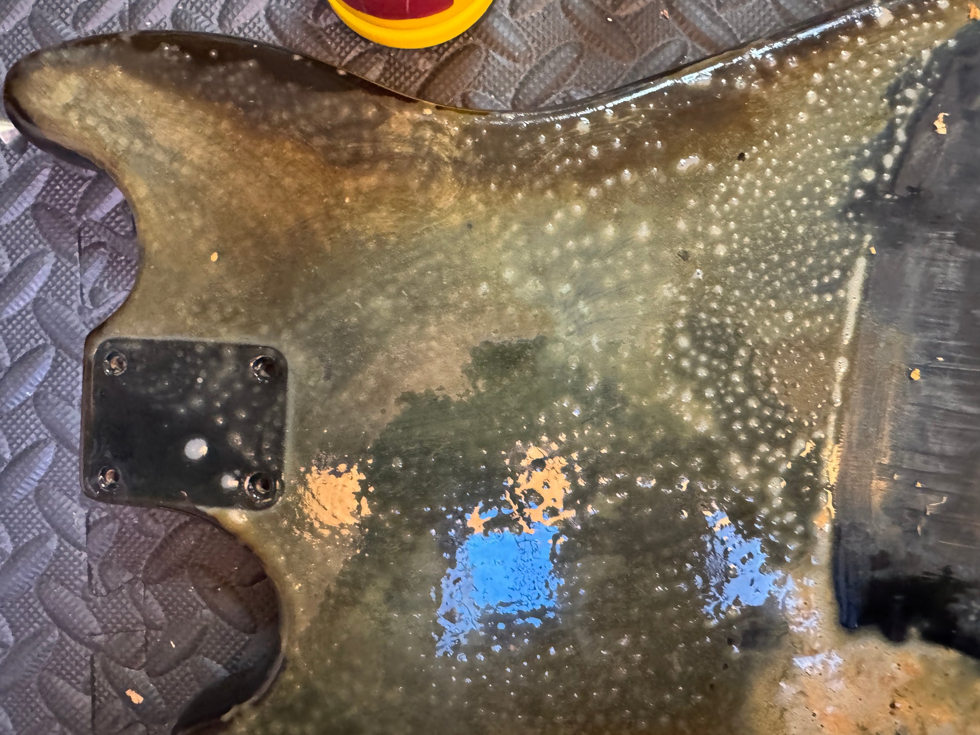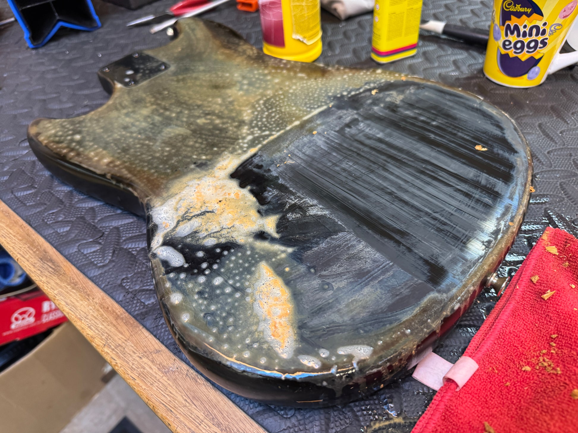 The bass had some of the heaviest nicotine contamination we have ever seen, and despite many hours trying to remove this we had to admit defeat. The nicotine had chemically altered the original paint to a point it remained soft/sticky and unusable