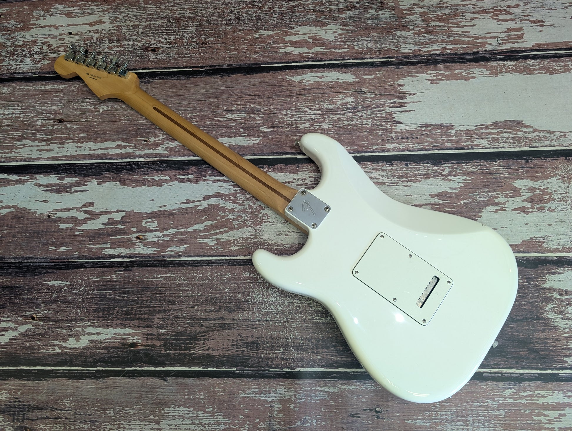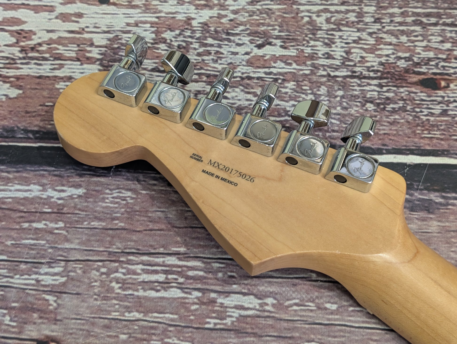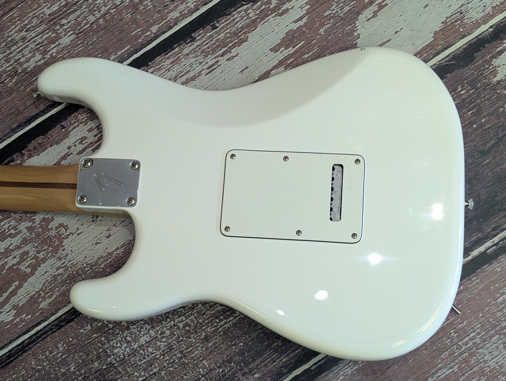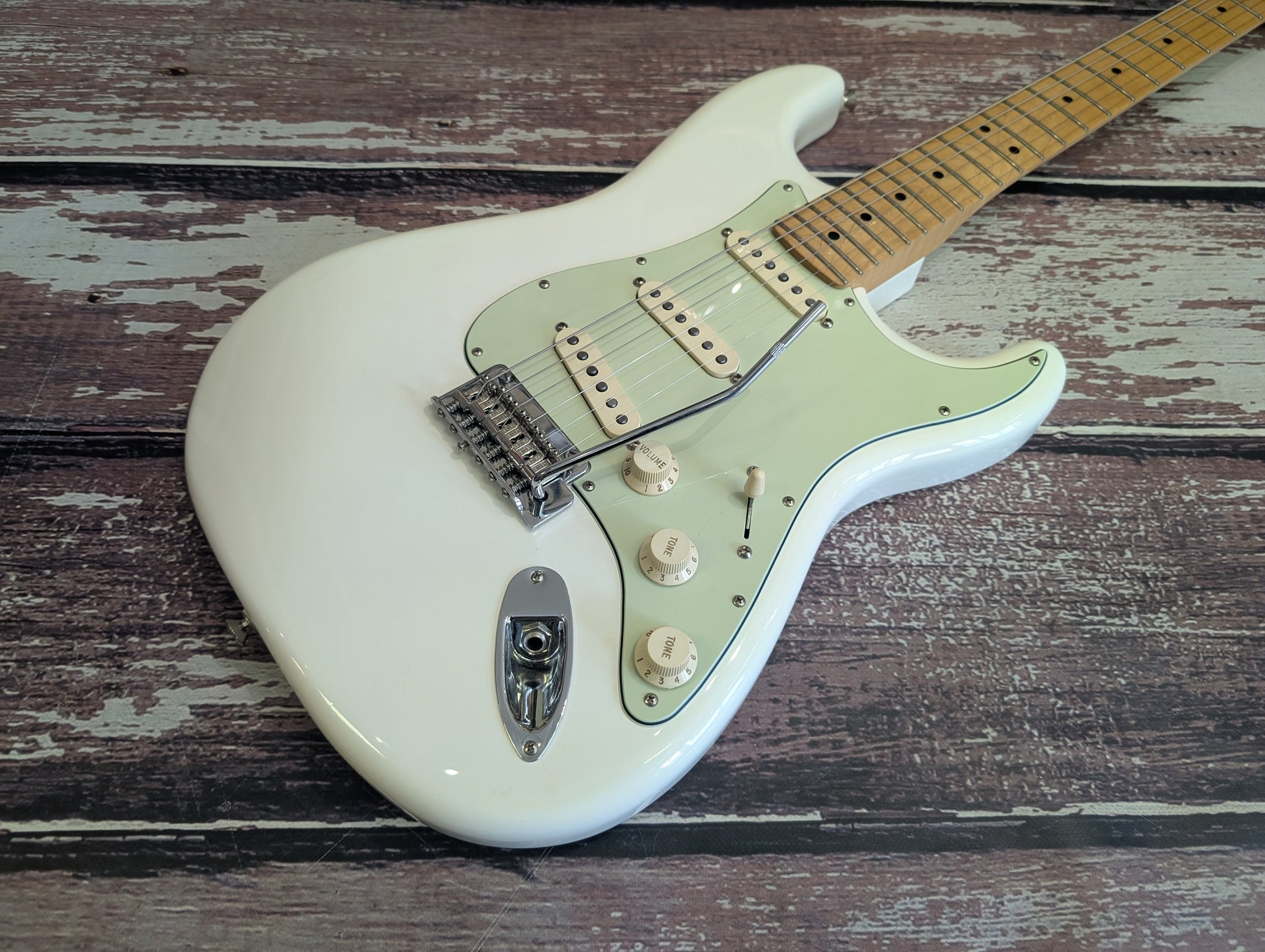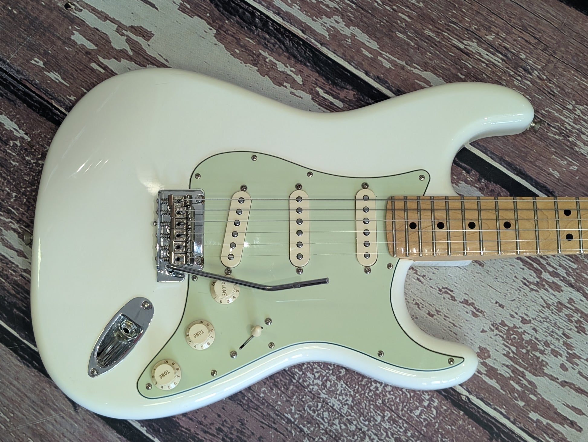 This is a 2020 model, in Polar white. In a slight departure from vintage Strat design, this one has a two point bridge, which should offer better tuning stability if you're the kind of player who likes some wobble-bar action. It has an Alder body, and all Maple neck.