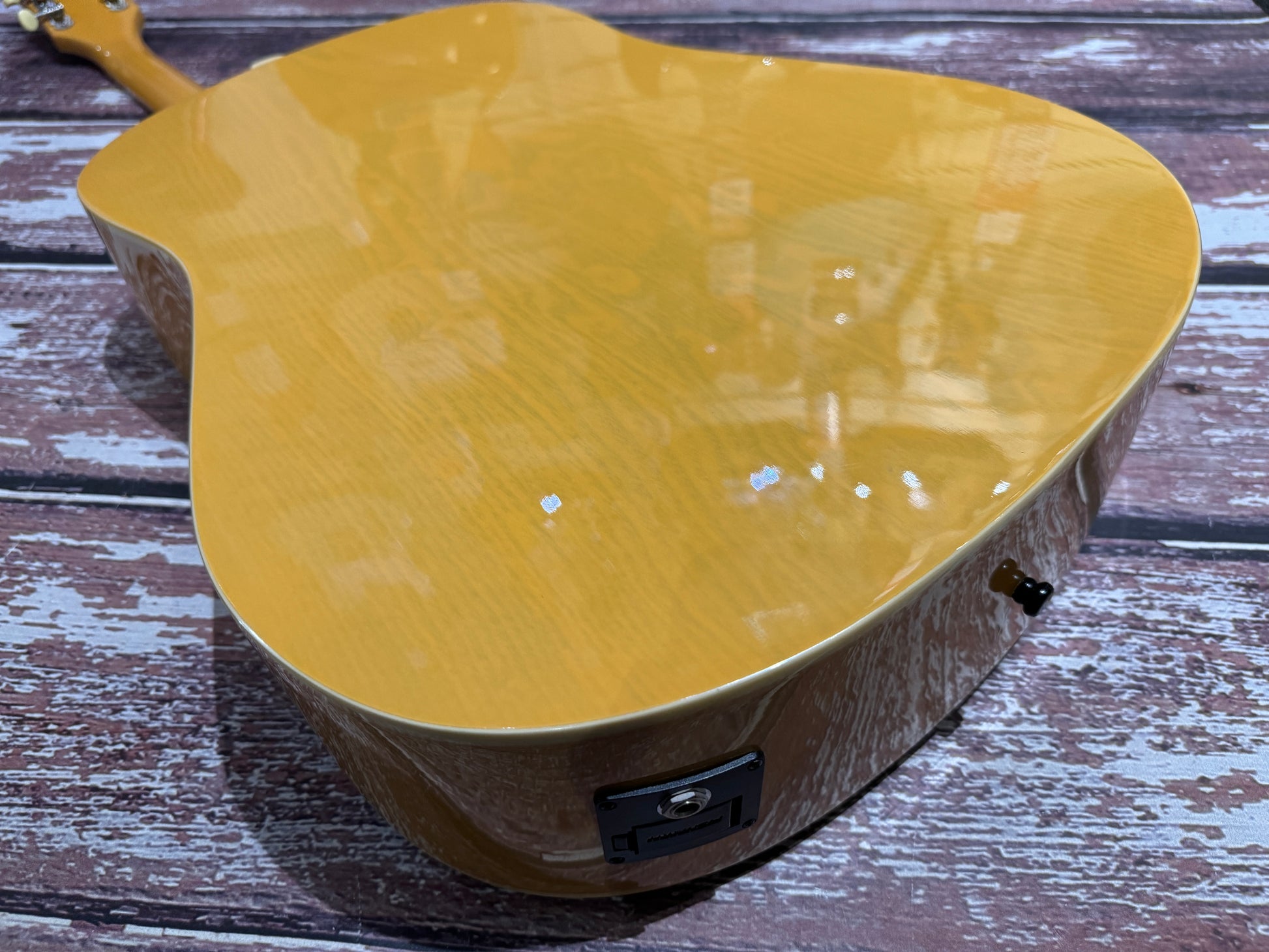 This one is in very clean condition, freshly set up and strung it is ready to go. The body is a medium/large size, not a full dreadnought but with a good even tonal balance acoustically.
