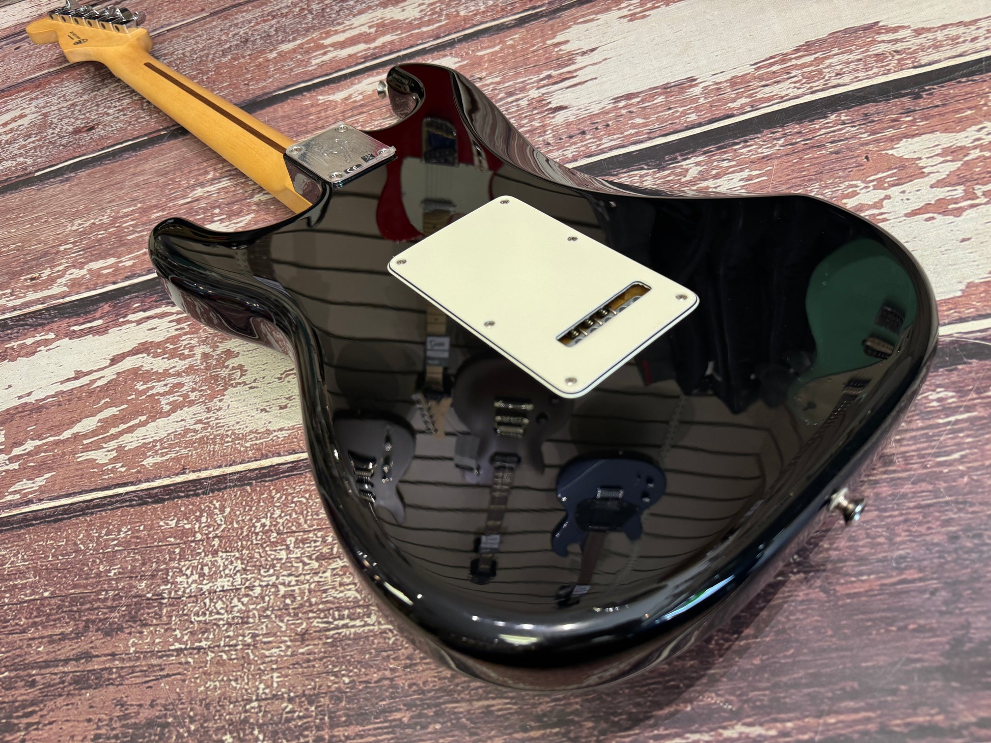 This one is a standard Strat in classic black with maple neck (very Eric!) It has the "75" logo on the back of the headstock,