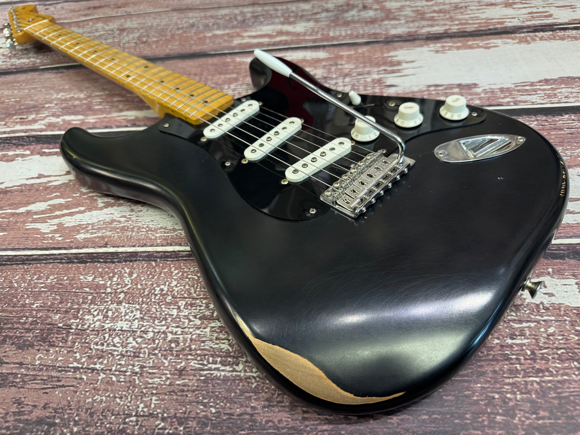 Wow, this is a mix of everything players want in a Strat! It is a 50's reissue with the maple board, it is also an original road worn edition and it is in the David Gilmour colourway, and it was a special limited edition run.
