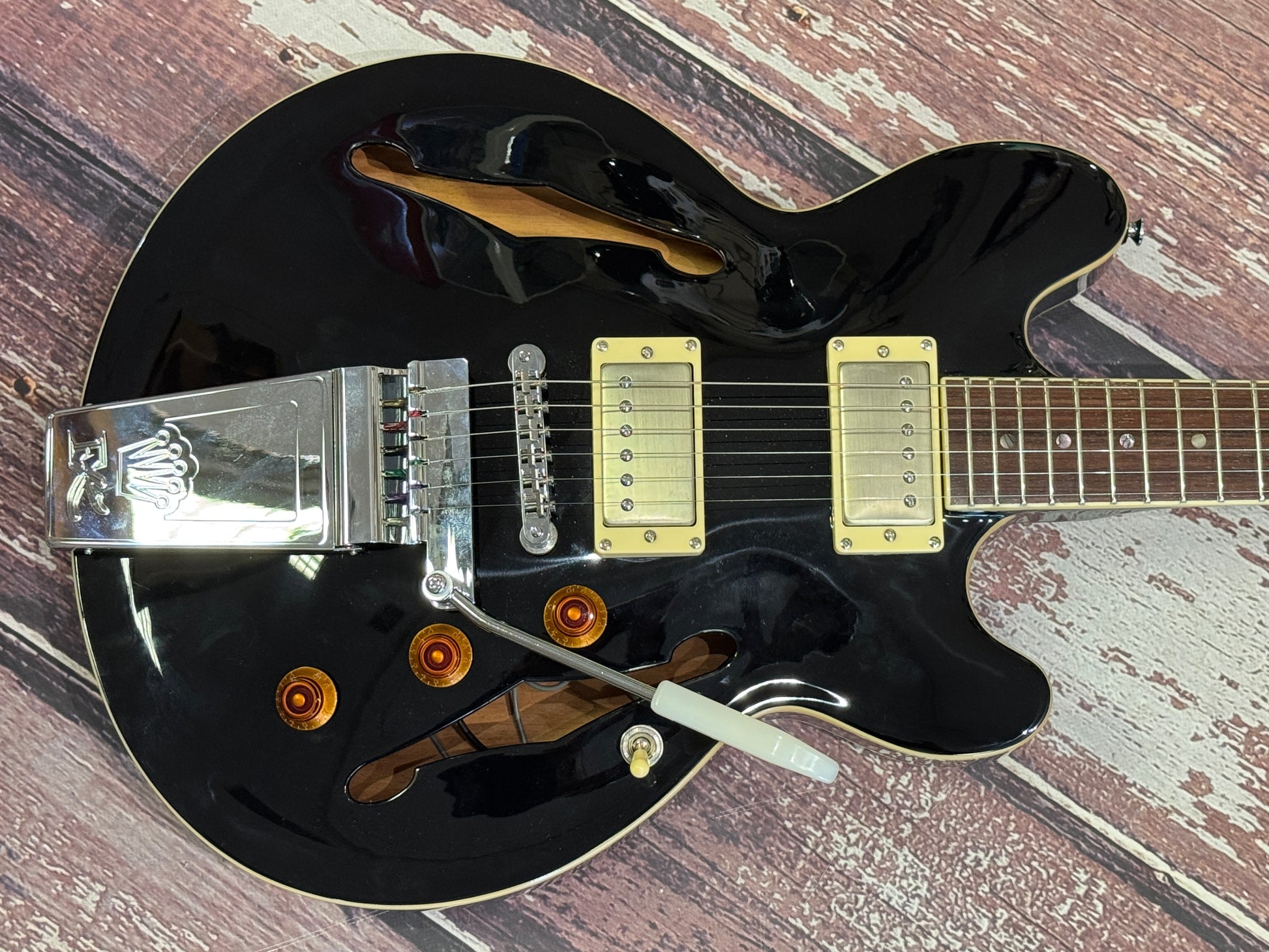 Everyone loves a good honest deal, and this one is a killer offer. This fabulous smaller body semi is new, but has been the showroom display model at the distributors HQ. It is the example guitar sent to them buy the maker, we know this because the strap button has not been drilled/fitted, but fear not we will do this before selling it!