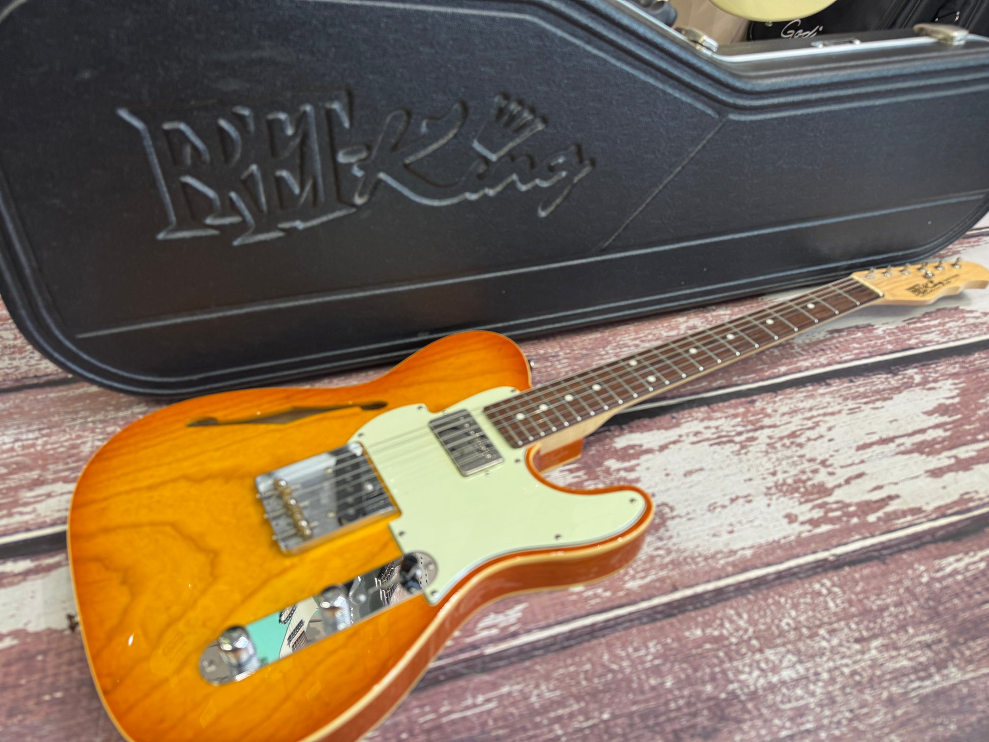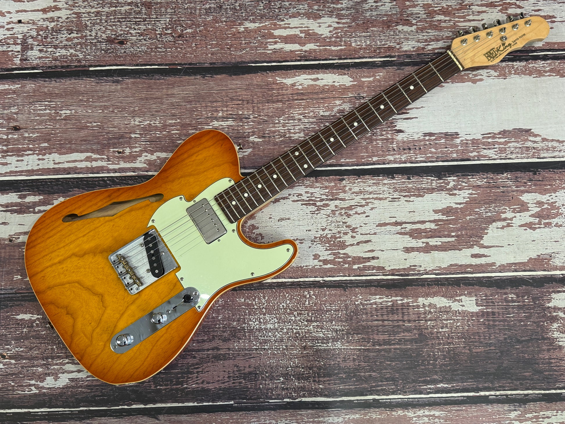 As you can see this is a "tele" style semi hollow guitar, very light indeed, and a joy to play, the humbucker is split via the push/pull tone pot, and you get a custom made, fitted Hiscox hard case in the deal! Hand on heart this will stand string against and USA guitars of a similar shape!!