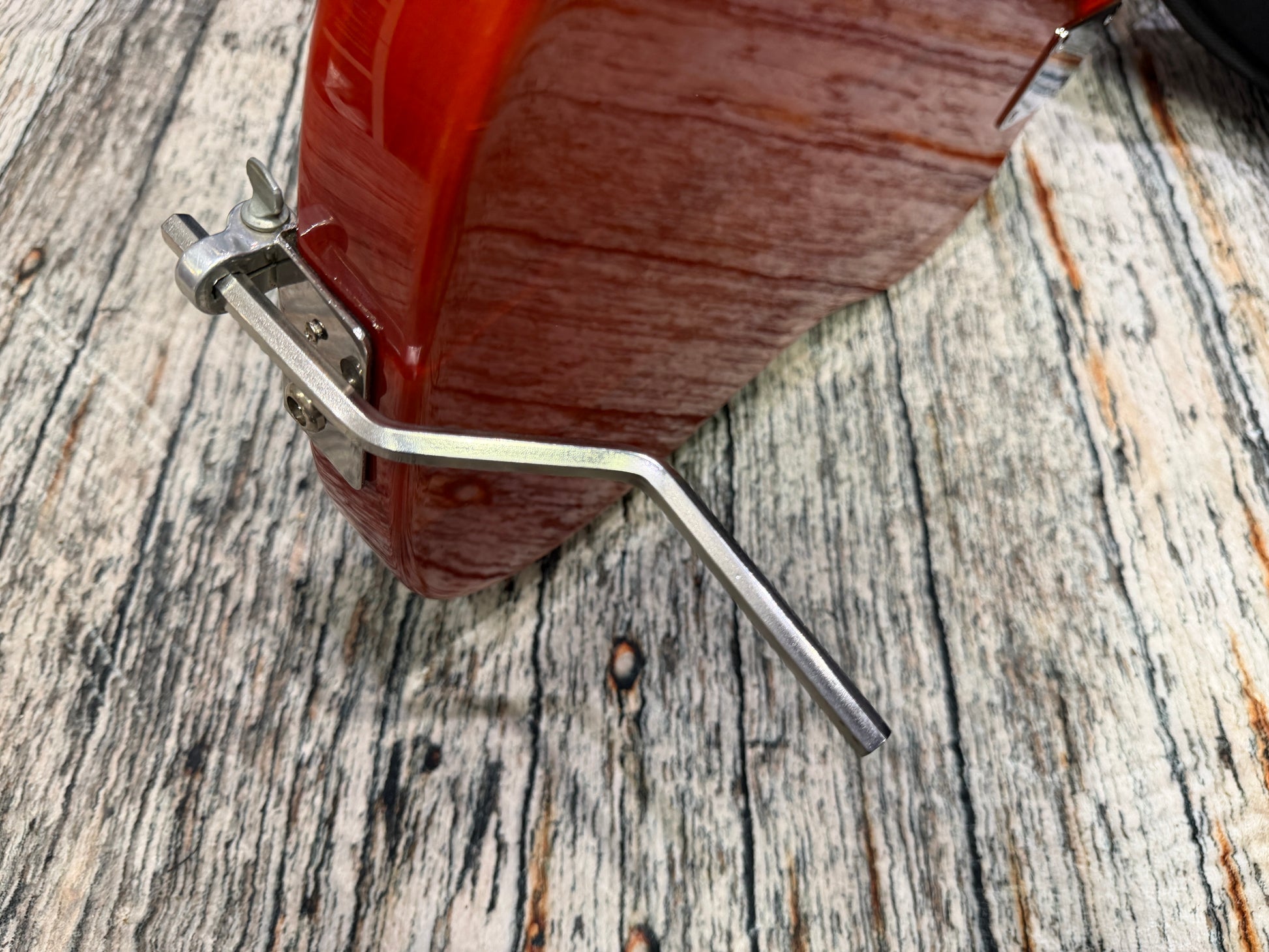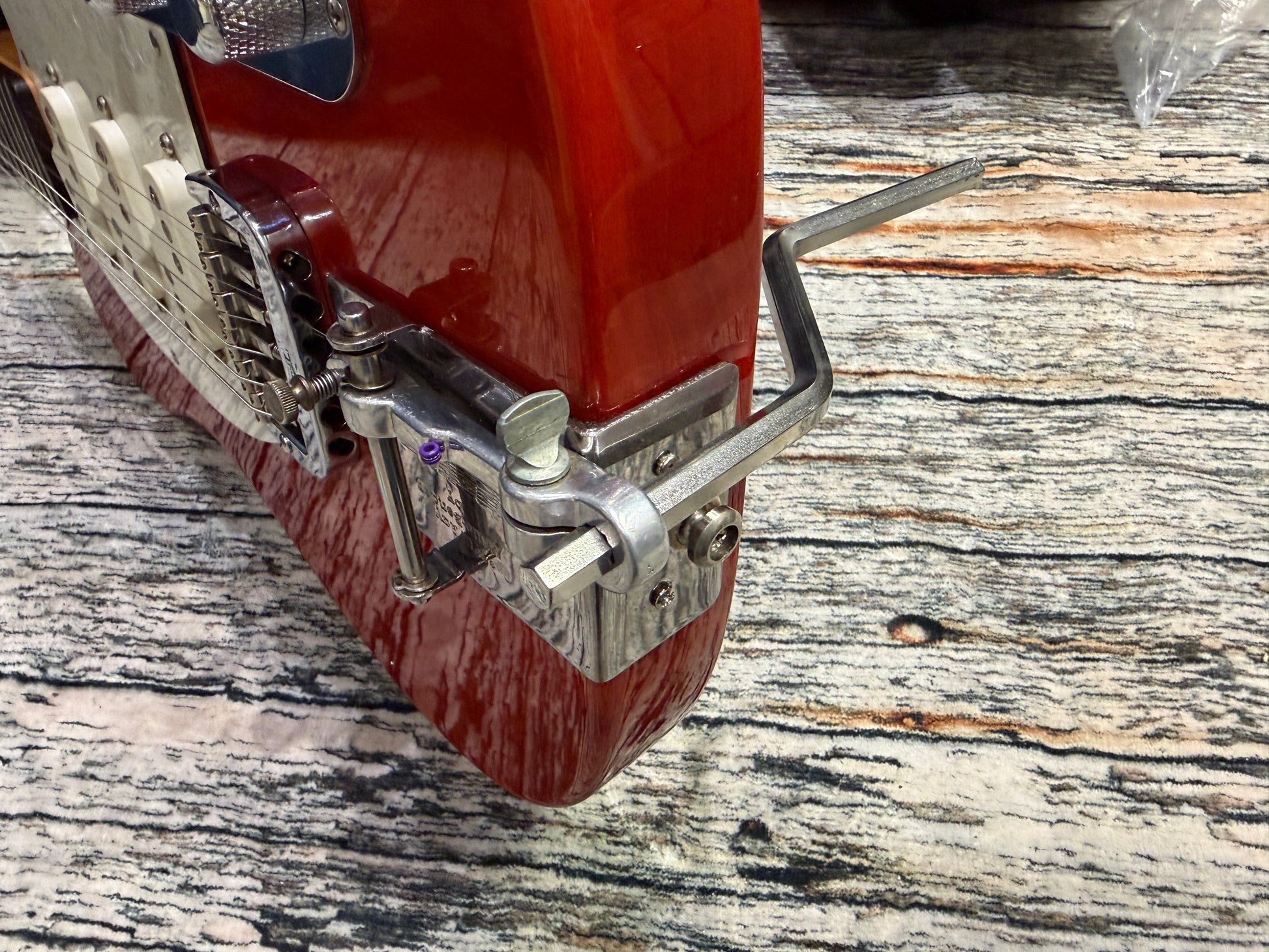 Essentially they are hum cancelling single coils, one of Leo Fender last amazing inventions. On top of this the guitar is fitted with the Hipshot Bender system that can be used for either G or B strings. The bridge is custom made for this system. The system operates by the cranked lever fitted to the bended arm, which is then pushed by your hip. You can either move your hip against the lever, or push the guitar across to the left and get the same result. The bender is set up to raise the B to C#.