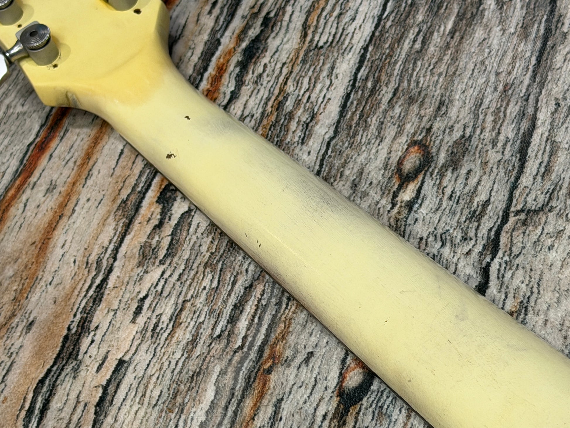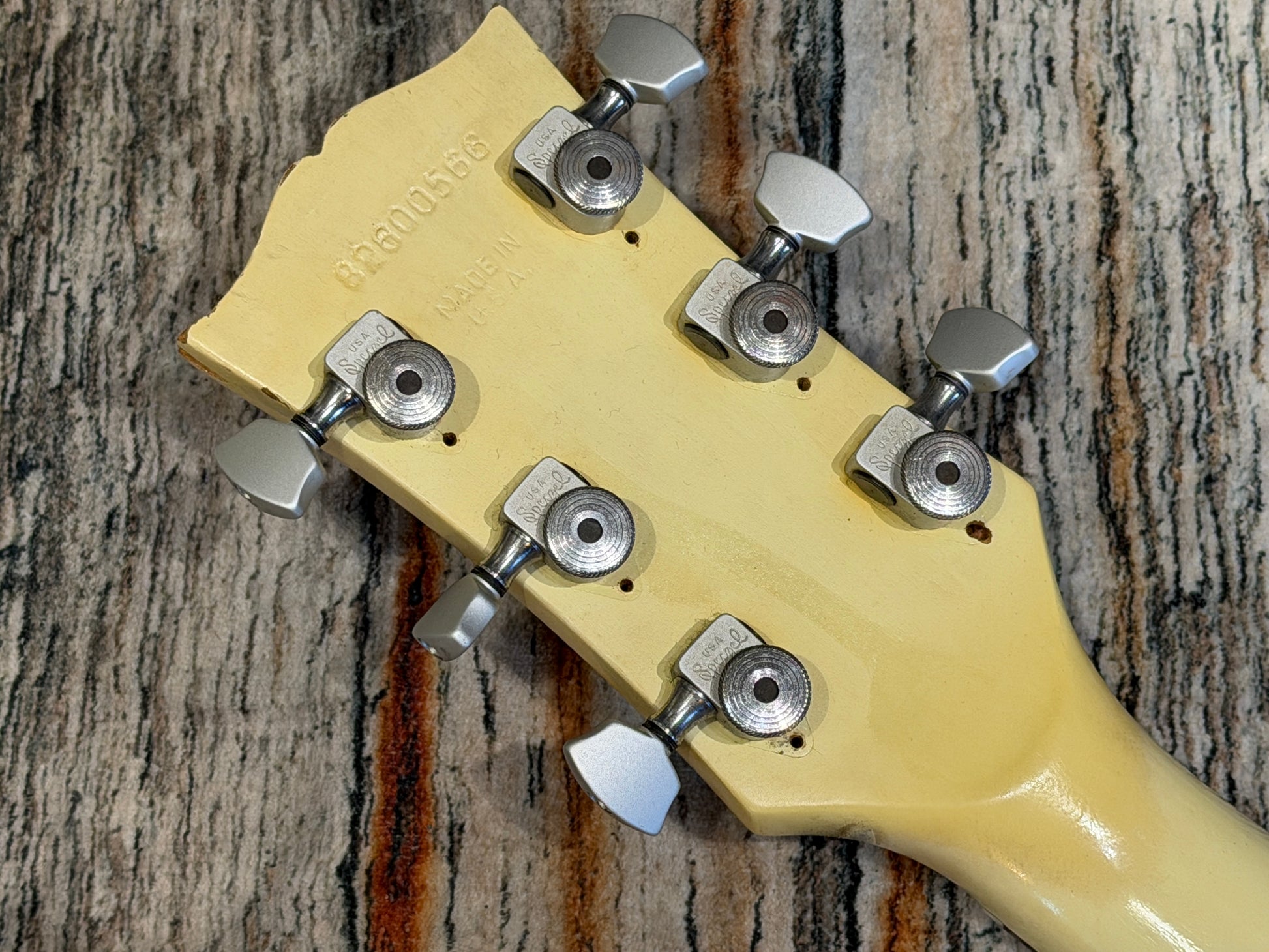 It is a bolt on neck, heavyweight twin humbucker USA Gibson and as you can see this one has been enjoyed! Lots of wear and tear from use, some fret wear, but it plays perfectly for all that. The neck humbucker has a mini toggle to split it.