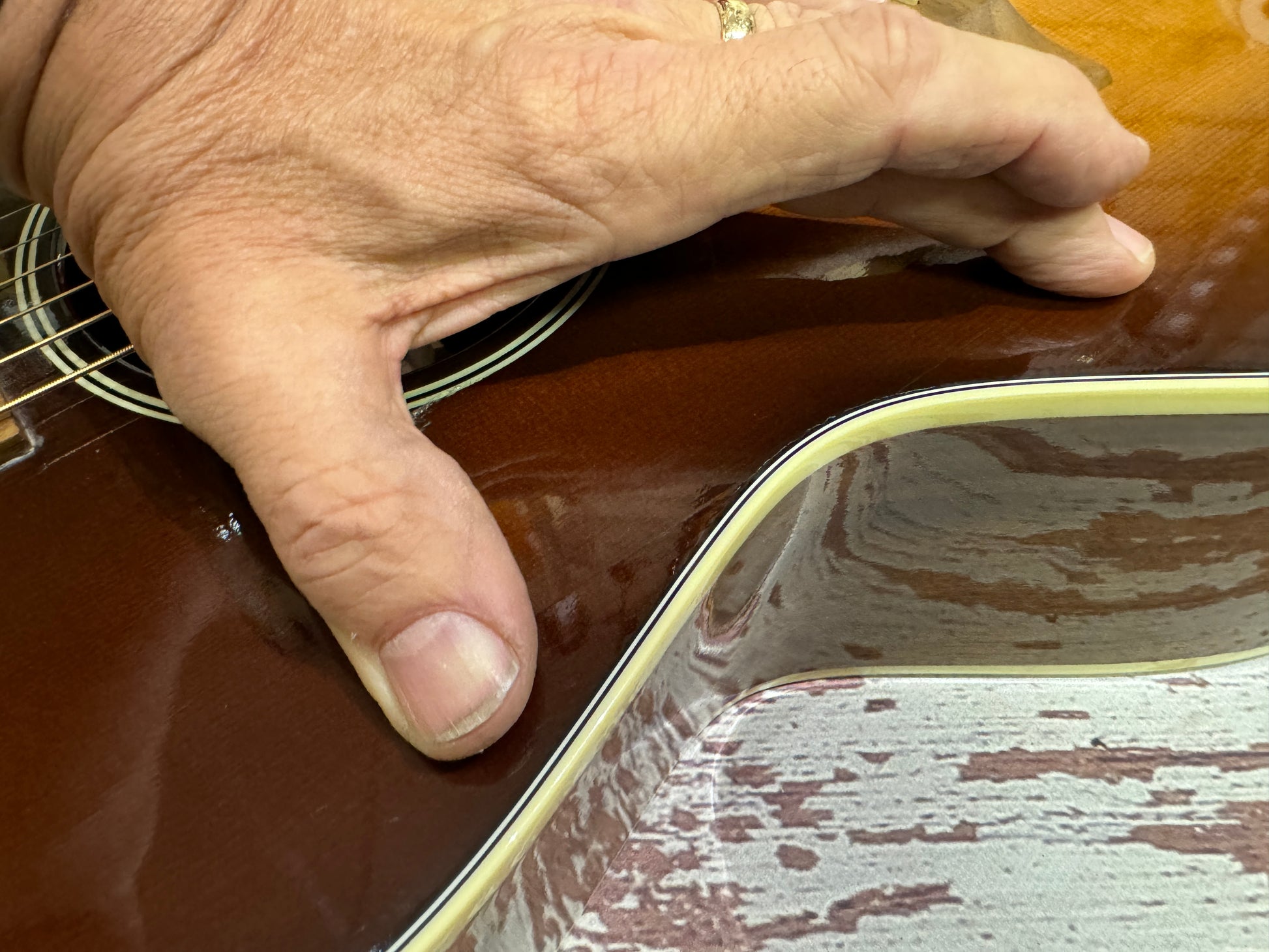 Iy took a blow just by the sound hold, leaving a ding, and a very small hairline split on the very edge of the top, thankfully this is right over 2 braces so it is well supported and held tight. The area running towards the bottom of the guitar has been fixed internally with a bonded fibre gauze across the area, so this is stable.