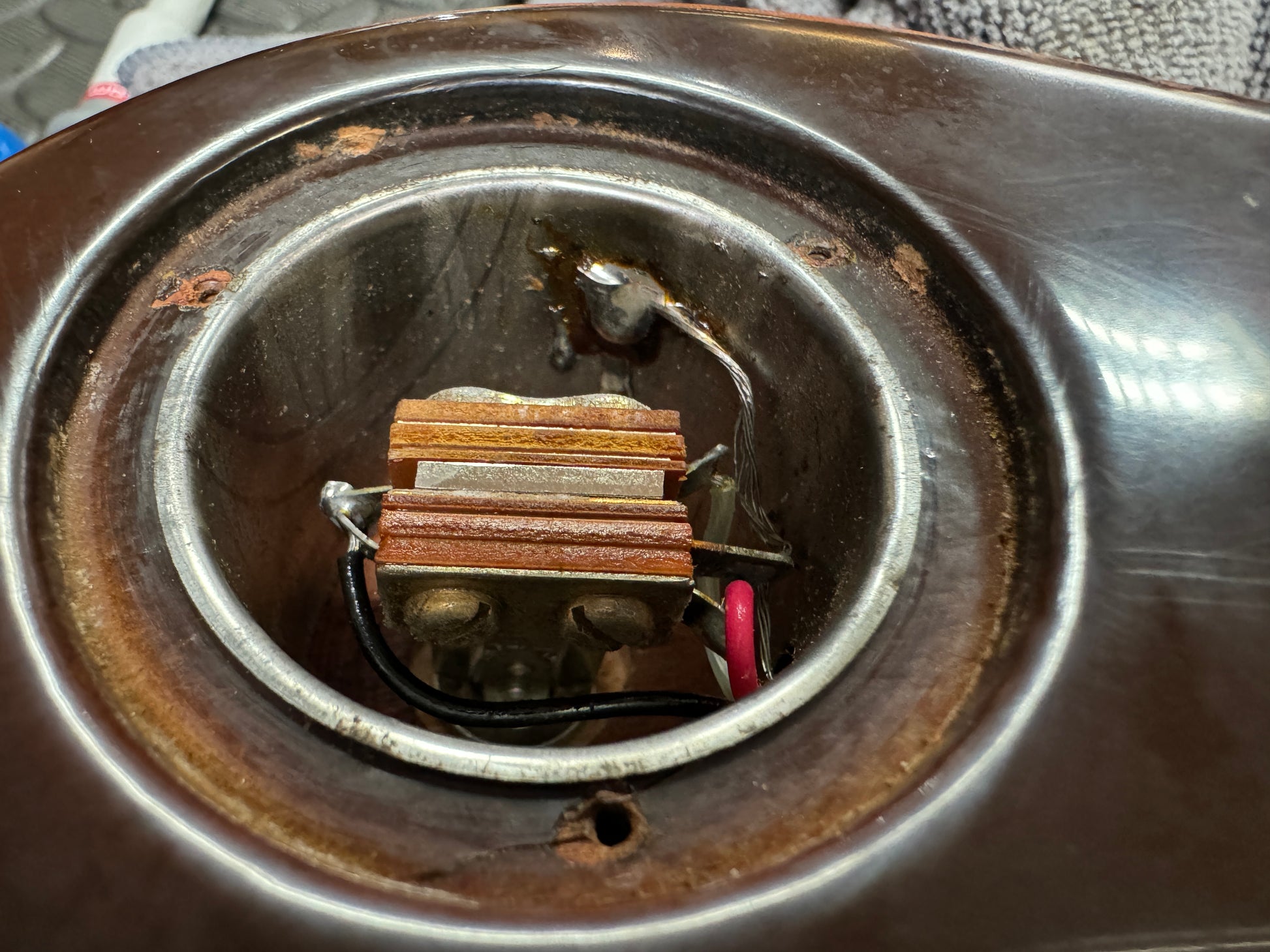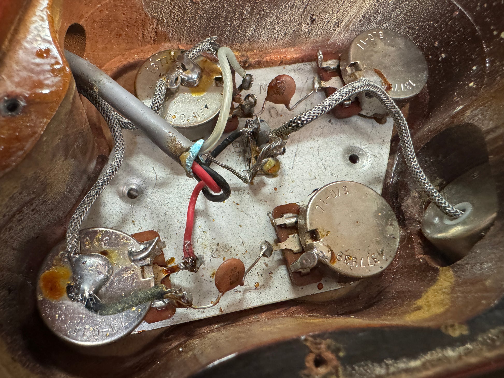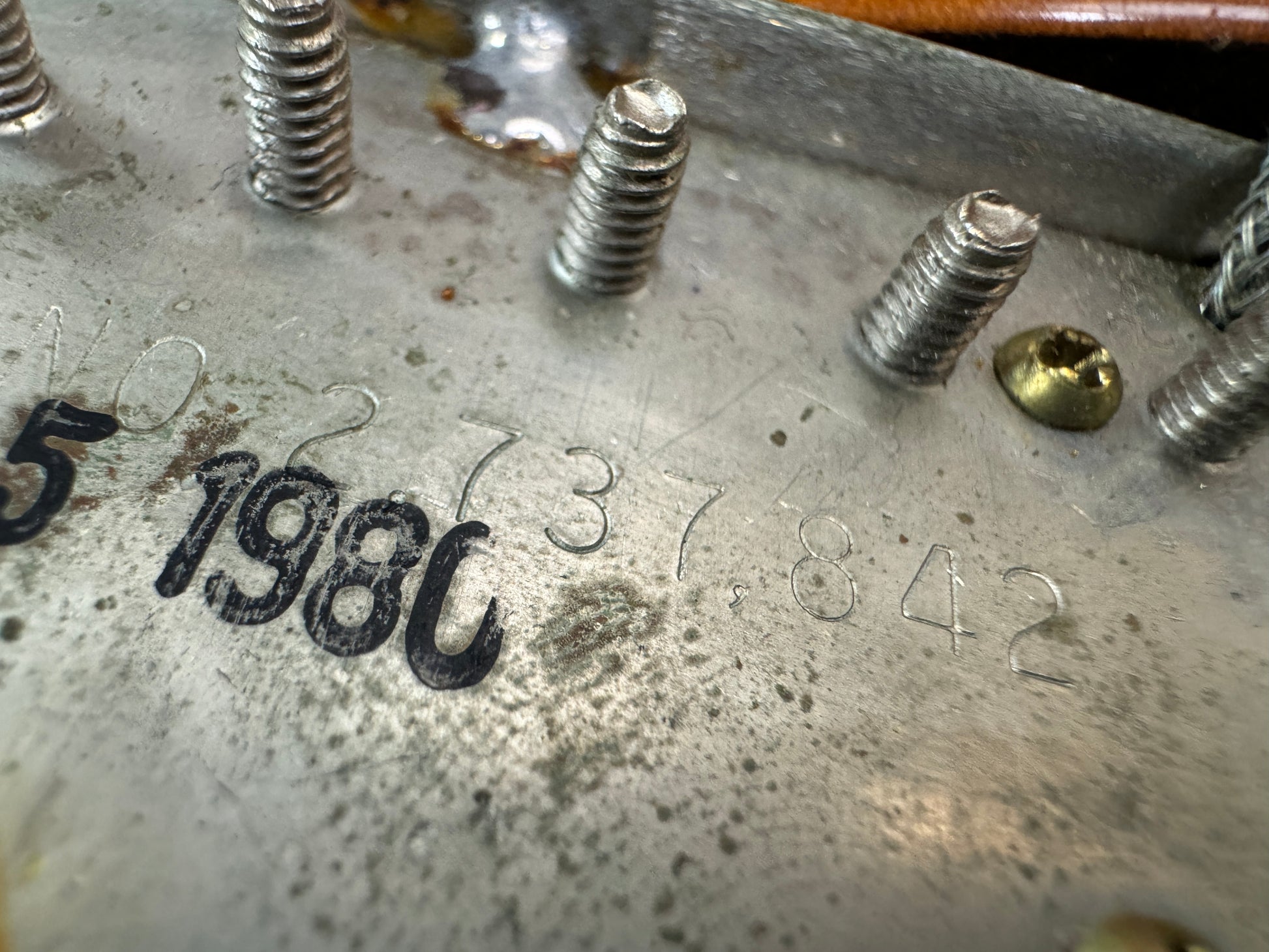 The pickups are stamped within 3 days of each other in July 1980, and the pots '79. The plastic parts and logo have darkened from pub use for many years, the nitro worn through on the neck edged, it has the look the Murphy Labs aim for.