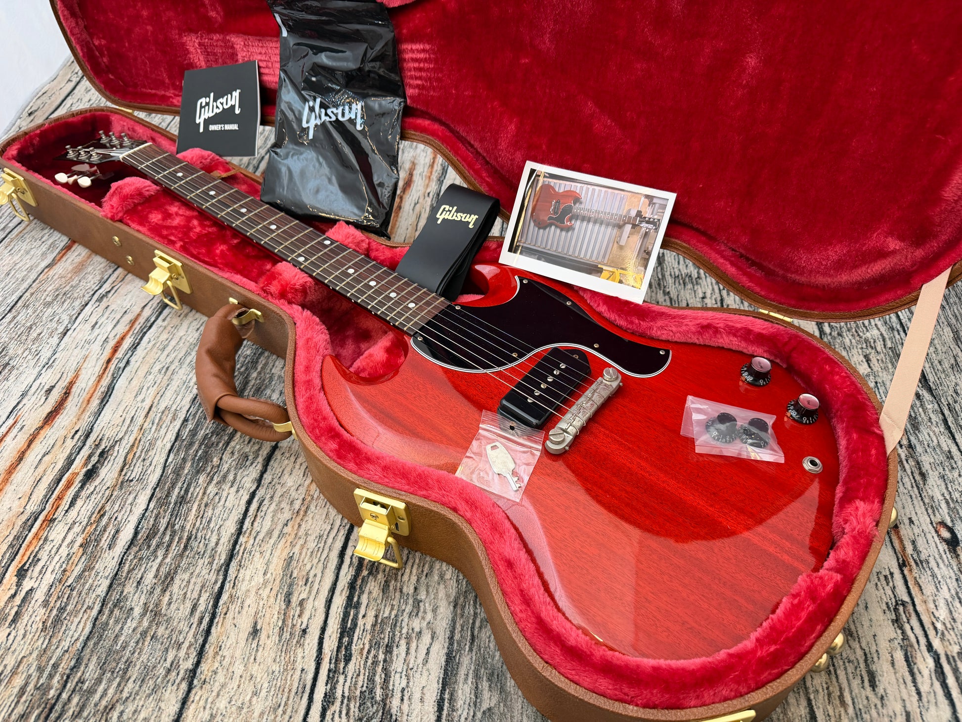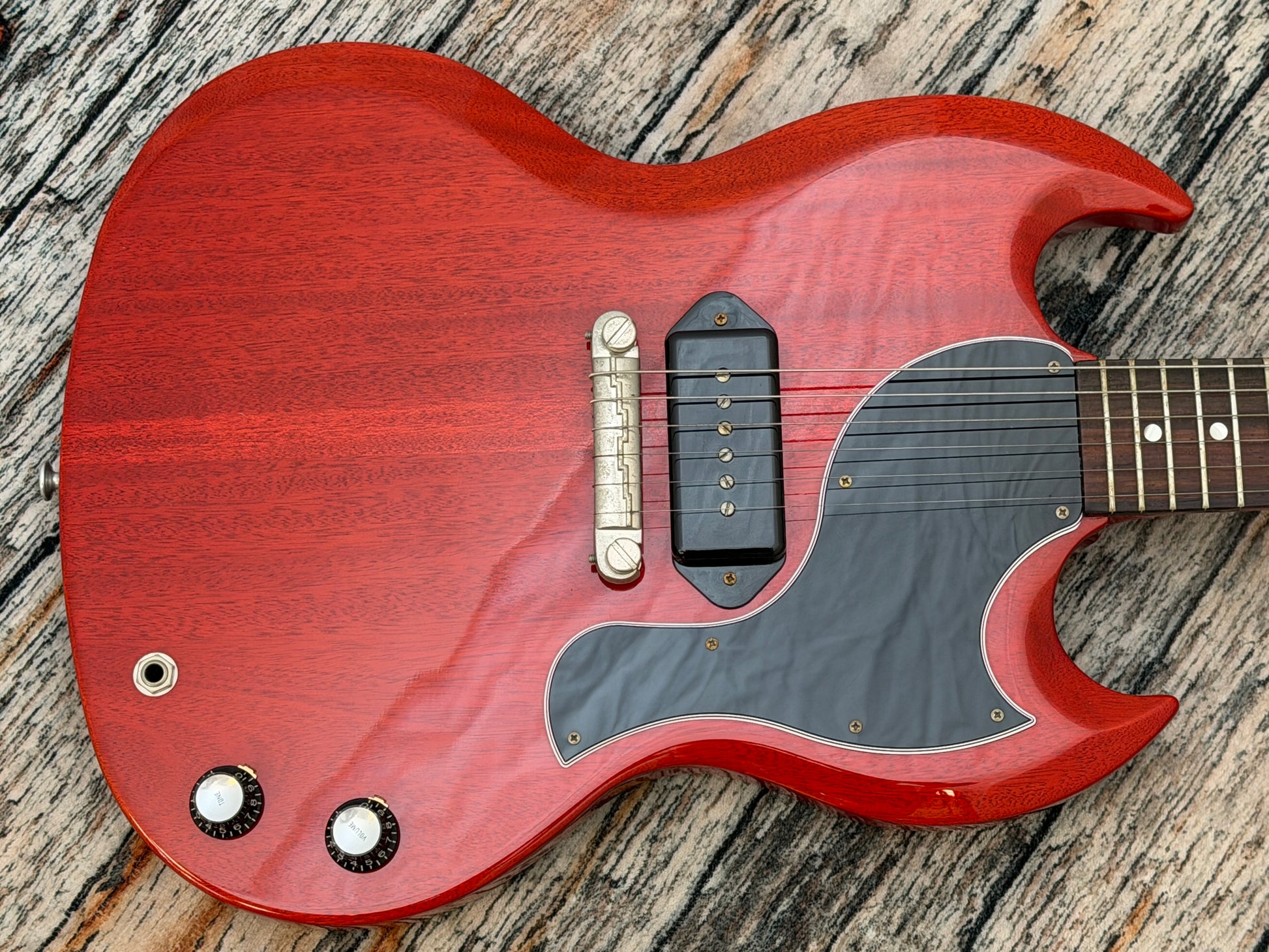 The Gibson SG Junior in Vintage Cherry is a lightweight, stripped-back solid-body guitar featuring a mahogany body with the small guard, a slim taper mahogany neck, and a rosewood fingerboard. It is characterised by a single "dog-ear" P-90 pickup, a compensated wraparound bridge, and simple, raw tone control, often considered a "no-frills" rocker.