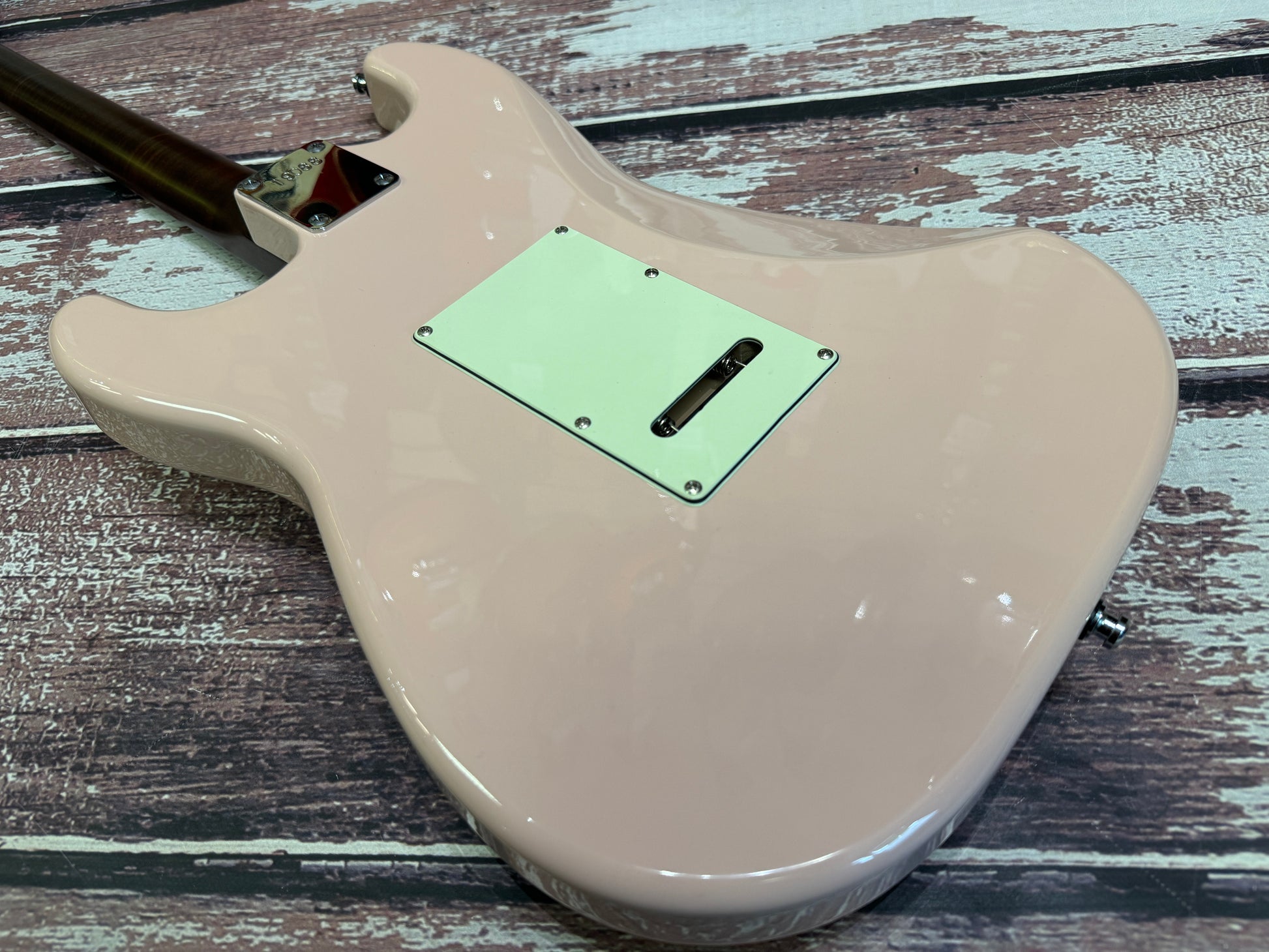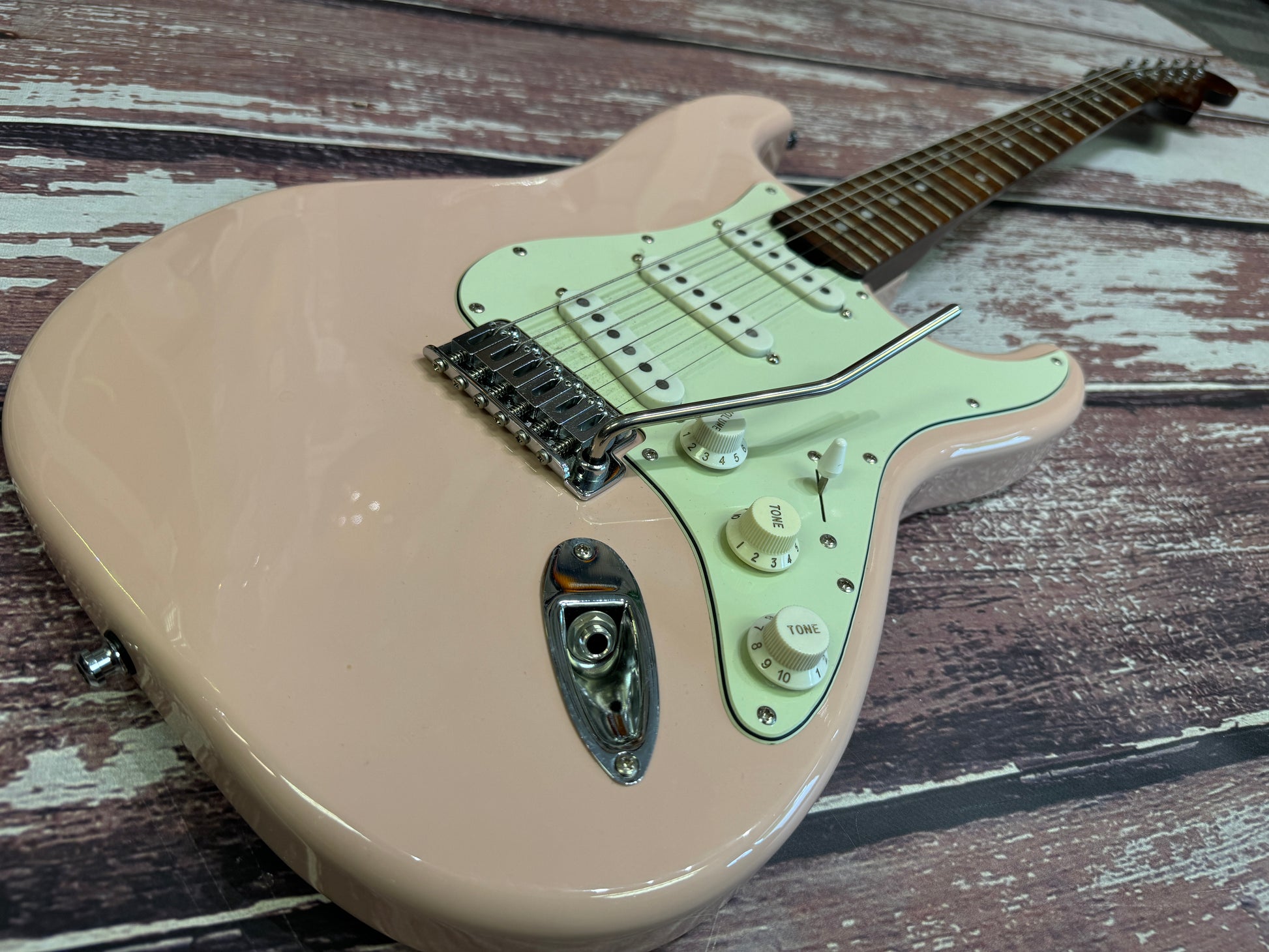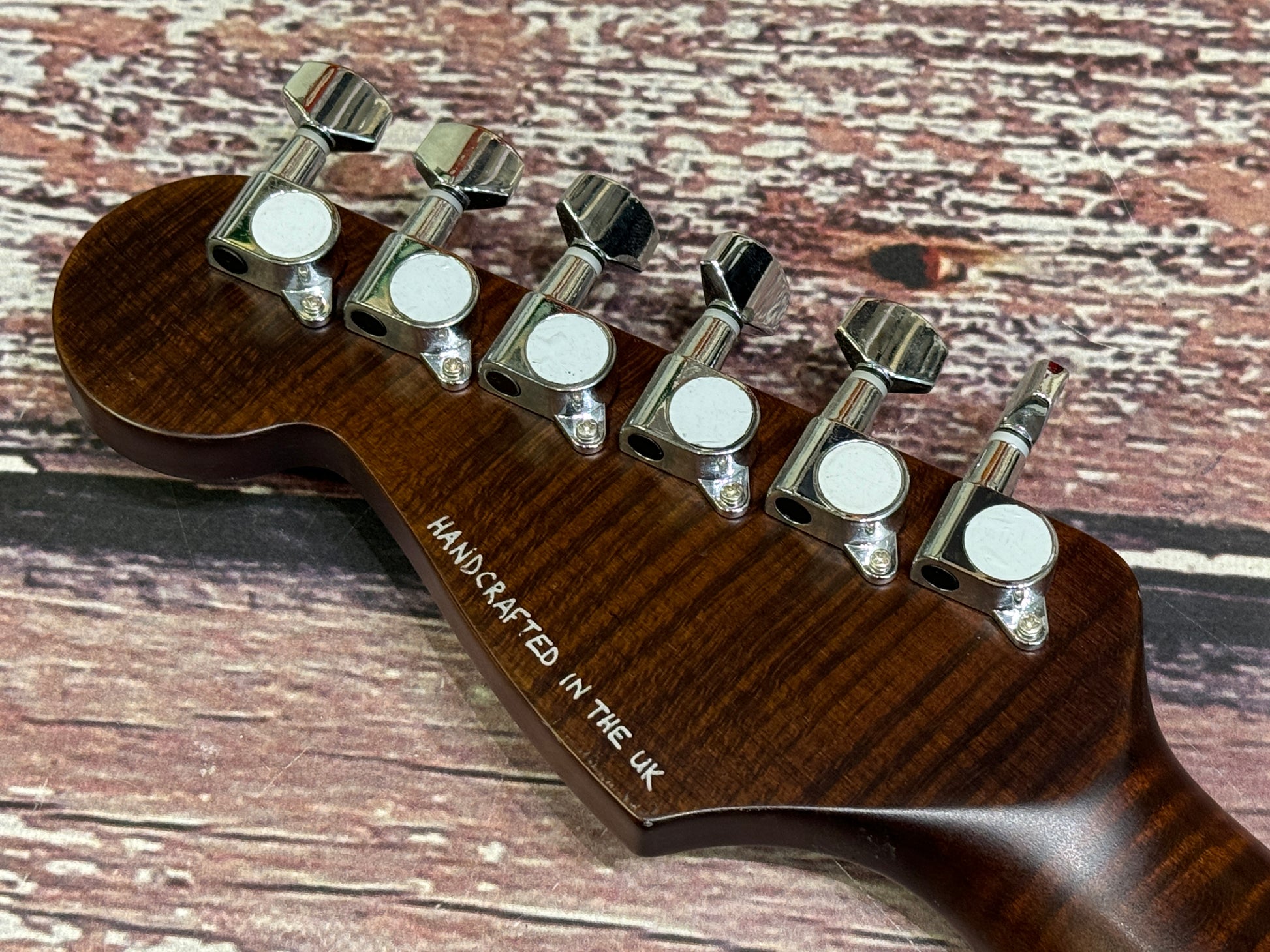 Another from my own guitar rack, this is a rather lovely build, one of the earlier classic "S" models with the MkI headstock. It is finished in glorious shell pink, and don't be fooled by that neck, it is a 5A flamed maple neck, and board, both "deep" roasted. The neck is silky smooth and this is as fine a "S" as you will find.