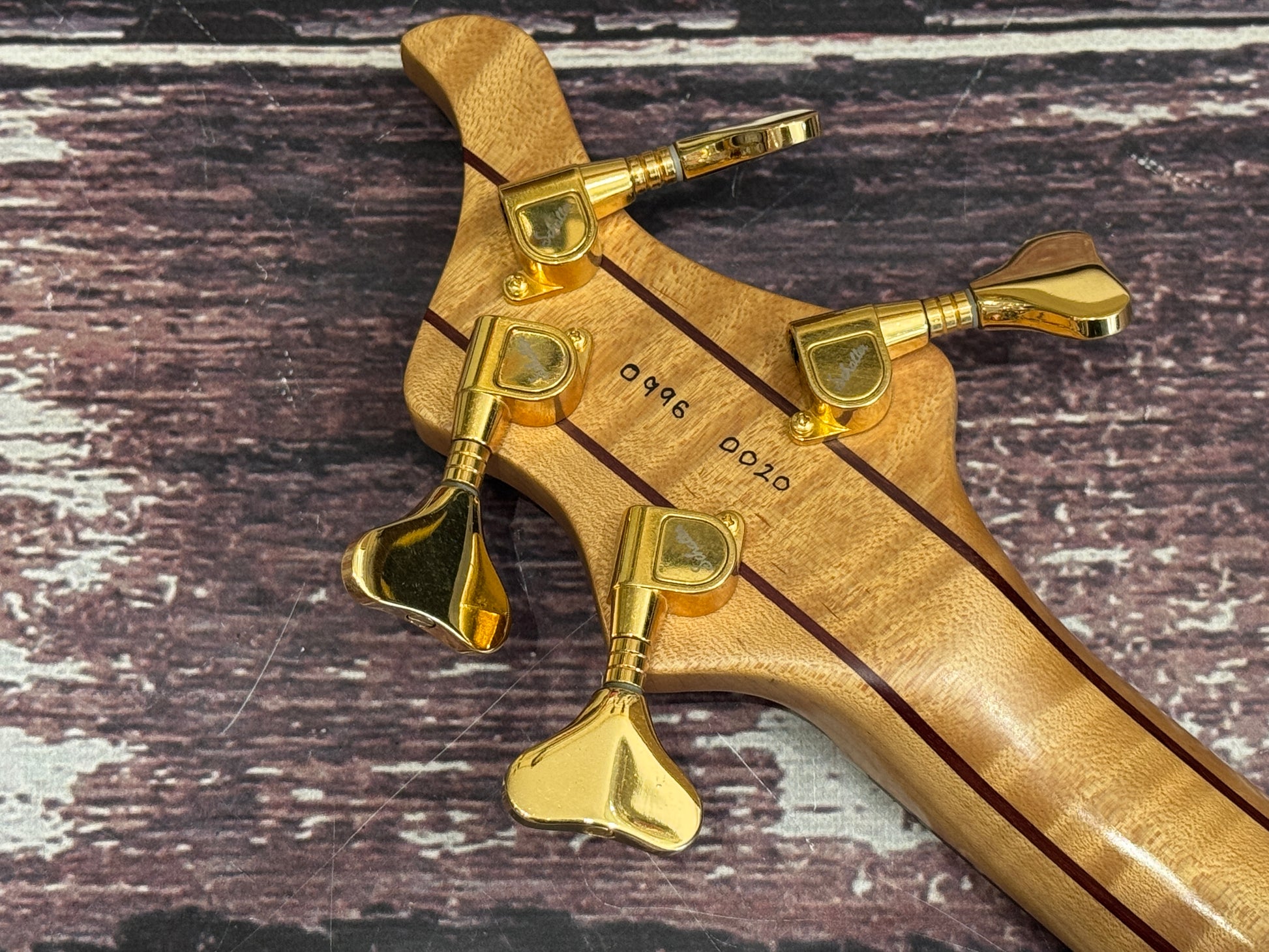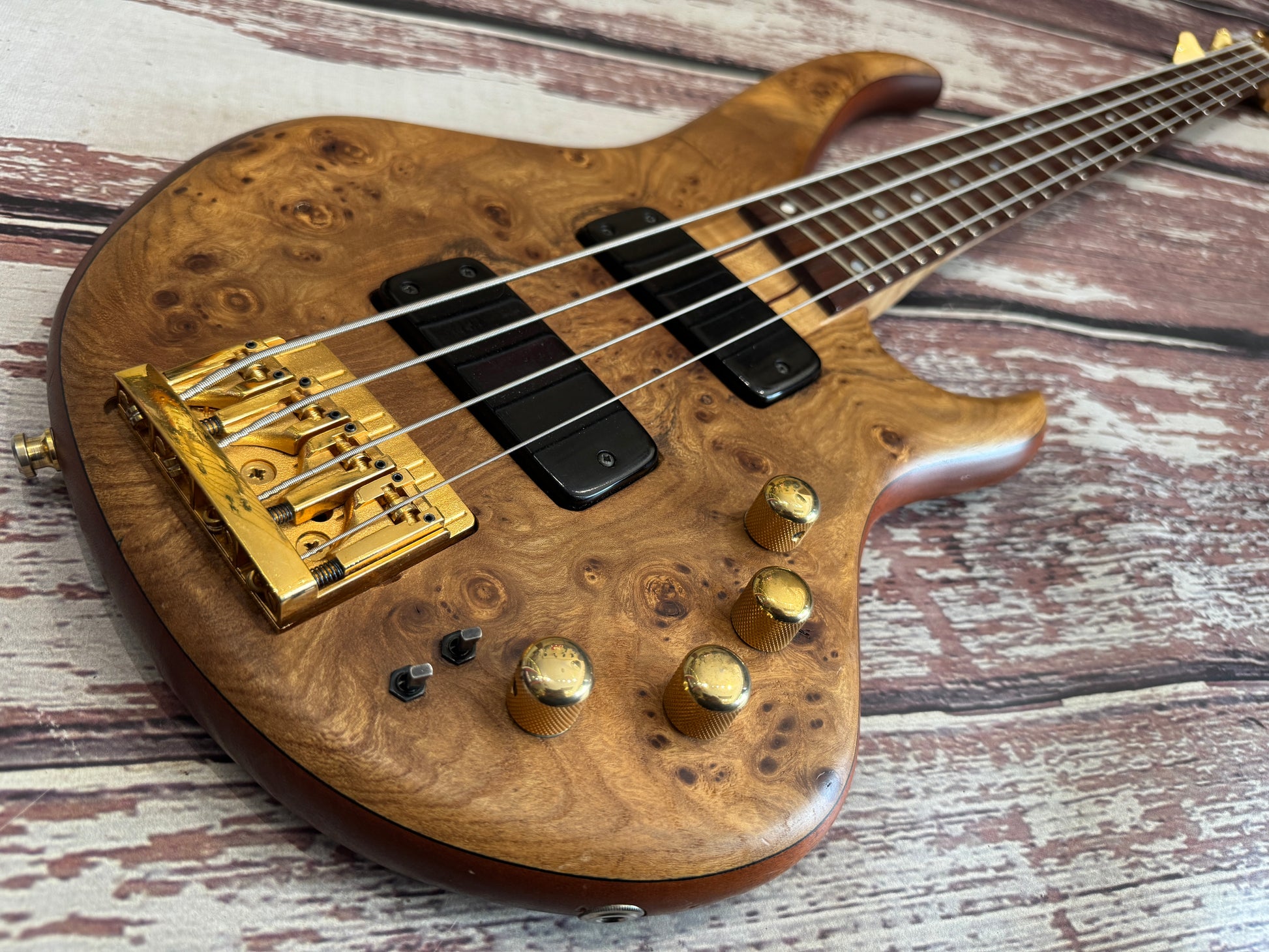 With a great choice of burr and highly flamed timbers this bass was always going to be a stunner! I think this is from 2009, it has a pair of humbuckers running through an active circuit. The controls are master volume, pickup blend, bass and treble. There are then 2 mini toggles which split each pickup down to one side only (single coil)