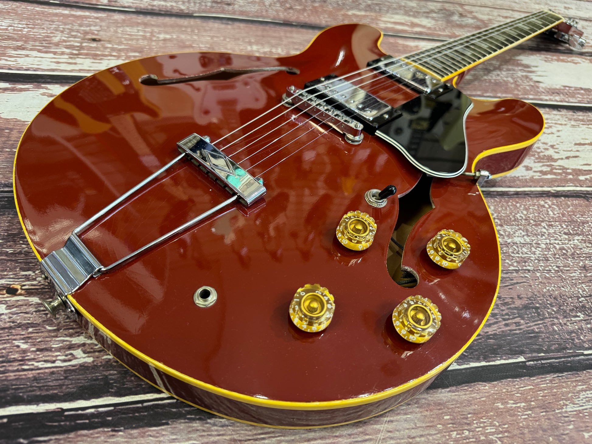 Now this is an incredibly rare beast indeed. Some of the best guitars made came from the Matsumoku and Fujigen Japanese factories in the 70's, and this example is from the pinnacle era. This is a SA-550, a fully hollow twin humbucker guitar with trapeze tailpiece.
