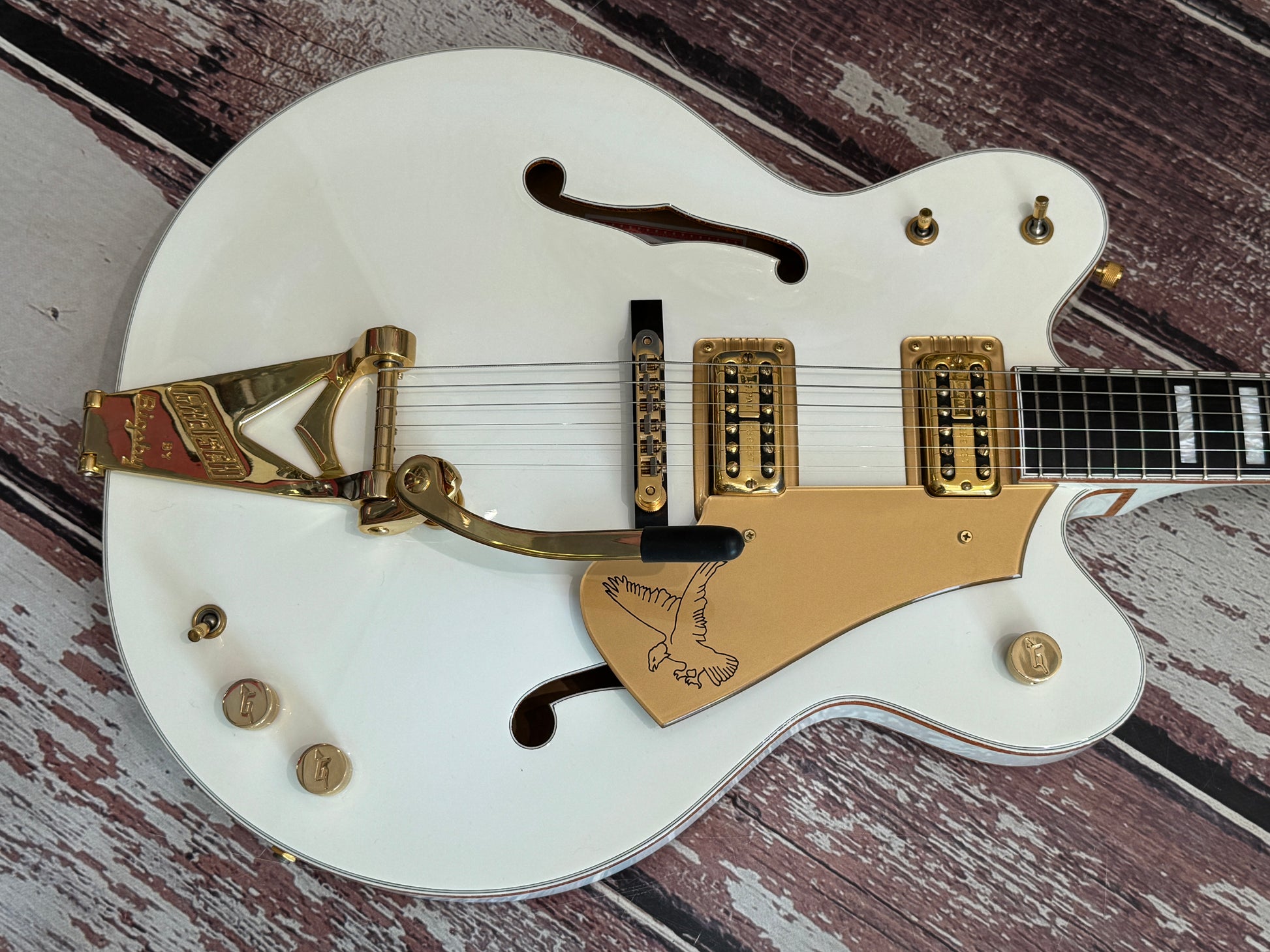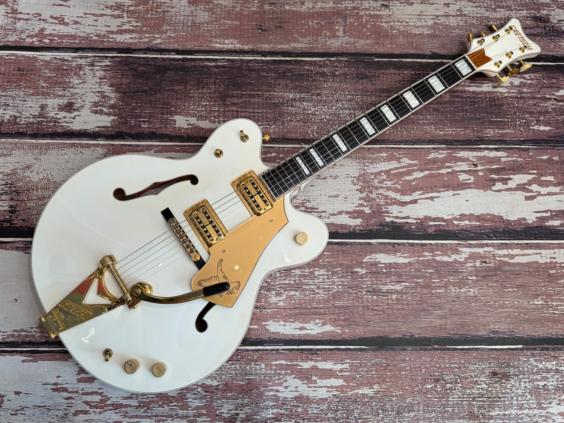 A showpiece guitar, the White Falcon turned so many heads at the 1954 summer NAMM that it was rushed into production the following year. As with most models, it underwent a few changes with the double cutaway design being introduced in 1962.