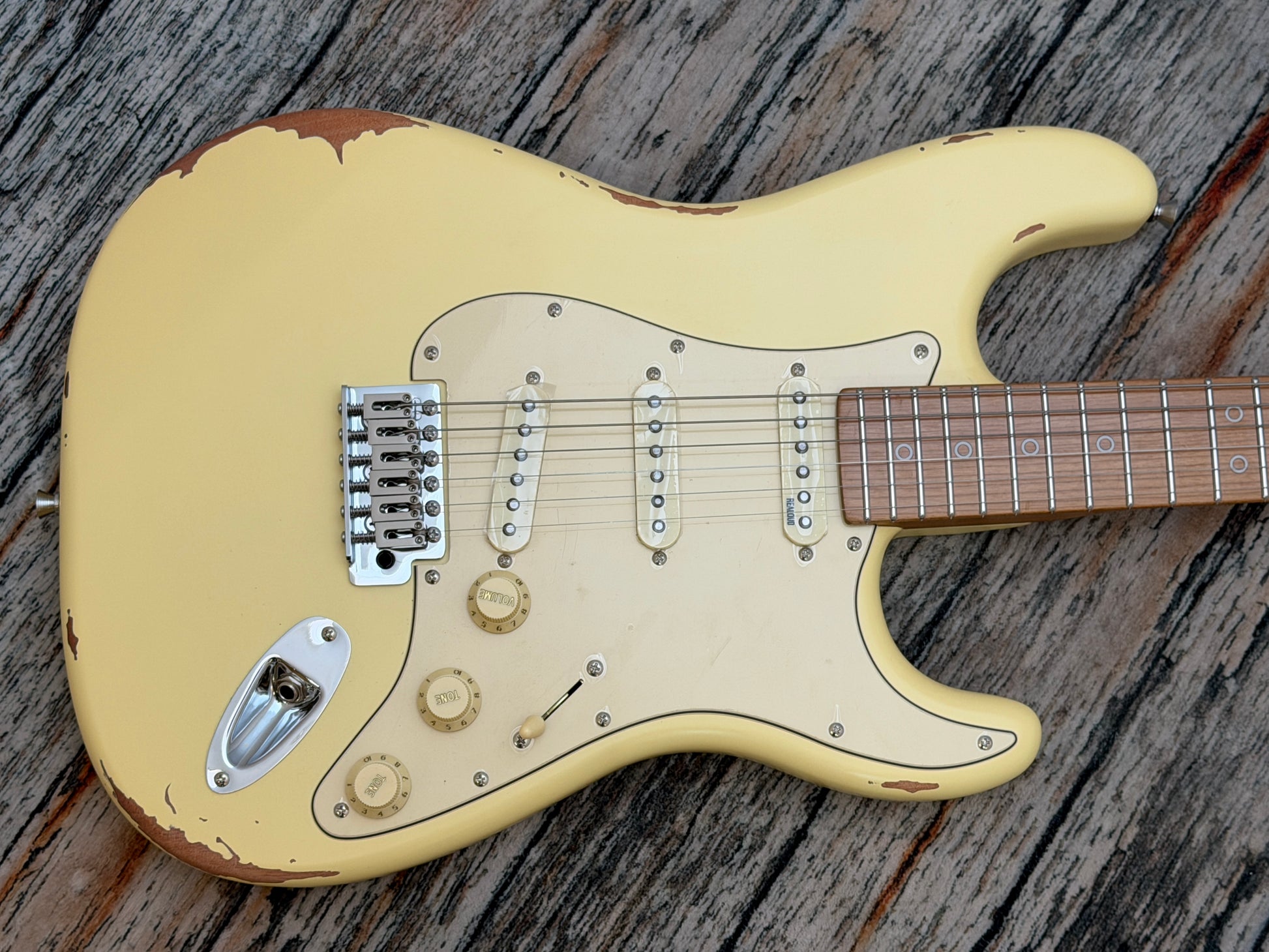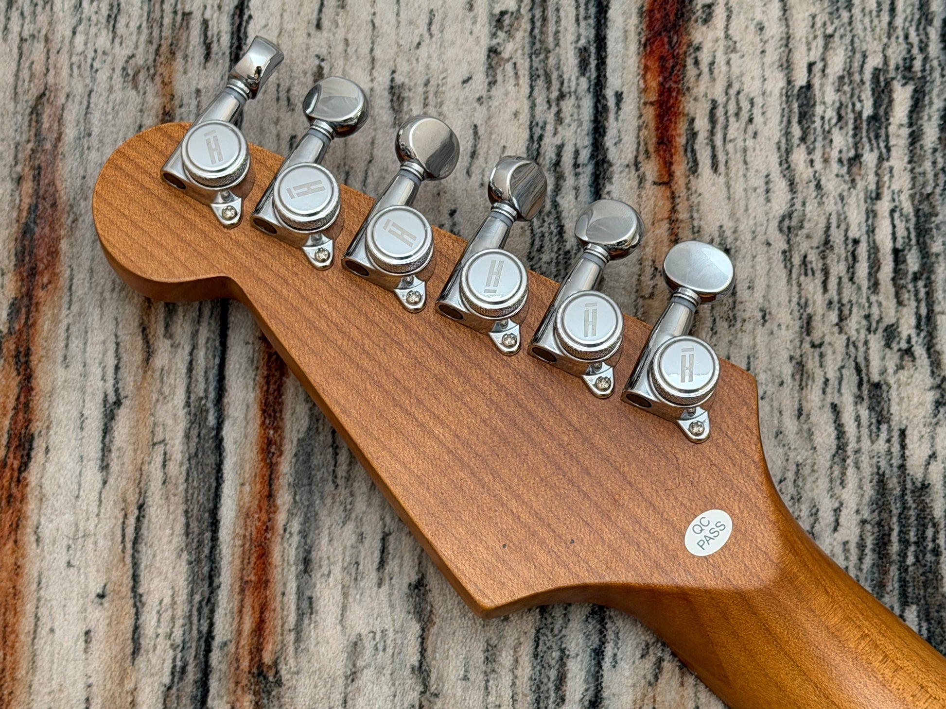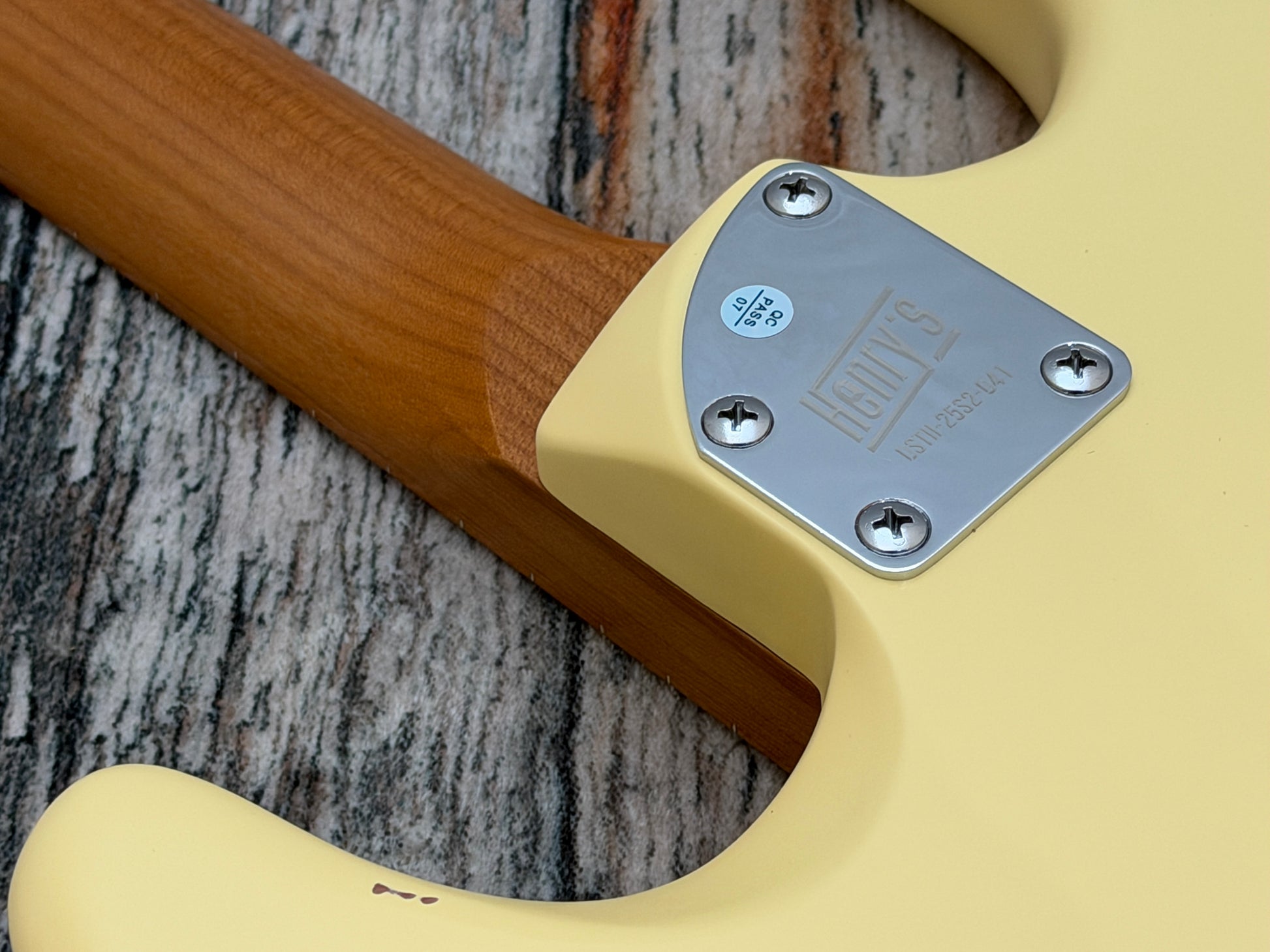The SSS pickup configuration delivers a trio of expressive single coils with a bright, distinctive sound. The guitar is finished with a signature Henry’s "Realaud" pickups.