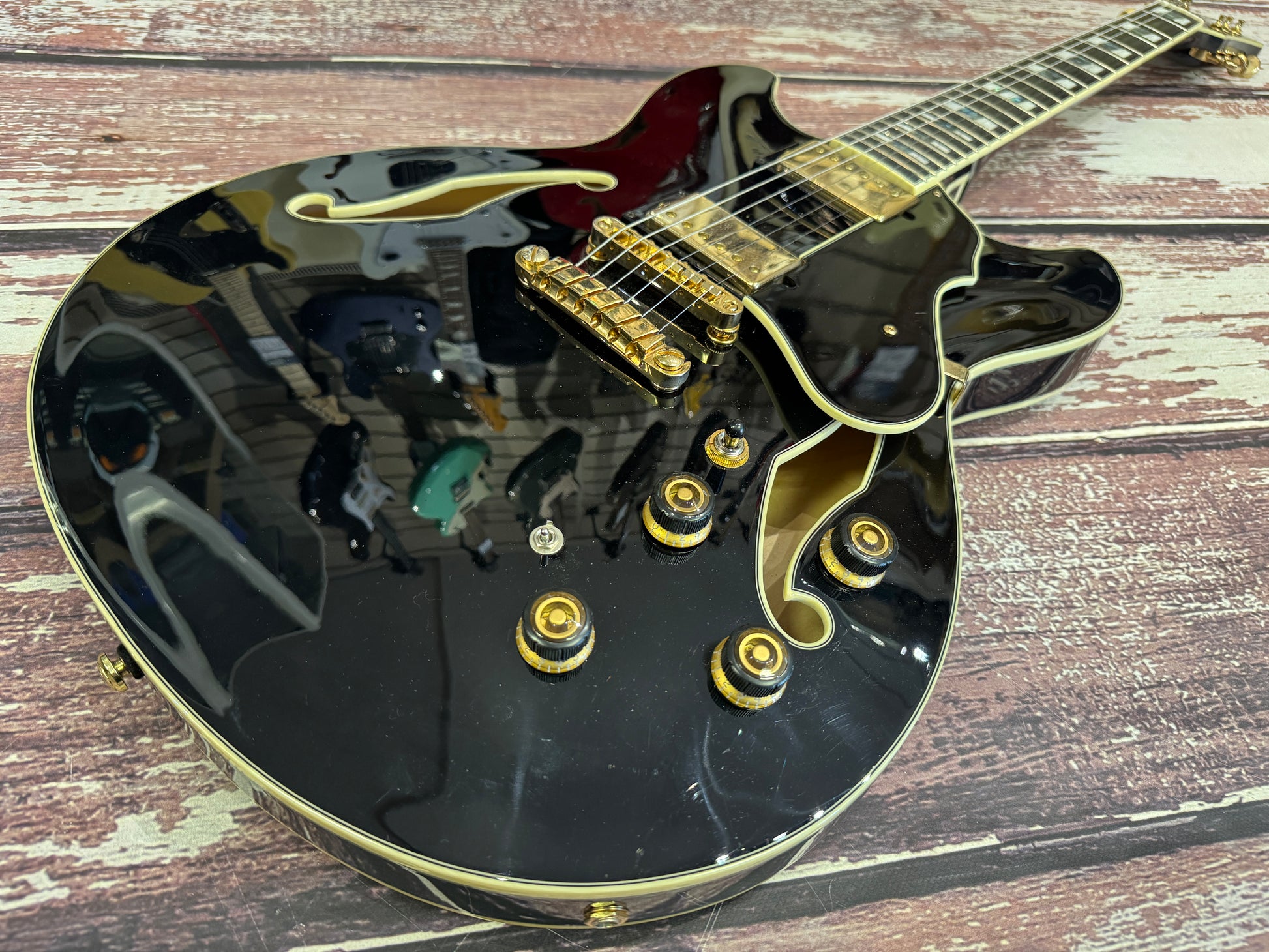 From the higher end of the semi hollow range made by Ibanez, this is the very well appointed AS-153 in gloss black. These boast a pair of the fabulous super 58 humbuckers and an ebony board.