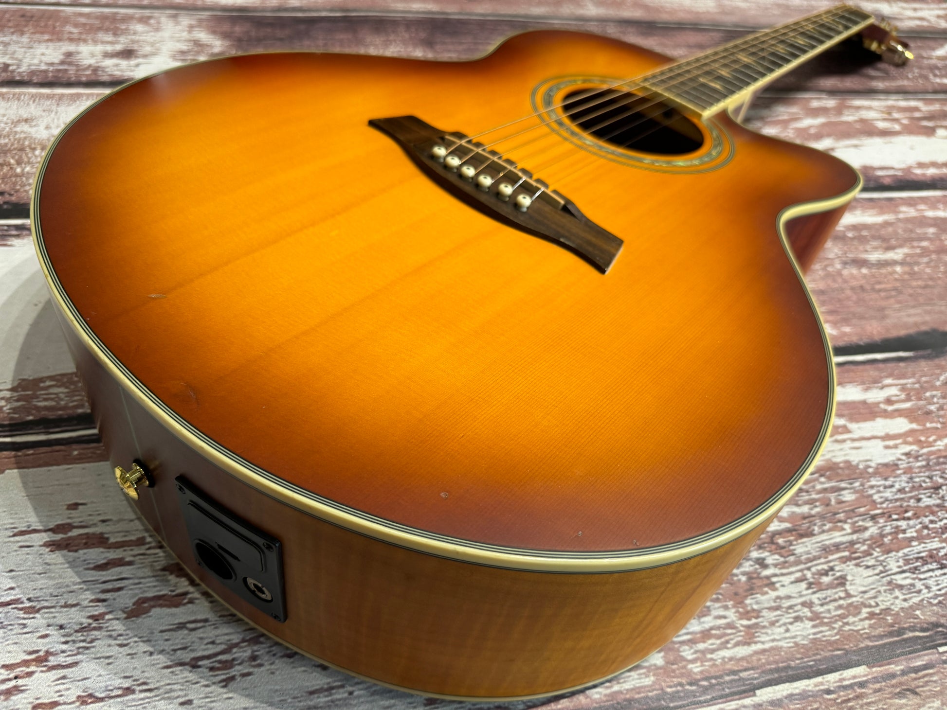 The Ibanez AEL40SE RLV features flamed sycamore back & sides with a solid spruce top complete with an ultra thin "resonant" finish to enhance natural wood vibration and provide more projection and volume.
