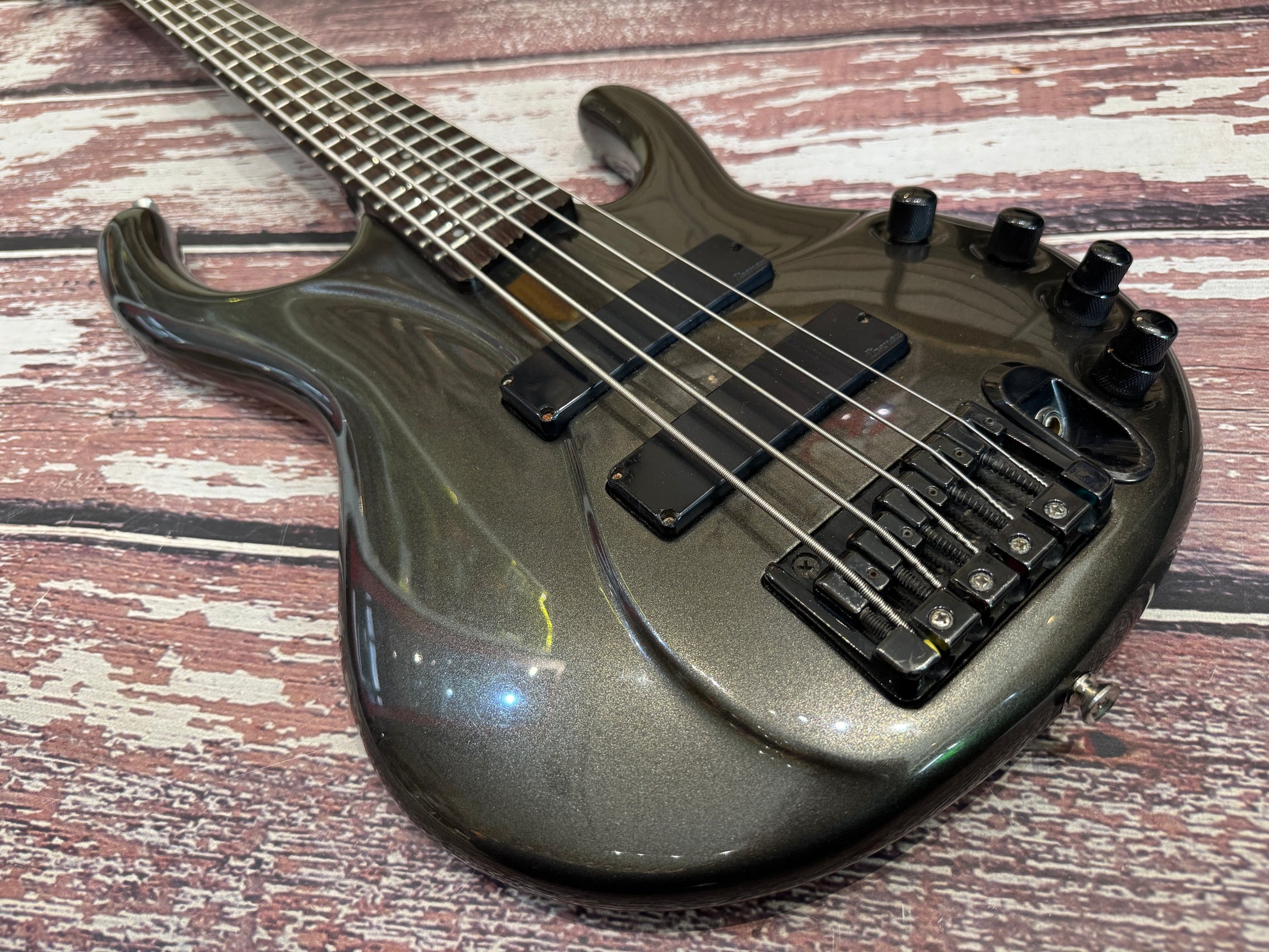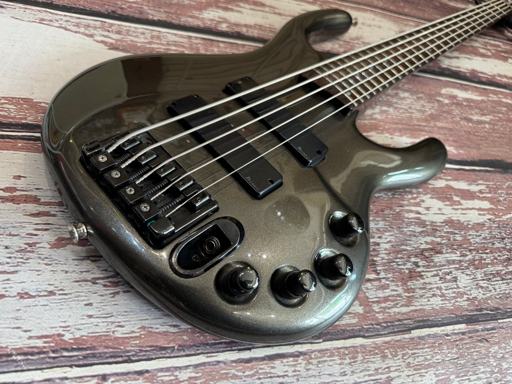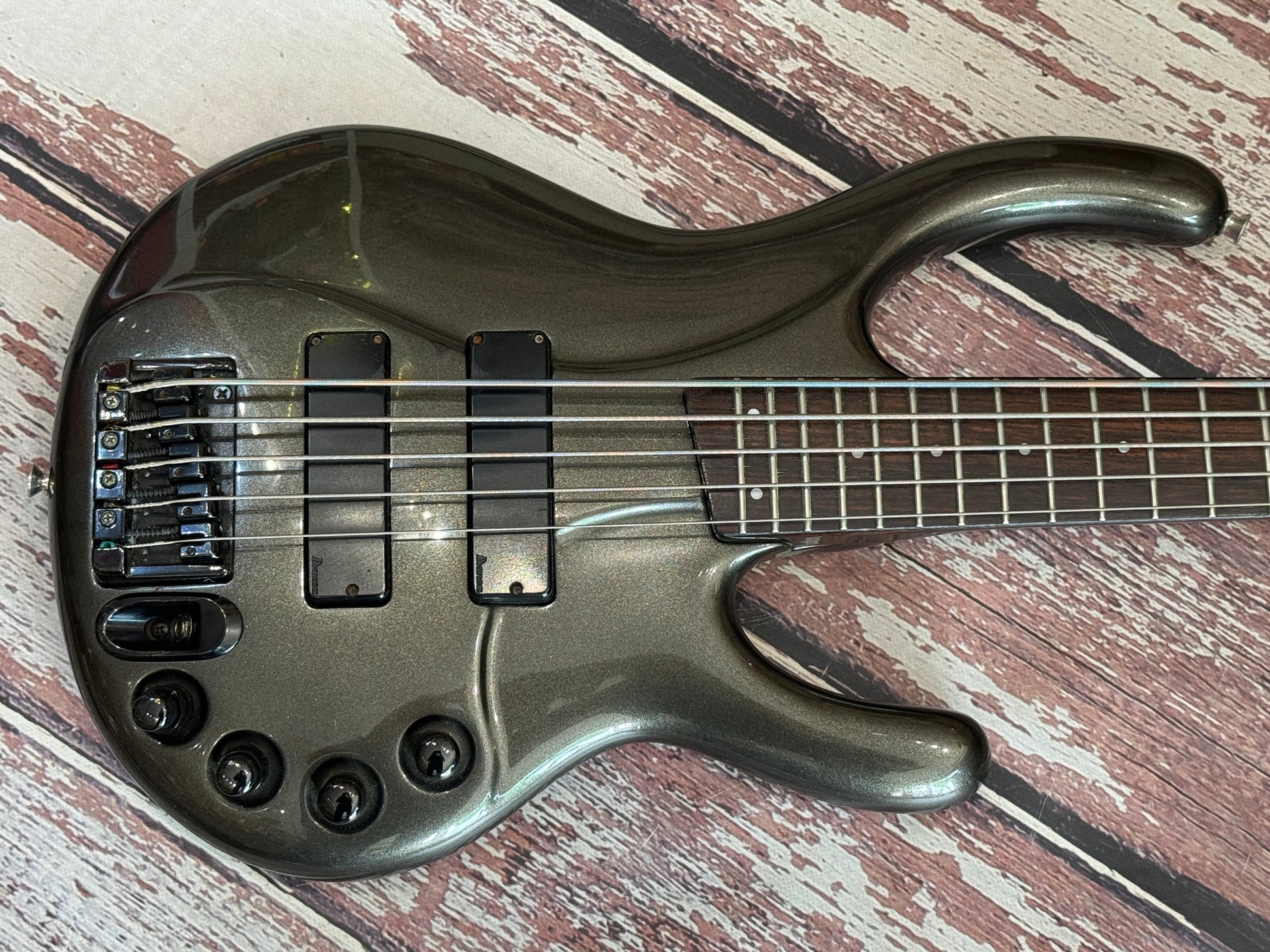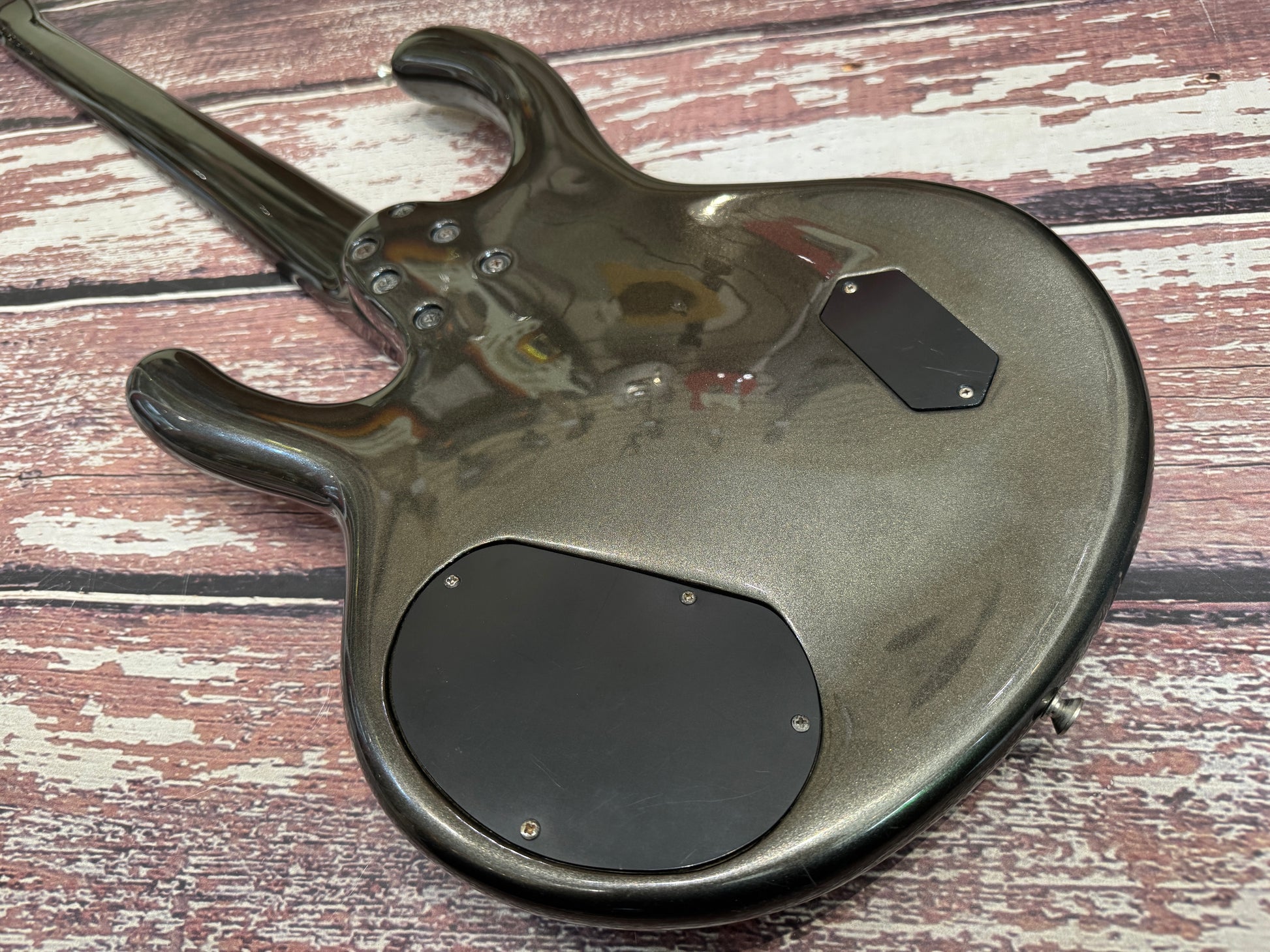 This beast features a double-cutaway sculpted luthite body with a long upper horn for balance, a bolted to a maple neck with a 24-fret maple fingerboard with white dot position markers and a matching headstock. Components include a pair of Ibanez SFR-S (N/B) passive pickups with a Vari-mid preamp with a 3-band EQ, an Accu-cast B25 fixed bridge with 16.5mm string spacing, a plastic nut, black hardware and Ibanez die-cast tuning machine.