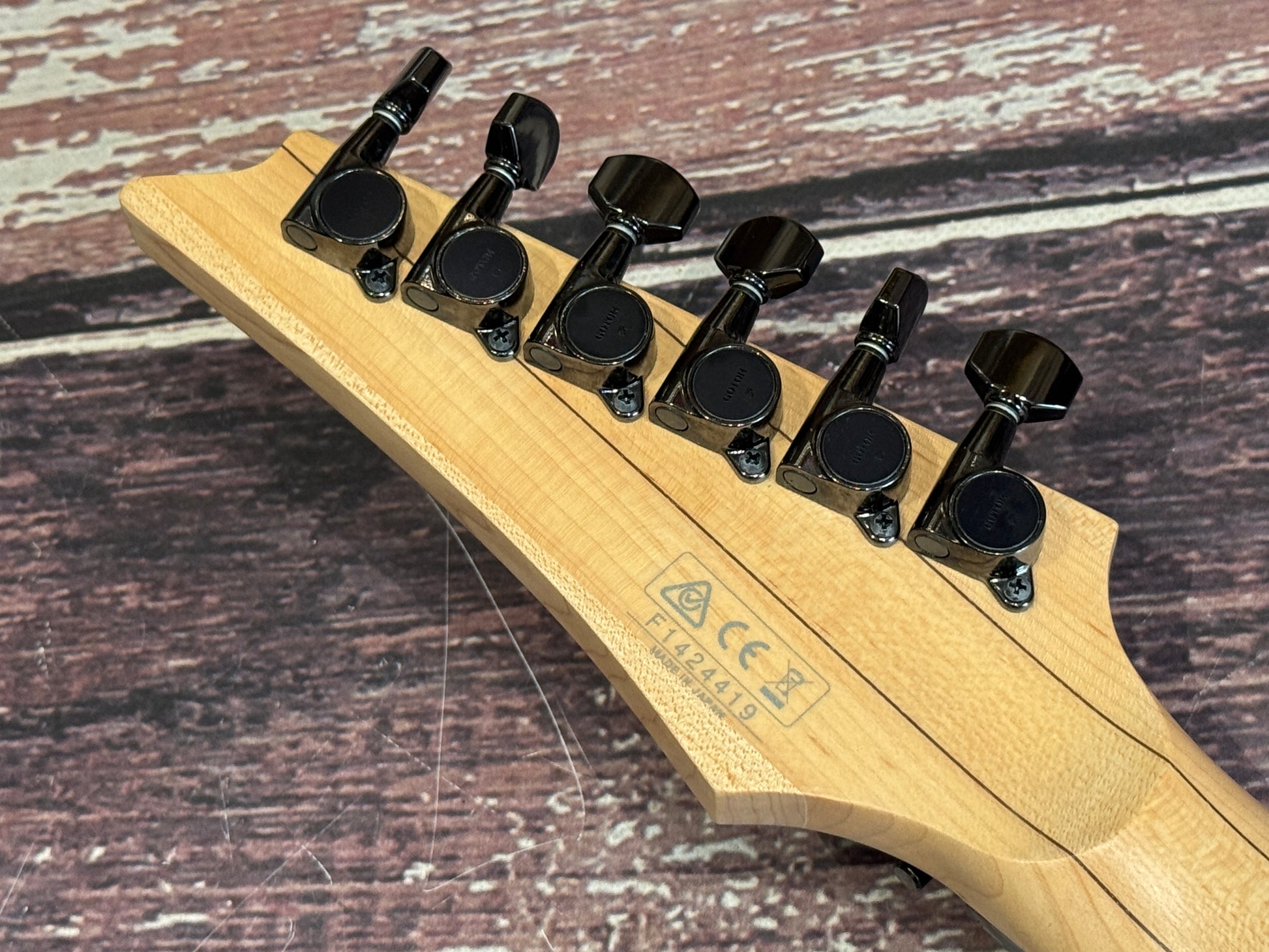 The RG655 features a basswood body with a maple and walnut Super Wizard HP neck with a 24-fret rosewood fingerboard with dot position markers. Components include an original Edge double locking tremolo bridge with a locking nut, pickguard-mounted DiMarzio pickups with a pair of humbuckers flanking a single-coil and Gotoh tuning machines.
