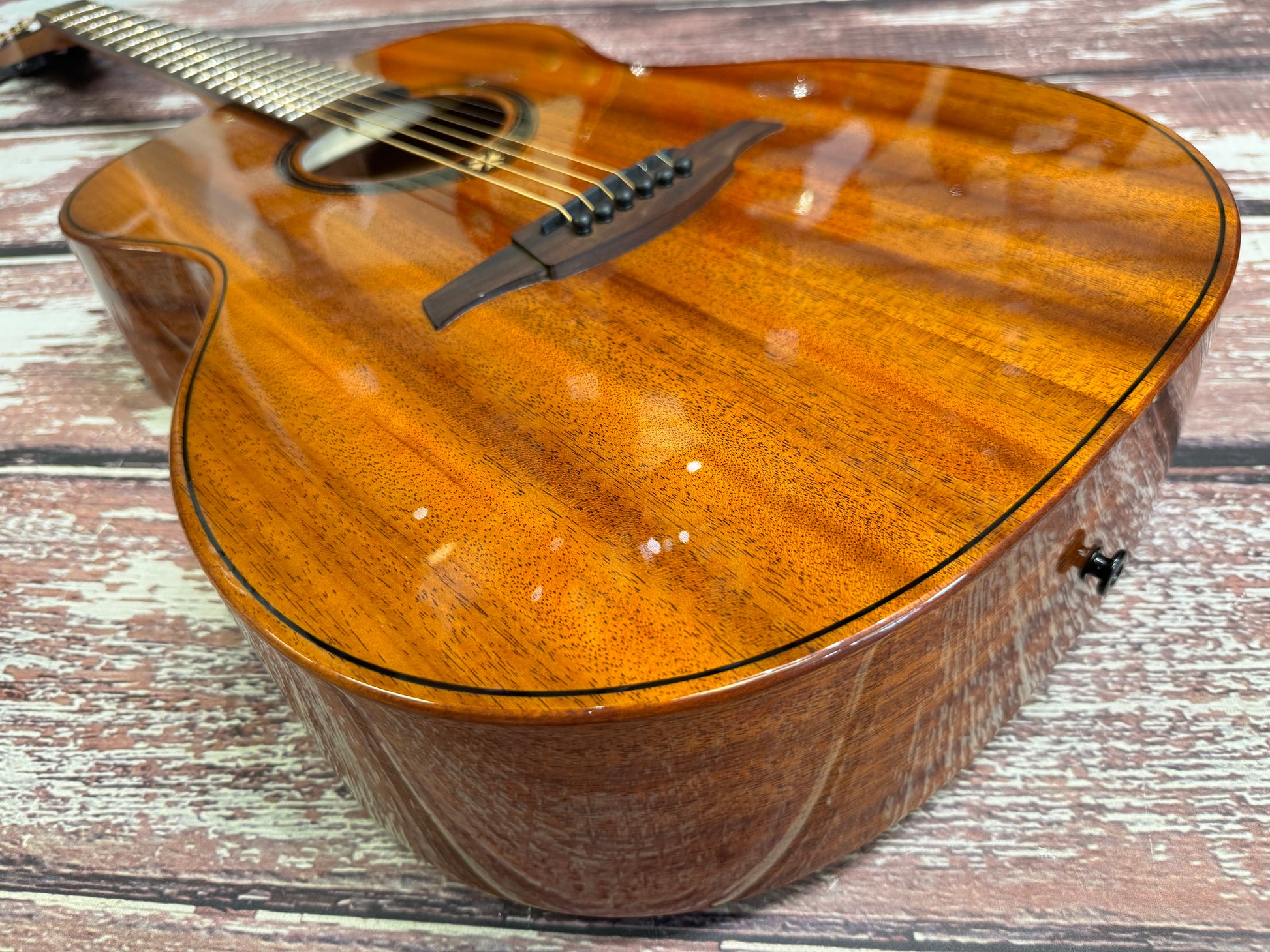 Here we have a very clean used LAG acoustic, the smaller body solid top T98.The Tramontane T98A is a splendid example of an all-mahogany guitar, meaning that both the top and the back and sides are made of this well-loved tone wood.