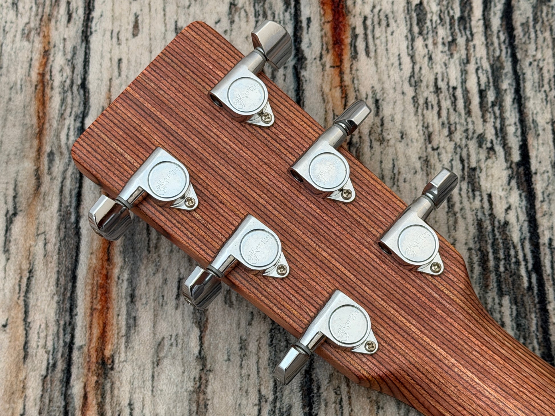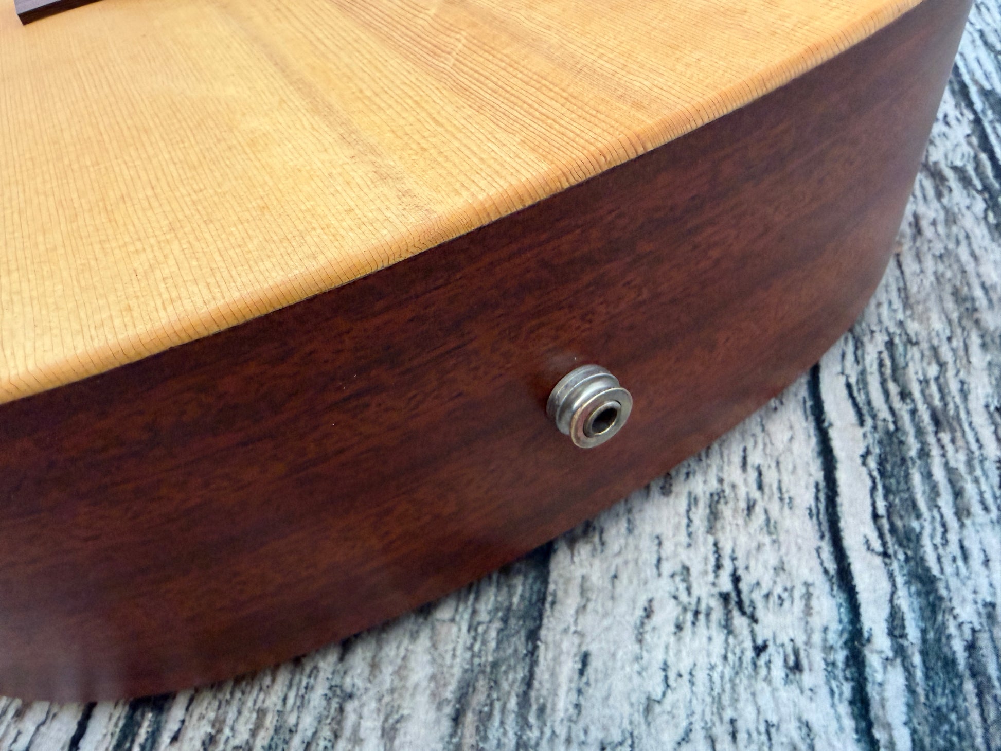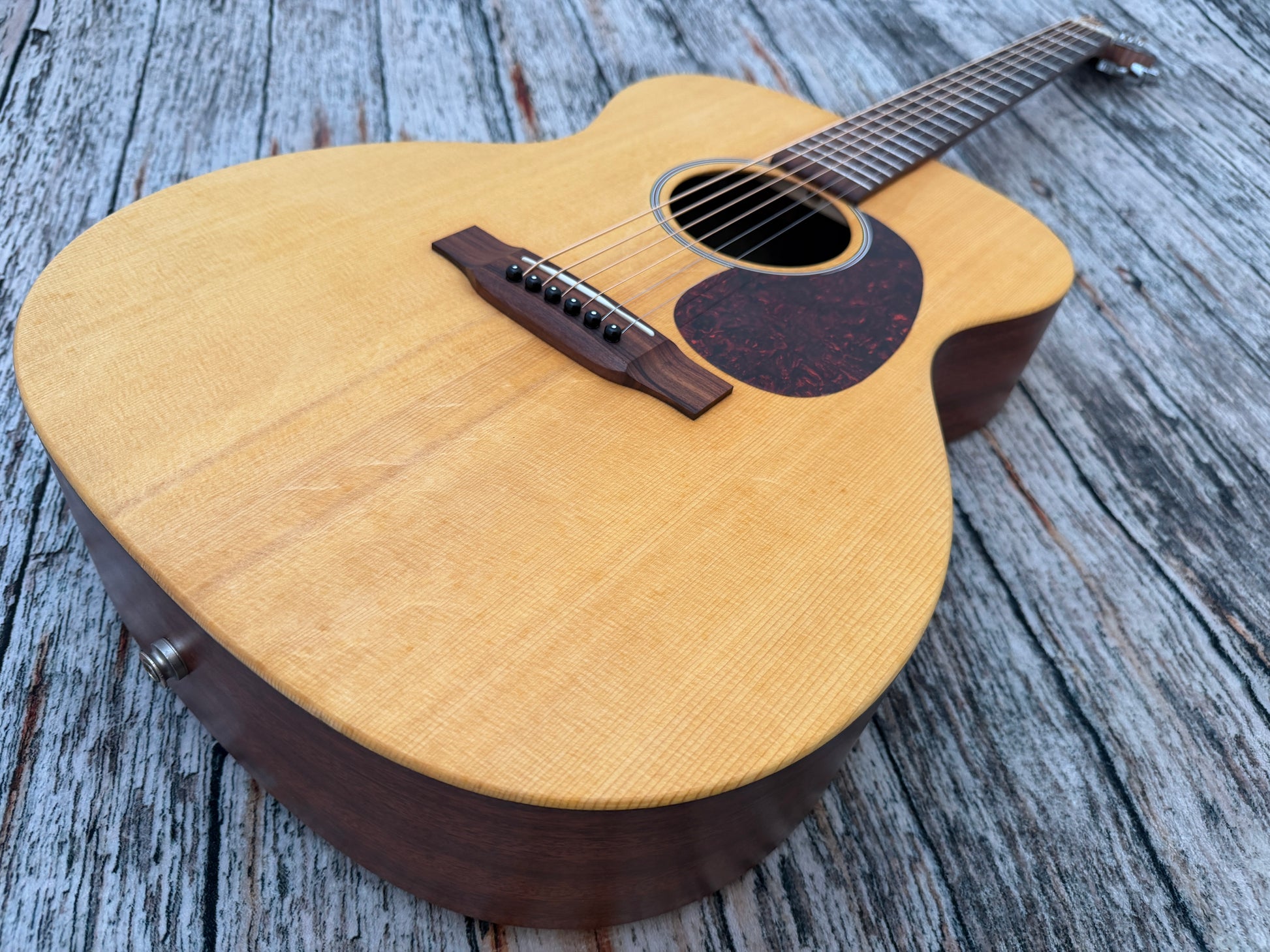 This OOO-X1 has a pickup fitted with the jack on the strap button and internal battery pouch. This is a soild top medium size acoustic with HPL back and sides and an ultra strong "Stratabond" birch laminate neck.