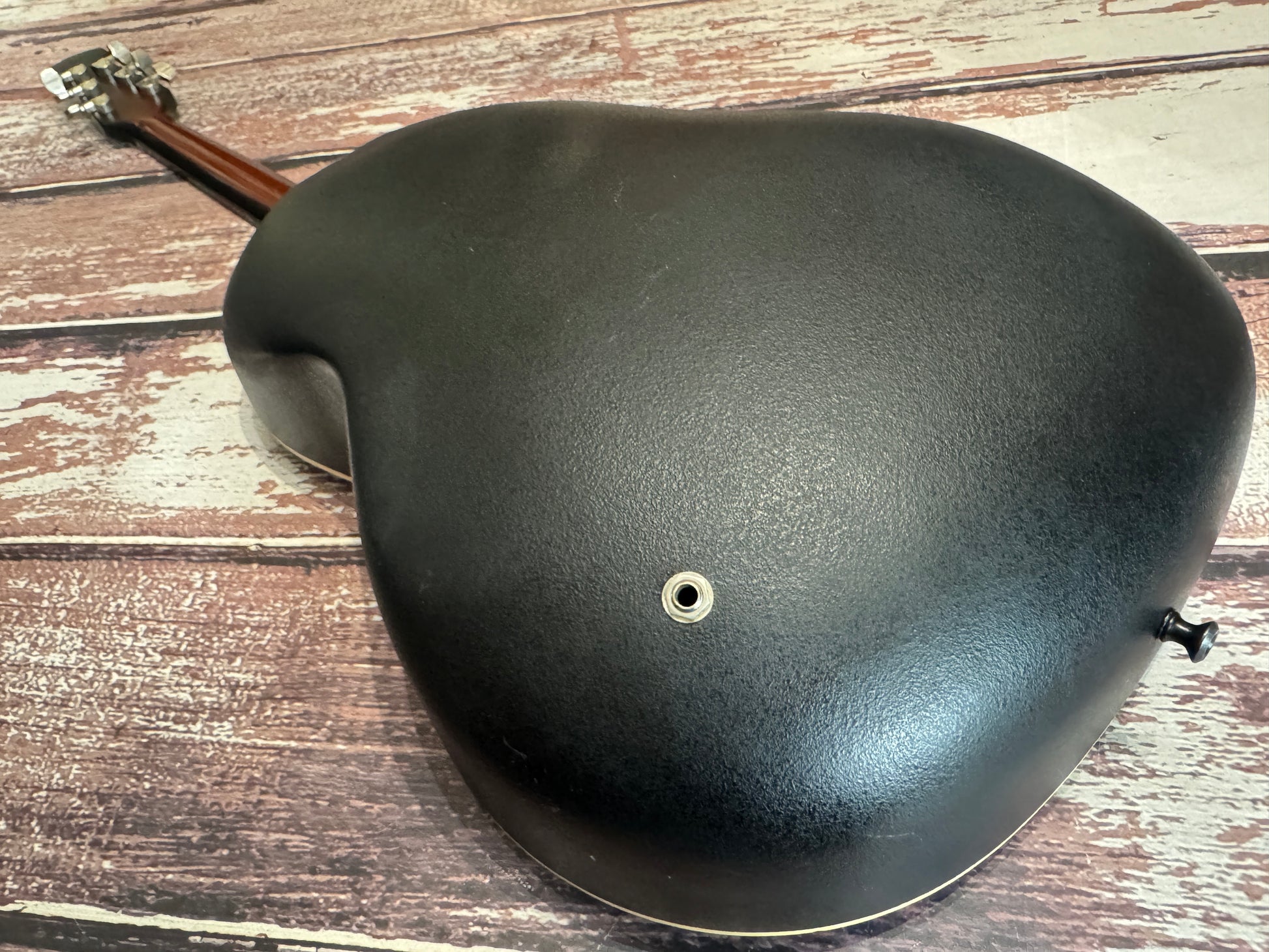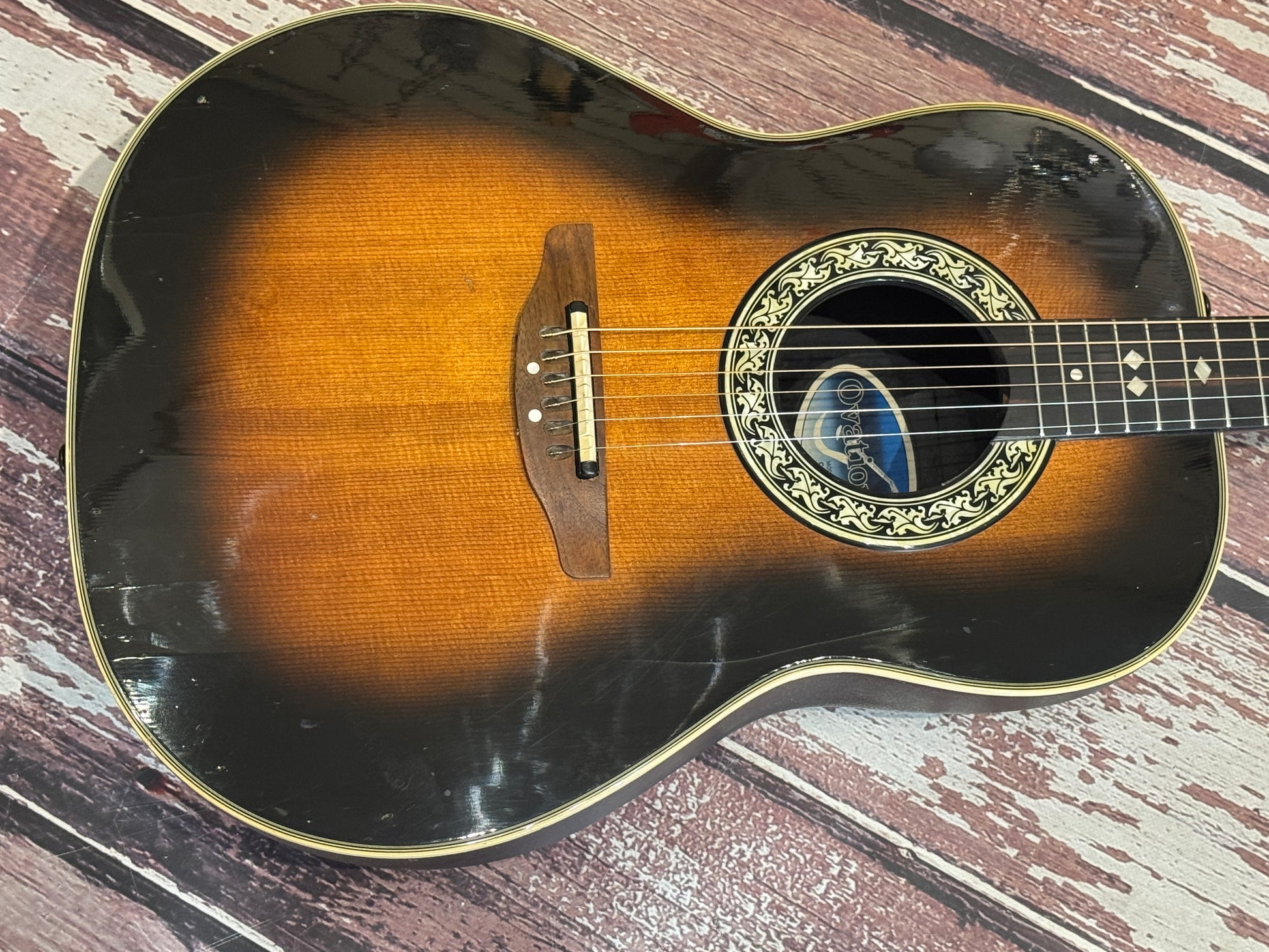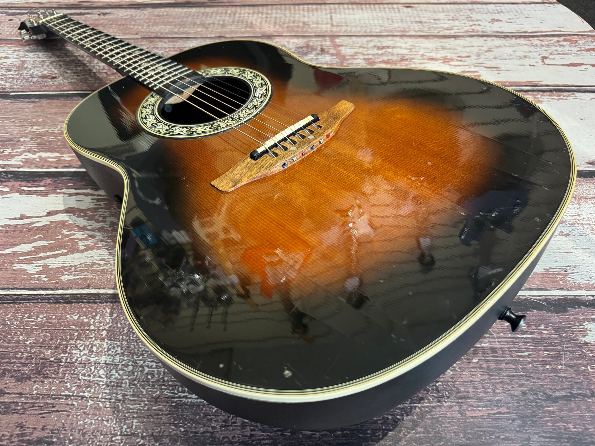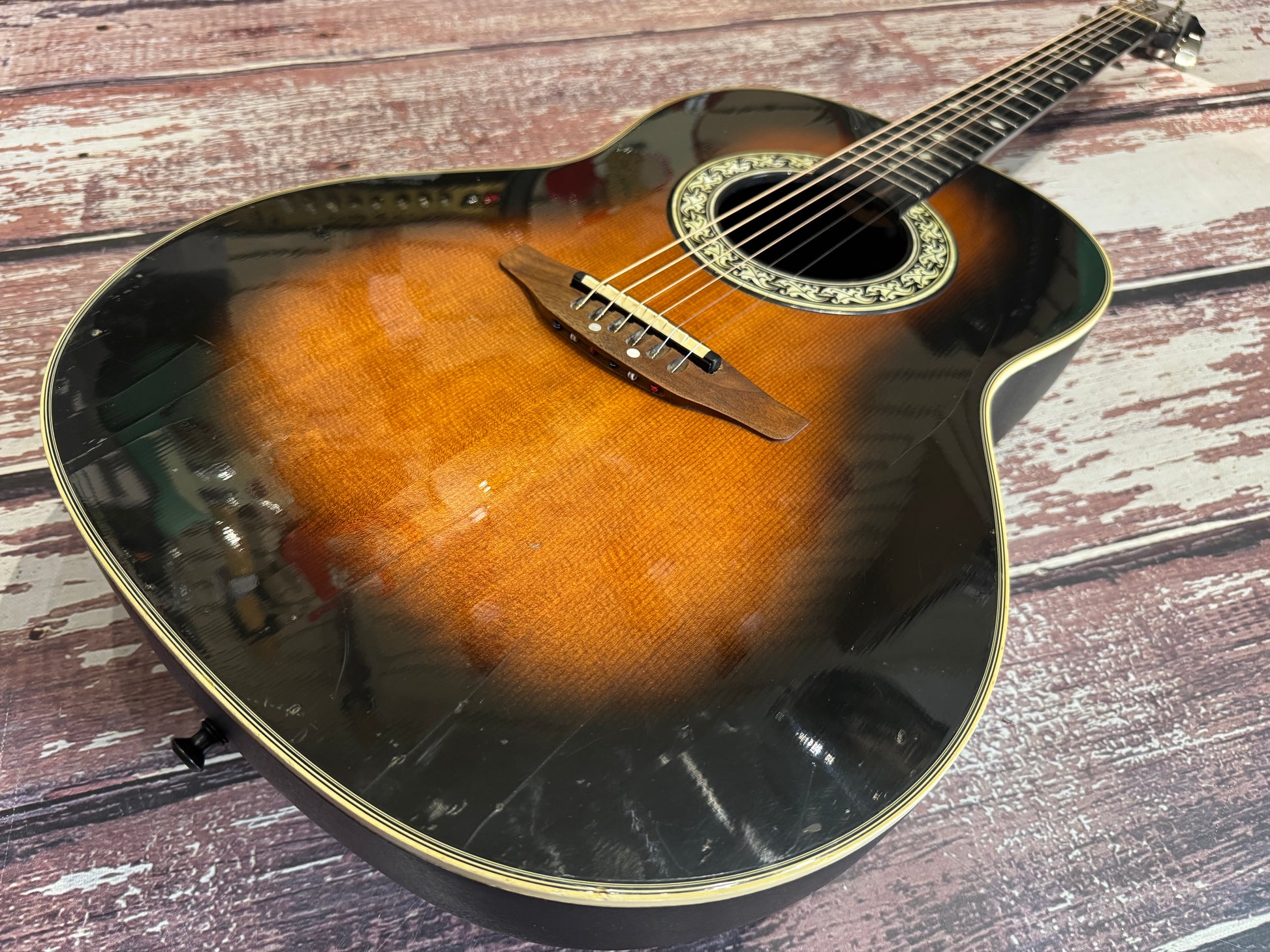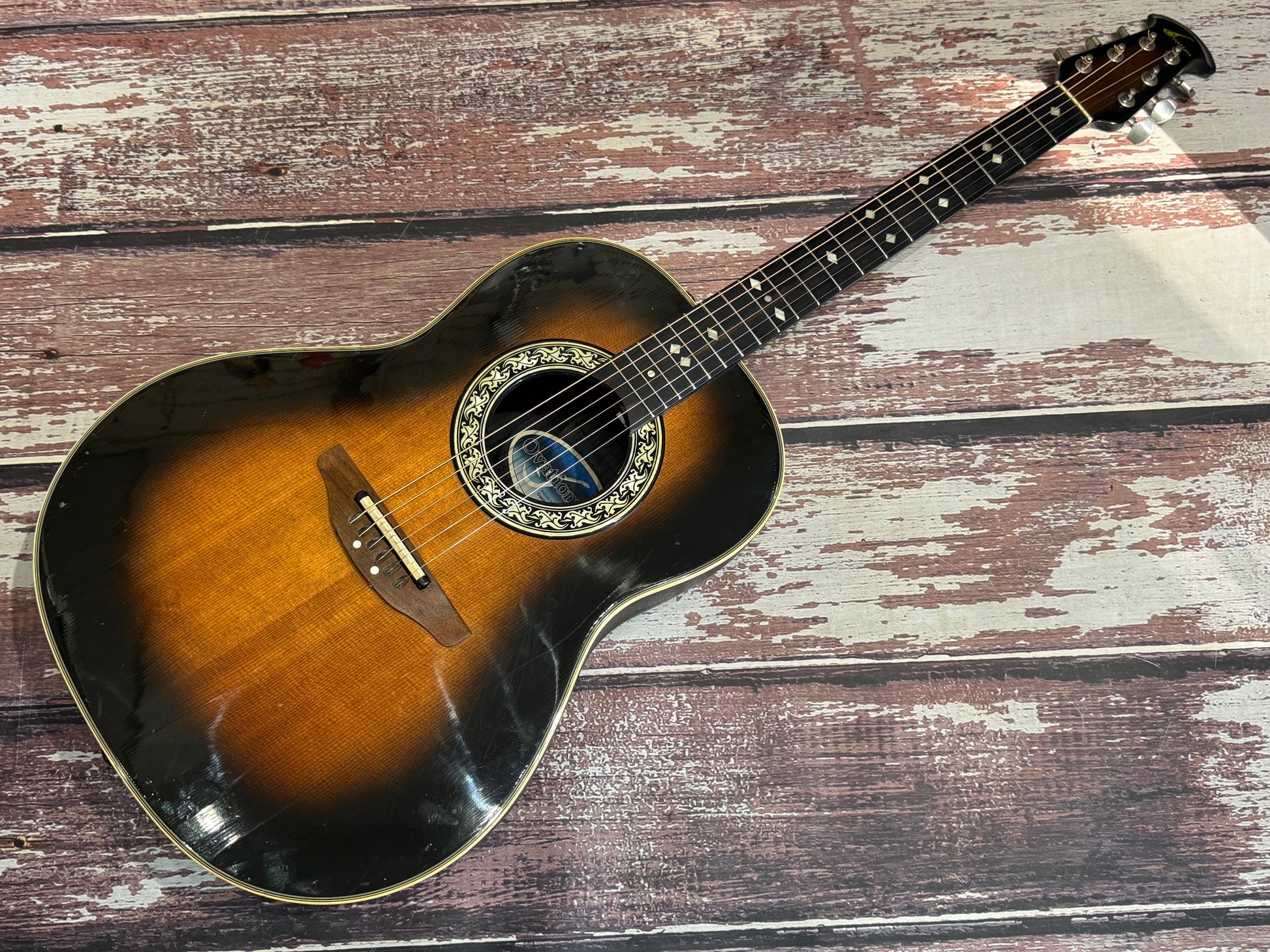 Wow, I recall when these cost more than a house! This is a deep bowl custom balladeer, and this one is a real work horse, as you can see it has been played and played, it carries the many badges of honour in the form of dings and scuffs all over...some may say "patina". It is worn, make no mistake, but it plays well, the electrics are all working and it is a great functioning USA Ovation with mojo!