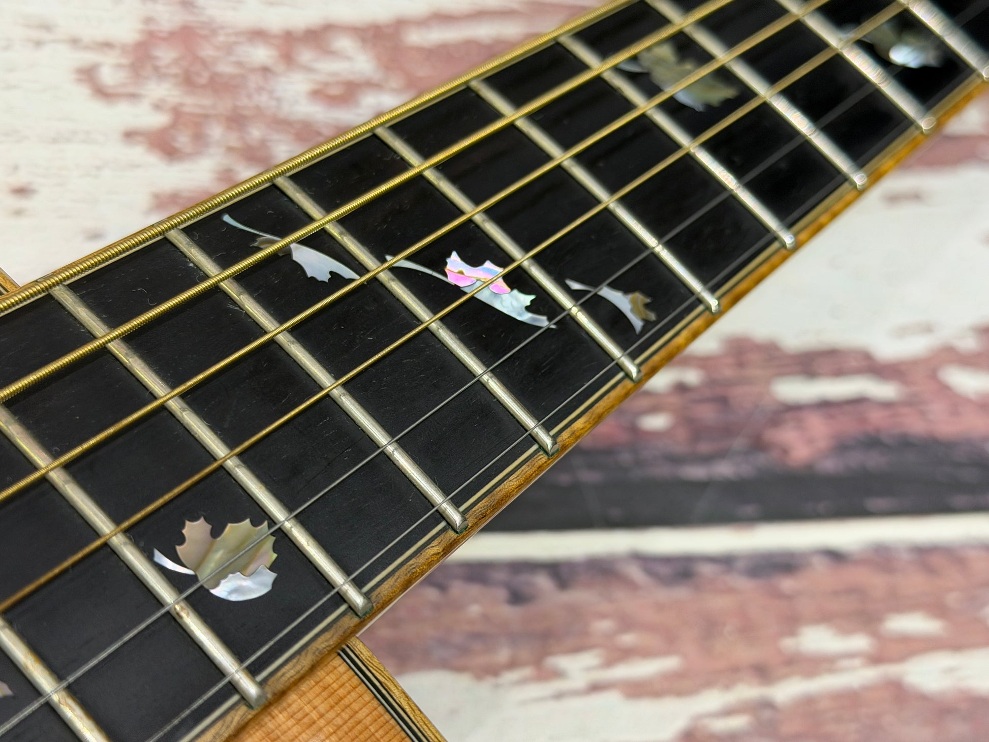 These special guitars are handmade in the United Kingdom, and features an ebony fingerboard, with beautiful falling leaves inlays. The finish is nitro.