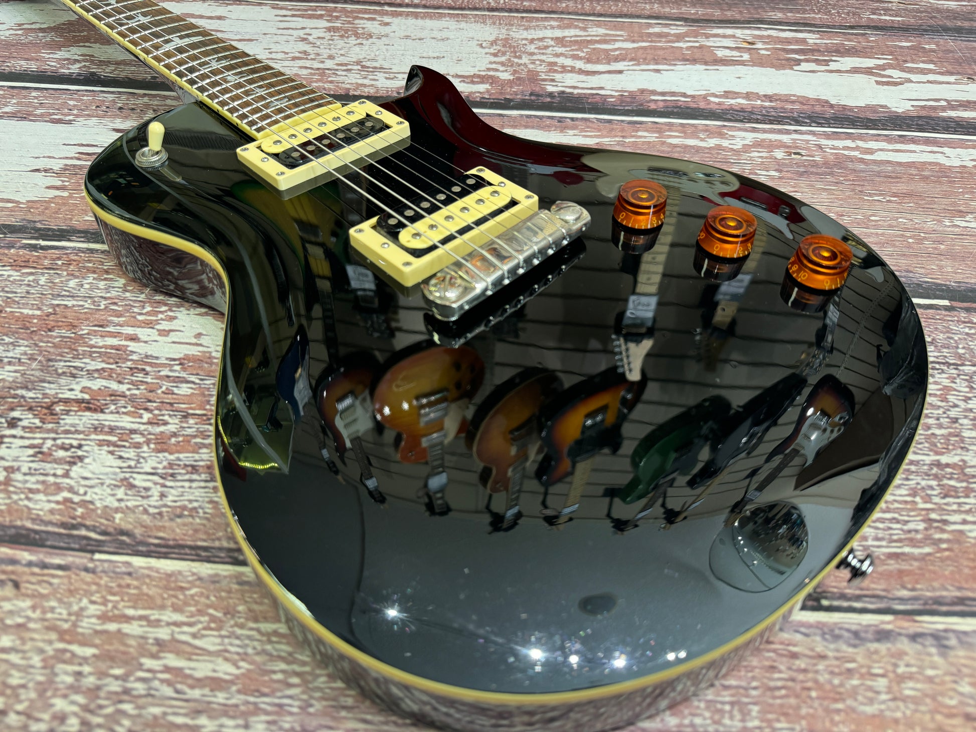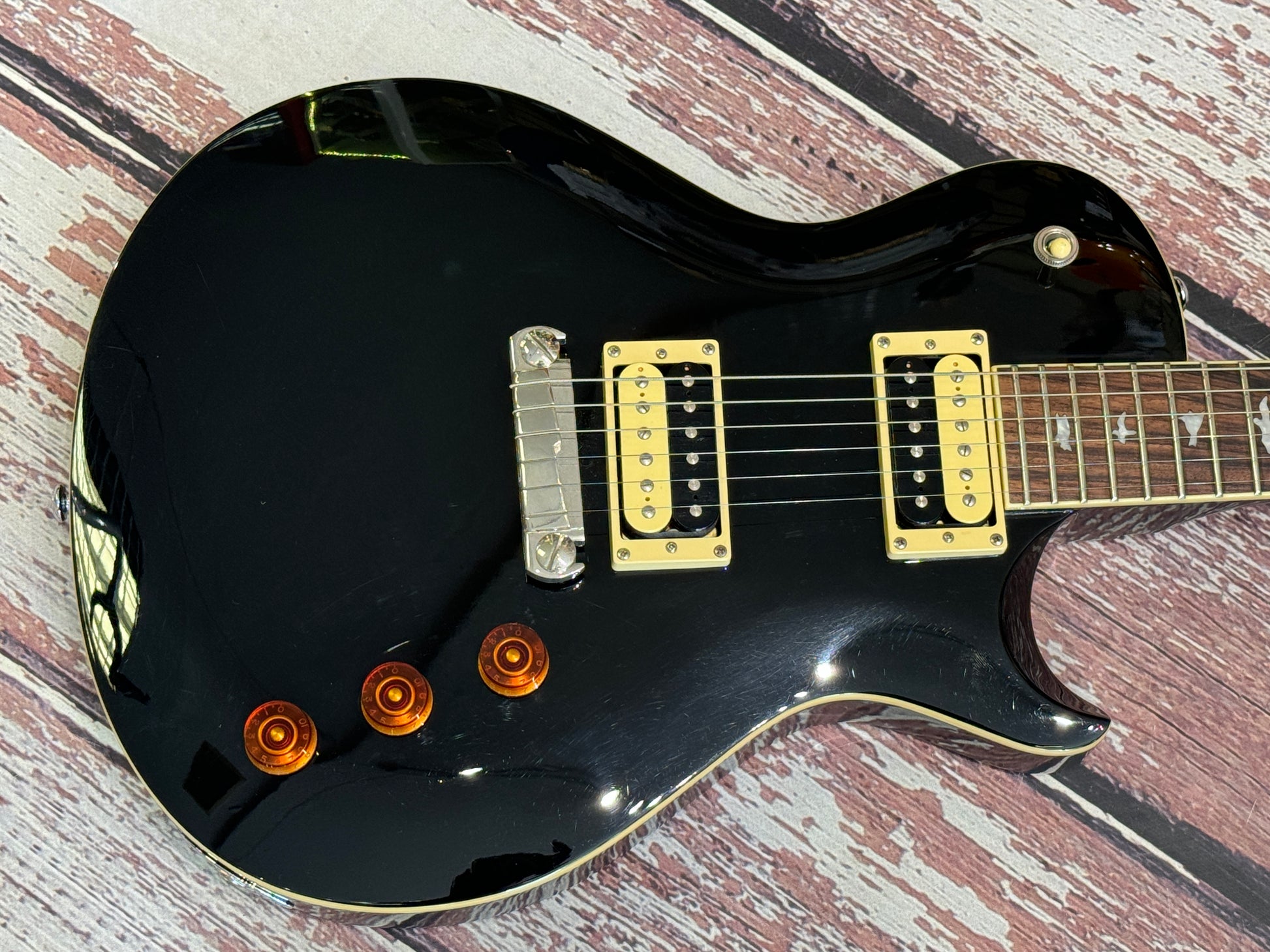 If you hanker after the Les Paul tonal range, but don't want a Les Paul, this is a very nice option! A classic single cutaway, twin humbucker guitar in timeless black with cream binding, bird inlays, zebra pickups and the quality we have come to expect from Korean made guitars.