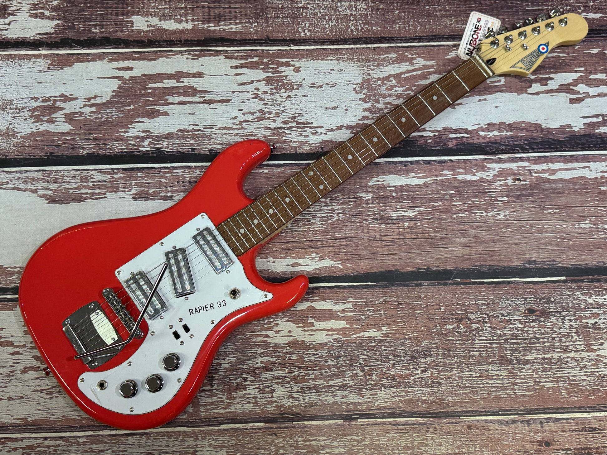 The original Rapier 33, instantly recognisable with its forward slanted middle pickup, was the solid bodied electric that played a major role in the industry of British guitars. This legendary guitar served countless up and coming 60’s British Beat groups and helped launch the careers of many guitarists in the 60's and 70's.