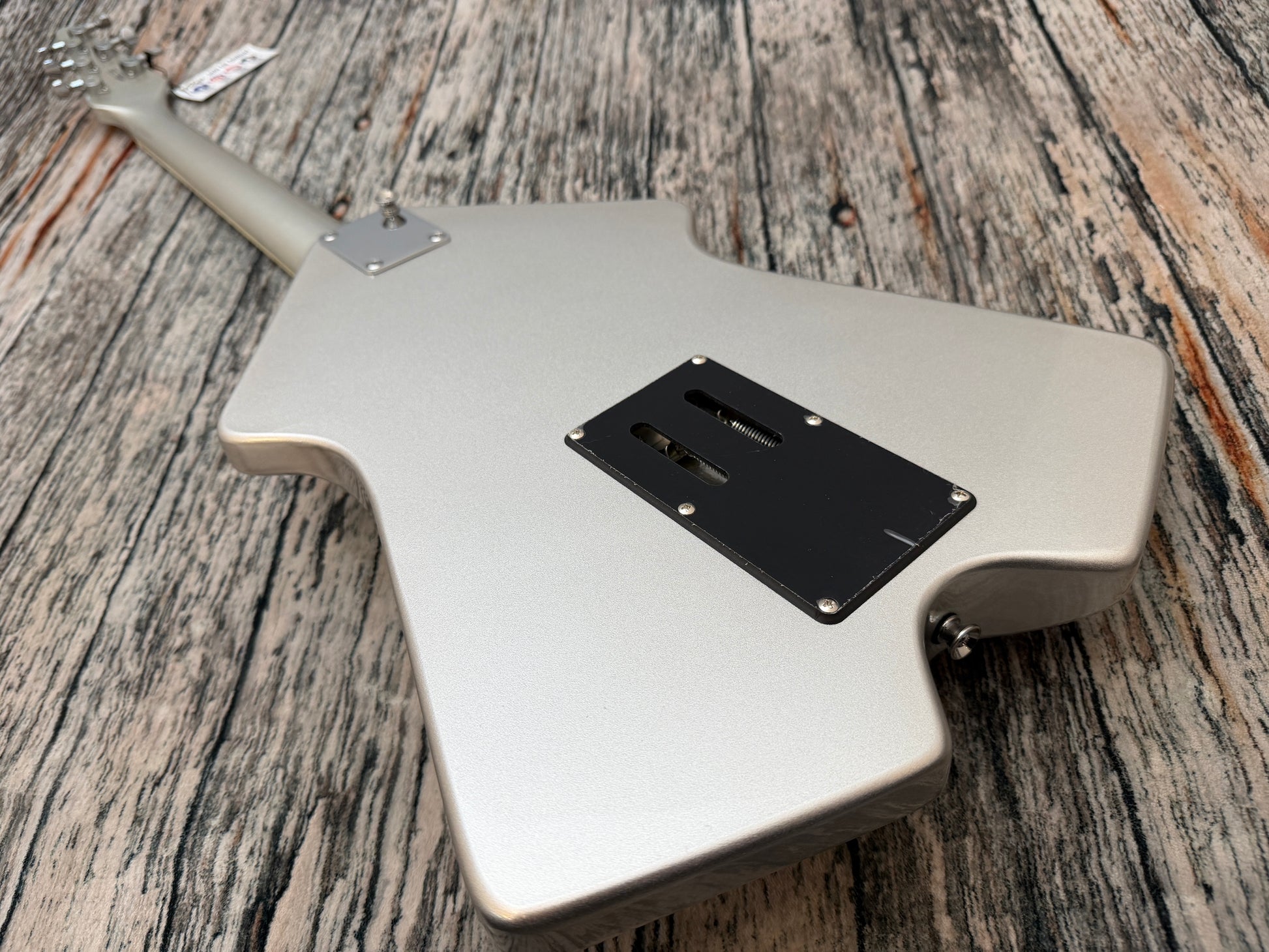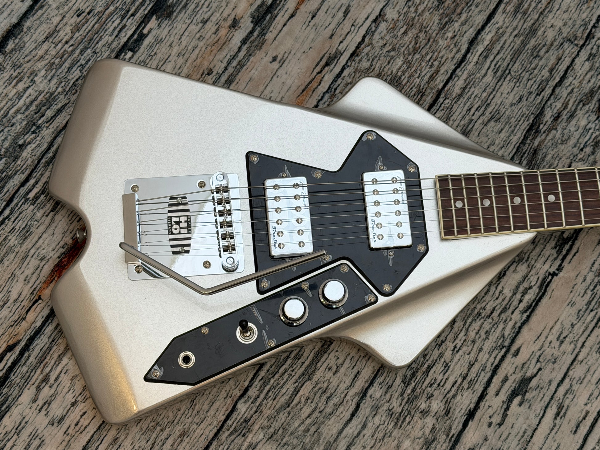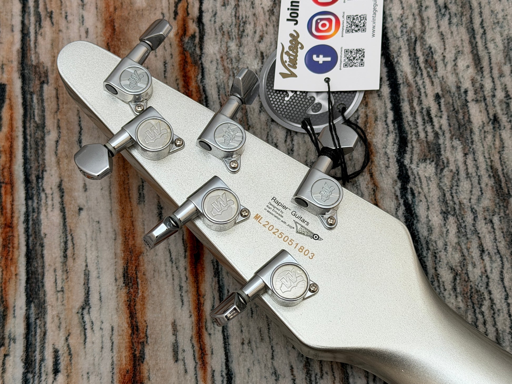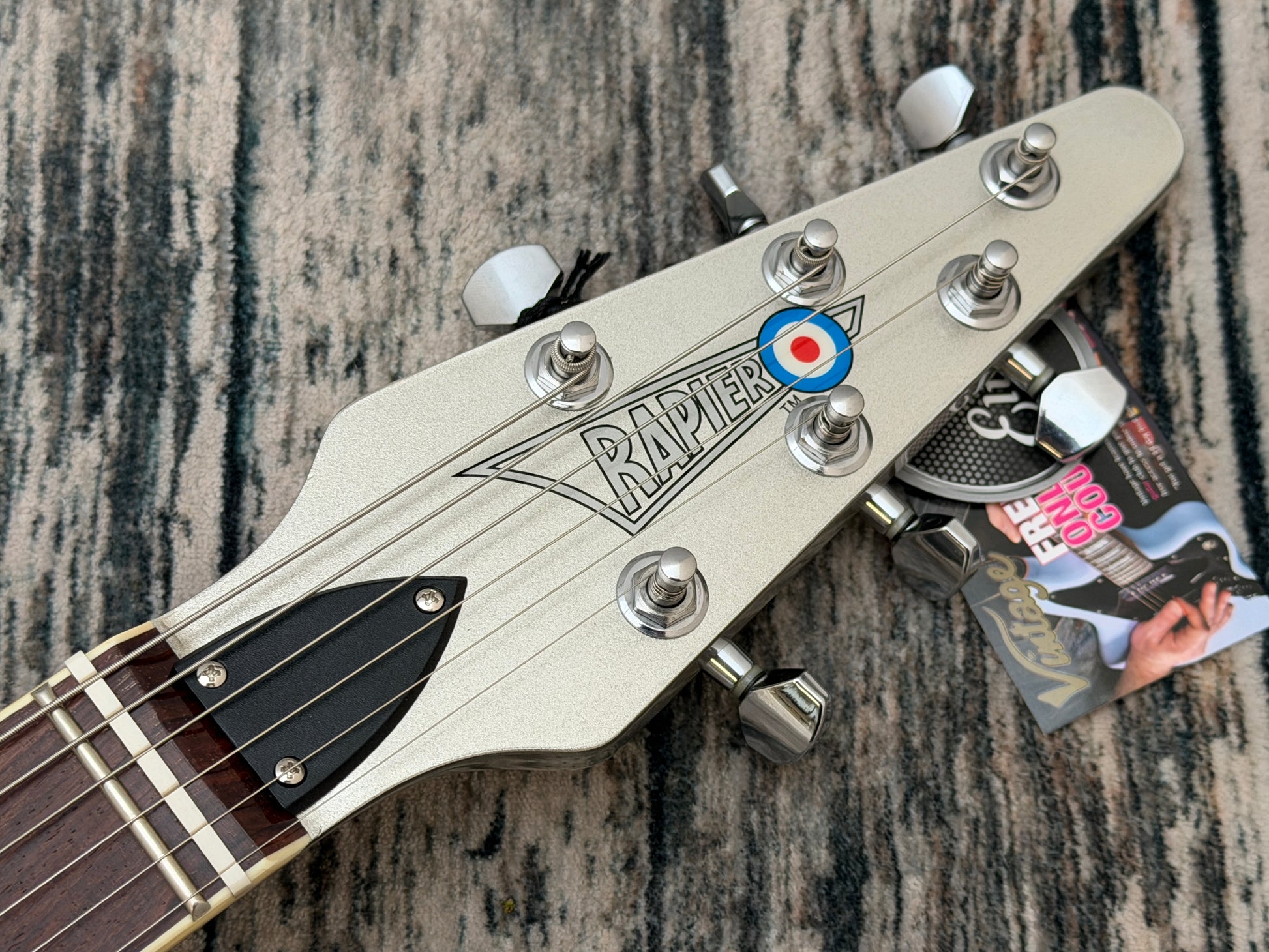 With its distinctive symmetrical, swept-wing okoume body, neck and angled headstock, all finished in a striking metallic silver, offset with a single ply black scratchplate and chrome hardware, the Rapier Rocket looks unquestionably cool.