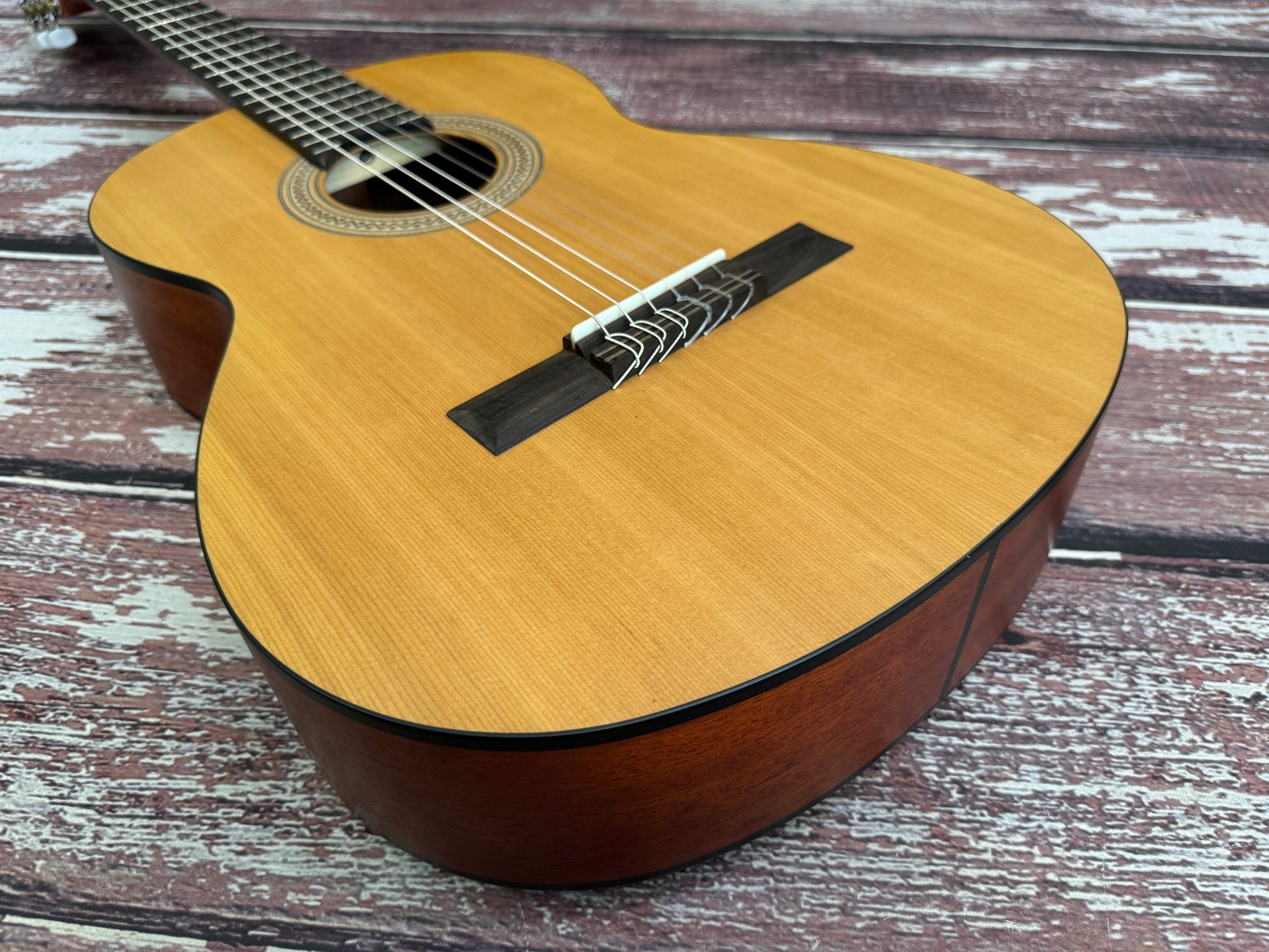 Sapele is the tonewood choice for the body, with tonal characteristics leaning towards mahogany, whilst due to its hardness, is a little brighter in the sonic spectrum. Combining this with the naturally warm, gorgeous mellow sound of the sold cedar sound board, the Estuduiante classic has a versatility and exceptional performance that’s ideal for both classical and flamenco styles.