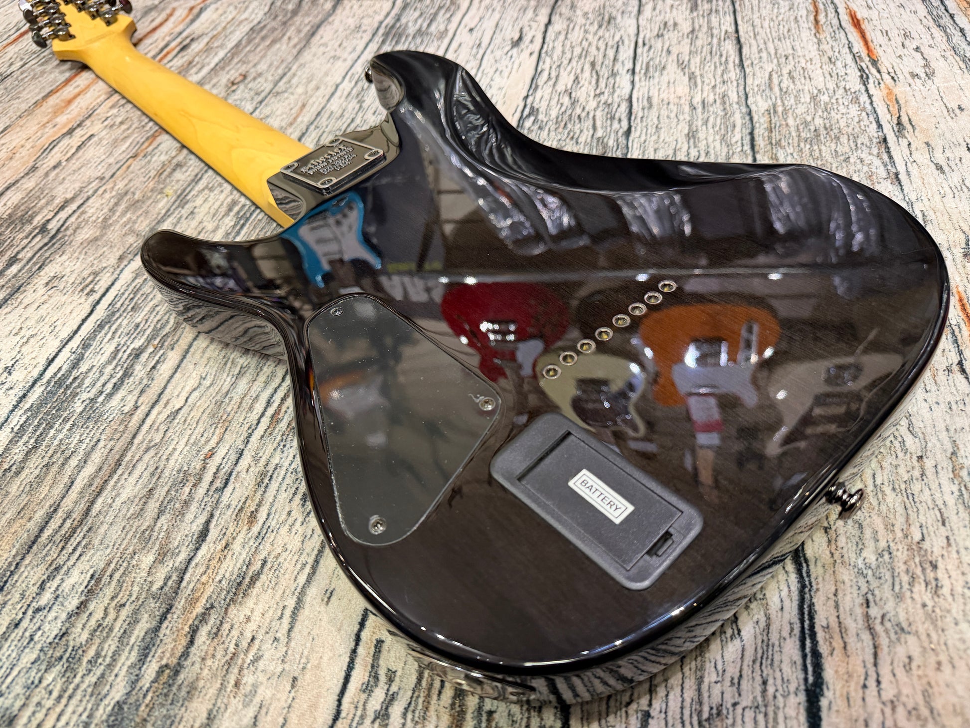 The Schecter Damien Elite-8 is an aggressive 8-string metal guitar featuring a Mahogany body with a Flamed Maple top, a 3-piece Maple neck with a Rosewood fretboard, 24 X-Jumbo frets, and a 26.5" scale length, and powered by active EMG 808 pickups for high-output tones. You get Grover tuners and a hardtail bridge for tuning stability, ideal for low tunings and extended range playing.