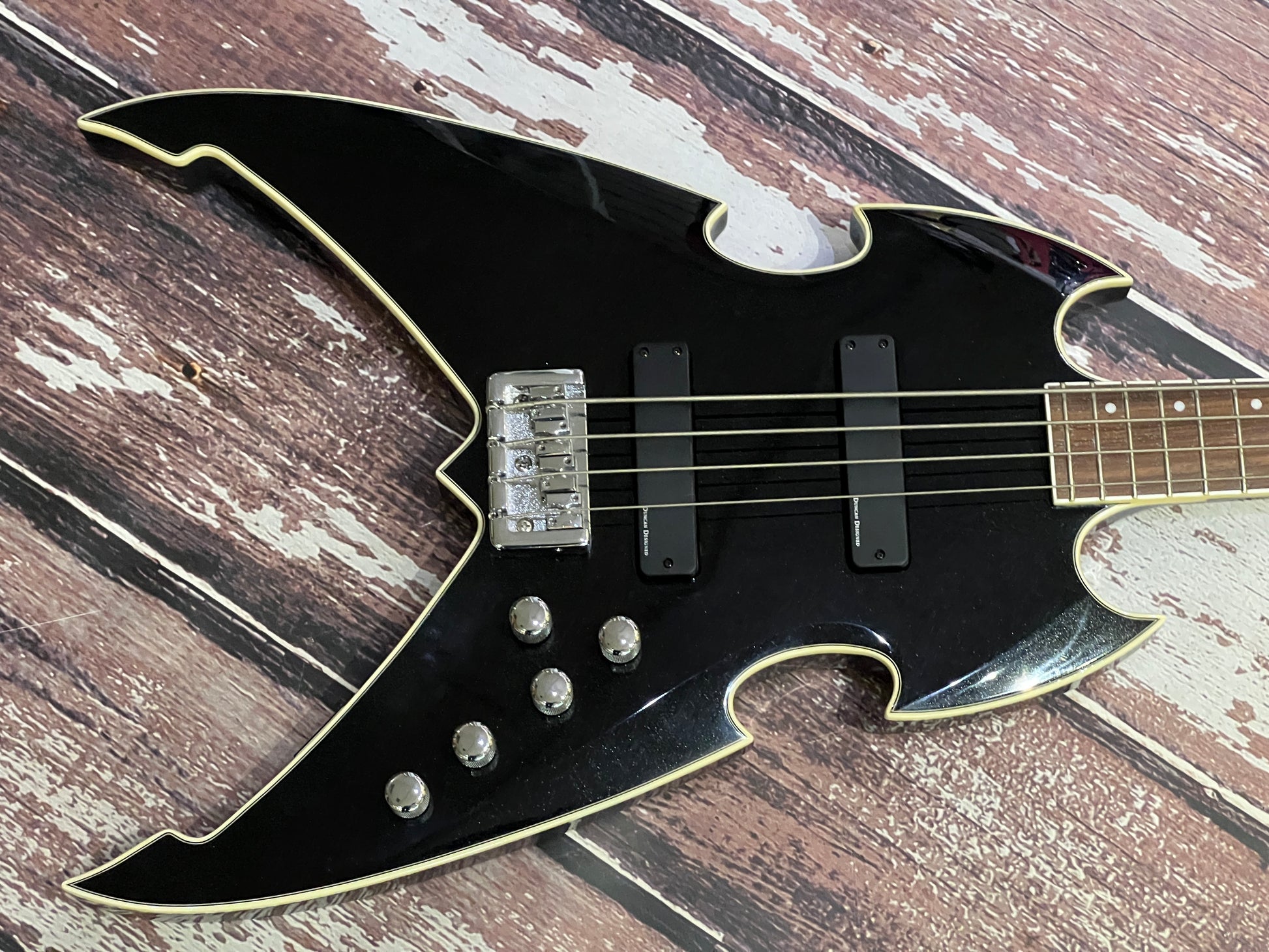 Kiss were never understated were they! This is the signature bass from Silvertone, a wild "out there" flying V, loaded with a setting of might humbuckers and plenty of attitude.