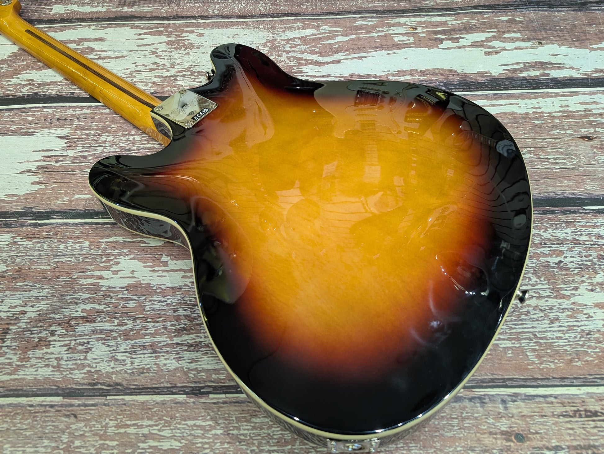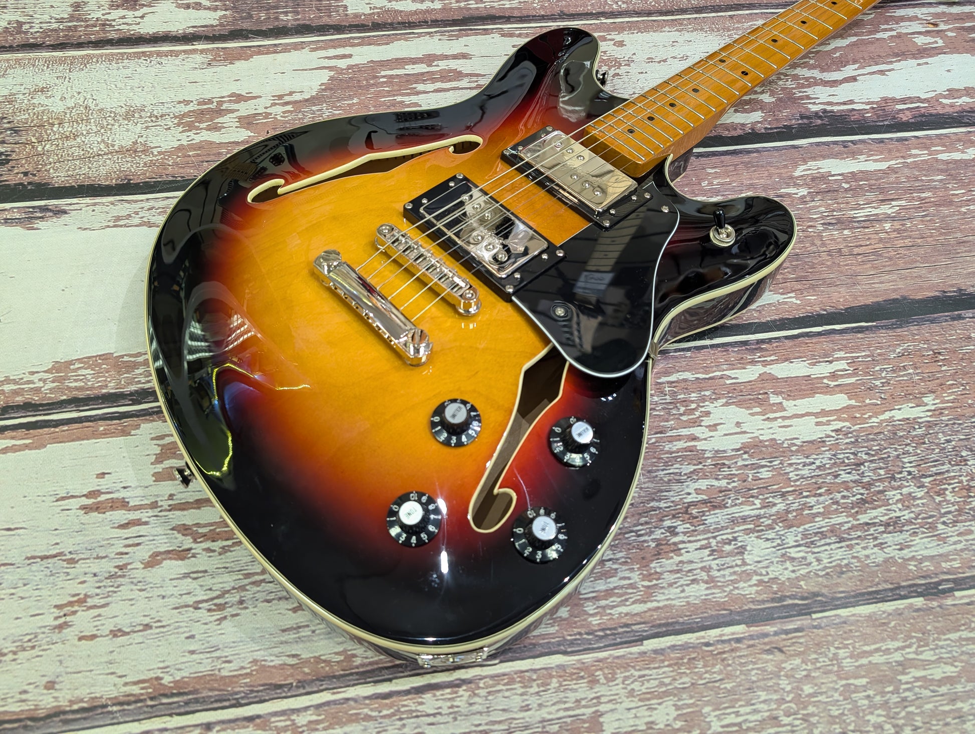 The maple neck is noticeably quite skinny, coupled with a sub 2mm action makes it a breeze to play. It's in rather excellent condition, having had only very light home use throughout its life. The twin wide-range style humbuckers and semi-hollow body make this a departure from your average F-style model, but it still has the bite and jangle you'd hope for. Popping a nice set of handwound pickups in here would make this a truly world-class machine, but it's still great without any more modding needed.