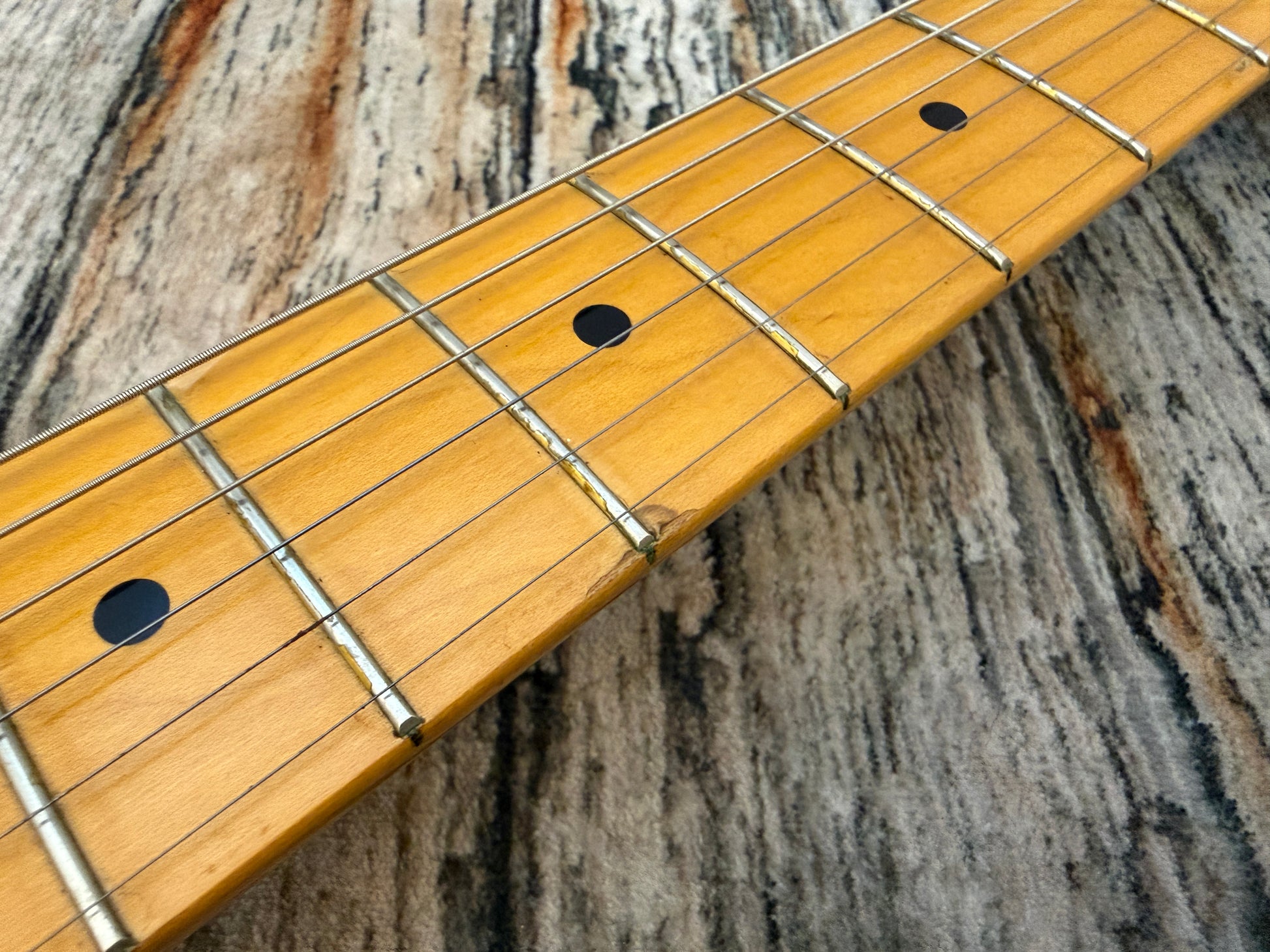 There are a couple of small dings on the top of this one, a small mark on the lacquer on the board at the edge of the 5th fret area, shown in the pictures, but next to no play wear, frets are perfect and it is all original.